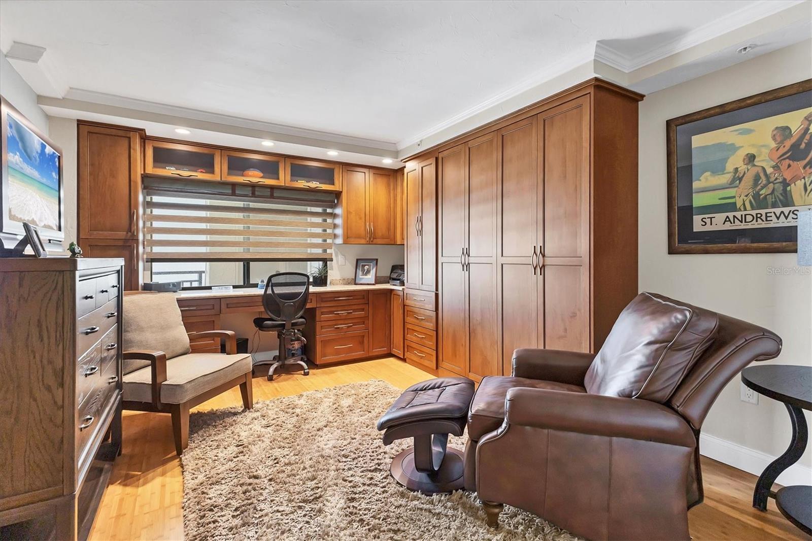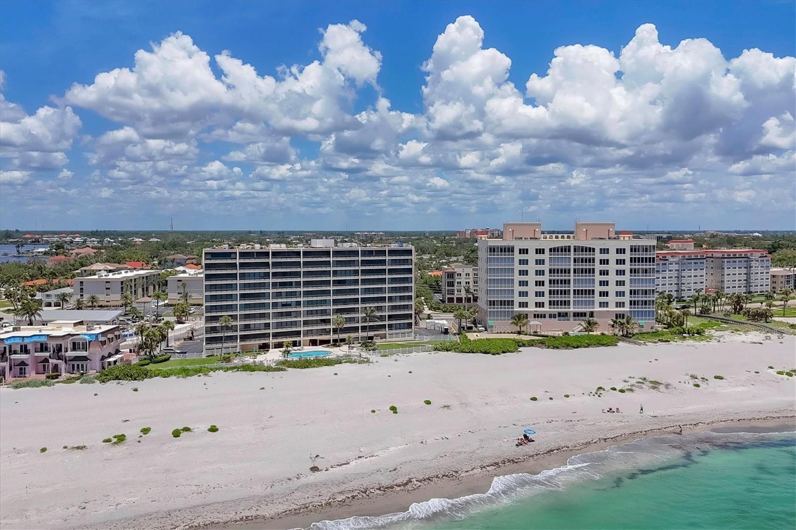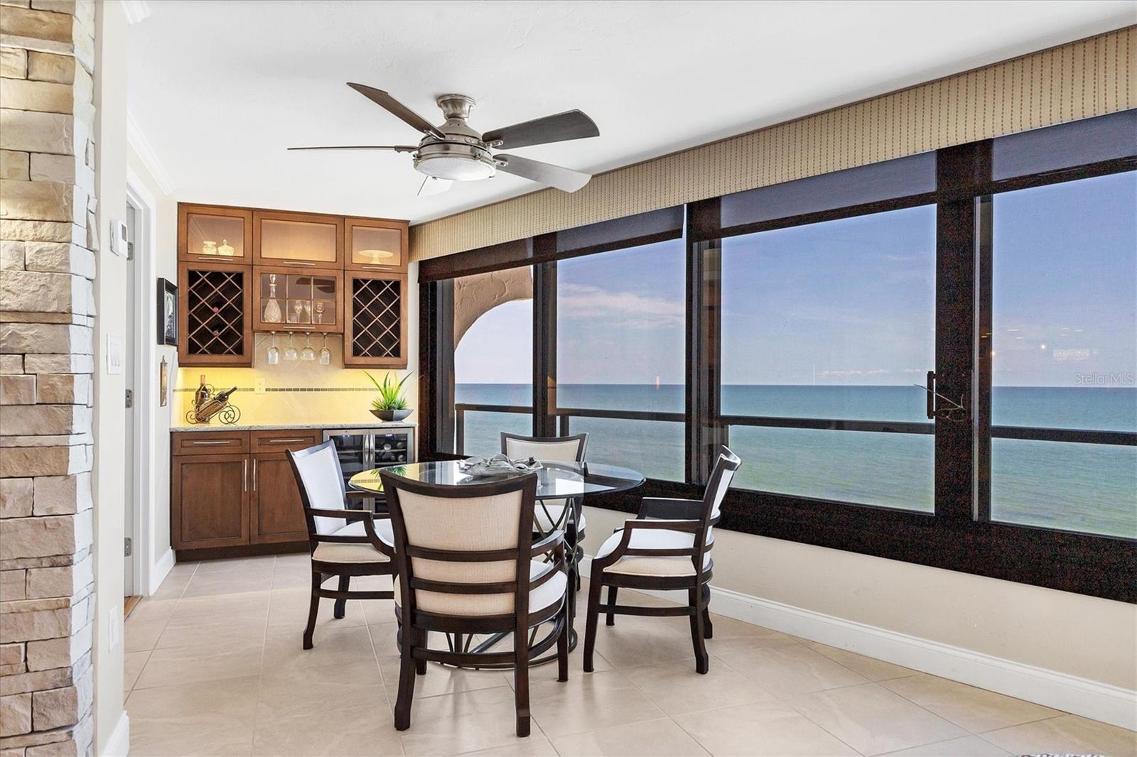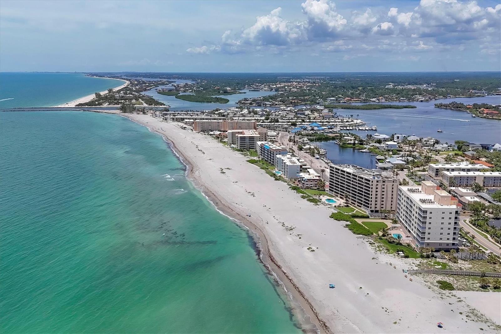 This exceptional, turn-key furnished (with some exclusions) 8th-floor condo in the highly sought-after Sansovino on Venice Island is a true standout. Completely taken down to the studs and reimagined with the expertise of a professional architect and interior designer, this residence offers a rare blend of coastal charm and upscale sophistication. With sweeping 180-degree views of the Gulf and Venice Beach, every corner reflects quality craftsmanship and thoughtful customization. Upon entry, the stacked-stone feature wall in the foyer sets the tone for the elegant updates throughout. The gourmet kitchen impresses with GE Profile appliances, soft-close hardwood cabinetry, neutral granite countertops, a glass-tiled backsplash, and pendant lighting that adds a coastal flair. Adjacent is a well-appointed laundry room with full-sized Electrolux washer and dryer, and additional cabinetry and counter space. The kitchen and foyer share beautiful 24” x 12” neutral tile flooring. The spacious living and dining areas are defined by stunning architectural details—coffered ceilings, a gorgeous lighted Media/Entertainment cabinet, bamboo flooring, dramatic stone-accent walls with attractive sconces, and a chandelier that elevates the space. The living room flows seamlessly into the expansive lanai which offers unmatched views and an entertainer’s dream setting. The lanai is outfitted with motorized window shades, two ceiling fans, a beautiful, built-in, granite-topped bar with wine/beer fridge, and an oh-so-comfortable sofabed that sleeps two. The Primary Suite features elegant bamboo flooring, a coffered ceiling with fan, and glass French doors that open to the lanai, revealing stunning Gulf views. The King-sized bed is actually a split king configuration, comprised of two twin articulating beds—each with independent head and foot adjustments to provide customized, ergonomic comfort. Two beautifully appointed walk-in closets with custom wood organizers and a spa-inspired en-suite bath, showcasing a granite double vanity with under-cabinet lighting, a glass-enclosed shower with natural stone flooring, and decorative tile accents, complete the primary retreat. The Guest Bedroom doubles as a spacious office, with a Queen-sized Murphy bed; custom built-in lighted cabinetry; and elegant touches throughout. The Guest Bath continues the theme of understated luxury with granite surfaces, pebbled shower floor, and elegant tile. Additional enhancements include solid wood five-panel interior doors with premium hardware, recessed lighting throughout, superior mattresses on all bedding, a separate shed/storage unit, and a whole-condo water filtration system. Sansovino offers secure building access with two elevators, a newly renovated Club Room, updated walkways and railings, and soon-to-be-completed new roof. Residents also enjoy a heated outdoor pool, private beach access, barbecue area, and a vibrant clubhouse for social gatherings. Minutes to downtown Venice, Crow’s Nest, and the Yacht Club—this remarkable home is truly one-of-a-kind. ***The Structural Integrity Reserve Study (SIRS) AND the Milestone Inspection (Structural Assessment) are done. Sansovino is in great condition, both financially and physically!***