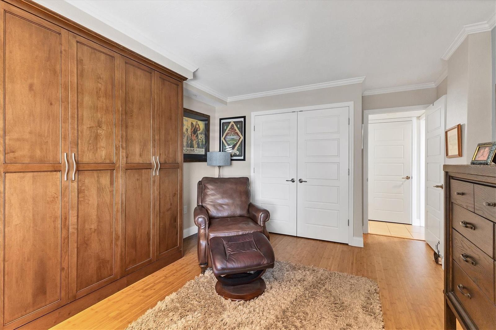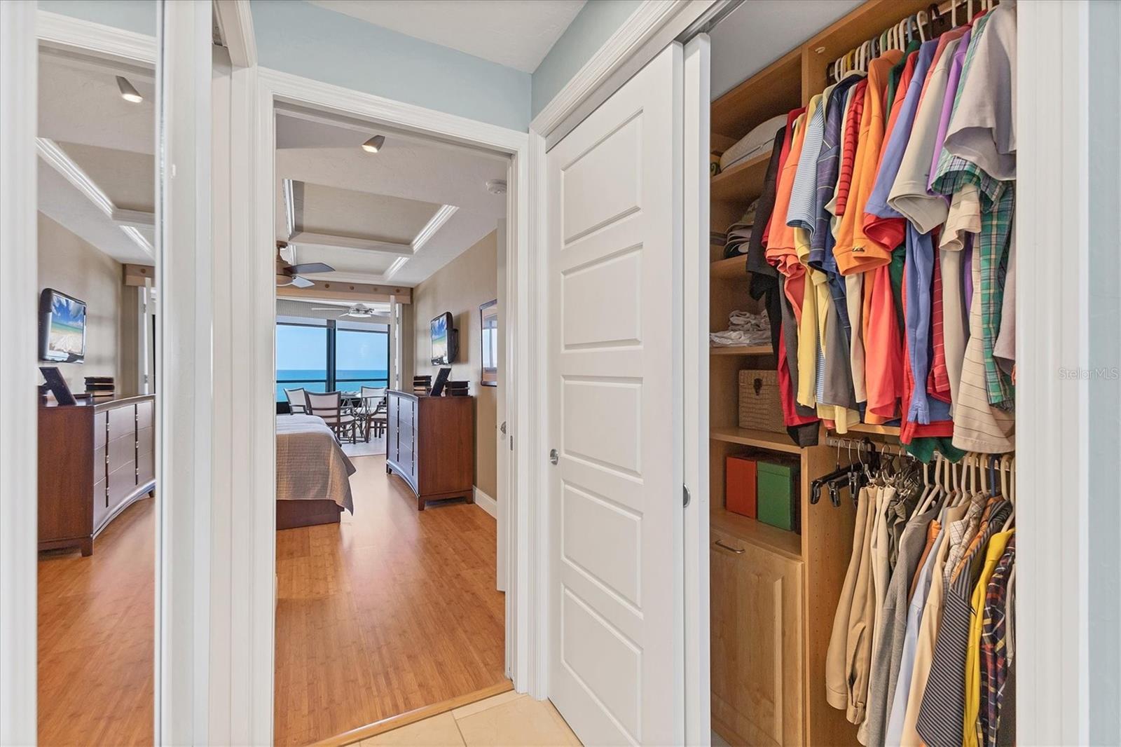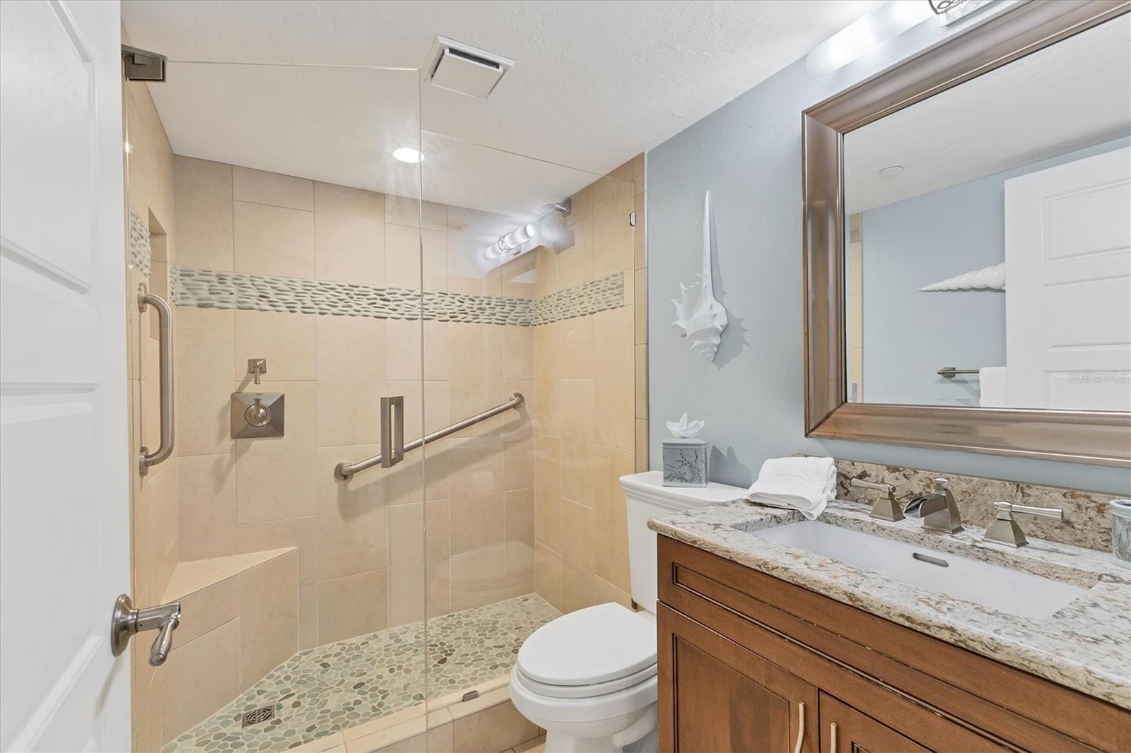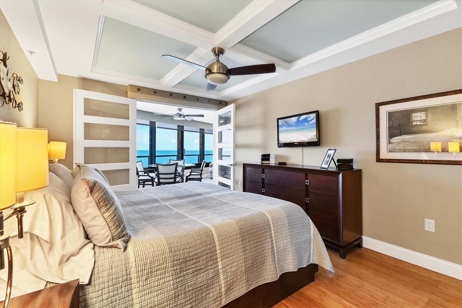 This exceptional, turn-key furnished (with some exclusions) 8th-floor condo in the highly sought-after Sansovino on Venice Island is a true standout. Completely taken down to the studs and reimagined with the expertise of a professional architect and interior designer, this residence offers a rare blend of coastal charm and upscale sophistication. With sweeping 180-degree views of the Gulf and Venice Beach, every corner reflects quality craftsmanship and thoughtful customization. Upon entry, the stacked-stone feature wall in the foyer sets the tone for the elegant updates throughout. The gourmet kitchen impresses with GE Profile appliances, soft-close hardwood cabinetry, neutral granite countertops, a glass-tiled backsplash, and pendant lighting that adds a coastal flair. Adjacent is a well-appointed laundry room with full-sized Electrolux washer and dryer, and additional cabinetry and counter space. The kitchen and foyer share beautiful 24” x 12” neutral tile flooring. The spacious living and dining areas are defined by stunning architectural details—coffered ceilings, a gorgeous lighted Media/Entertainment cabinet, bamboo flooring, dramatic stone-accent walls with attractive sconces, and a chandelier that elevates the space. The living room flows seamlessly into the expansive lanai which offers unmatched views and an entertainer’s dream setting. The lanai is outfitted with motorized window shades, two ceiling fans, a beautiful, built-in, granite-topped bar with wine/beer fridge, and an oh-so-comfortable sofabed that sleeps two. The Primary Suite features elegant bamboo flooring, a coffered ceiling with fan, and glass French doors that open to the lanai, revealing stunning Gulf views. The King-sized bed is actually a split king configuration, comprised of two twin articulating beds—each with independent head and foot adjustments to provide customized, ergonomic comfort. Two beautifully appointed walk-in closets with custom wood organizers and a spa-inspired en-suite bath, showcasing a granite double vanity with under-cabinet lighting, a glass-enclosed shower with natural stone flooring, and decorative tile accents, complete the primary retreat. The Guest Bedroom doubles as a spacious office, with a Queen-sized Murphy bed; custom built-in lighted cabinetry; and elegant touches throughout. The Guest Bath continues the theme of understated luxury with granite surfaces, pebbled shower floor, and elegant tile. Additional enhancements include solid wood five-panel interior doors with premium hardware, recessed lighting throughout, superior mattresses on all bedding, a separate shed/storage unit, and a whole-condo water filtration system. Sansovino offers secure building access with two elevators, a newly renovated Club Room, updated walkways and railings, and soon-to-be-completed new roof. Residents also enjoy a heated outdoor pool, private beach access, barbecue area, and a vibrant clubhouse for social gatherings. Minutes to downtown Venice, Crow’s Nest, and the Yacht Club—this remarkable home is truly one-of-a-kind. ***The Structural Integrity Reserve Study (SIRS) AND the Milestone Inspection (Structural Assessment) are done. Sansovino is in great condition, both financially and physically!***