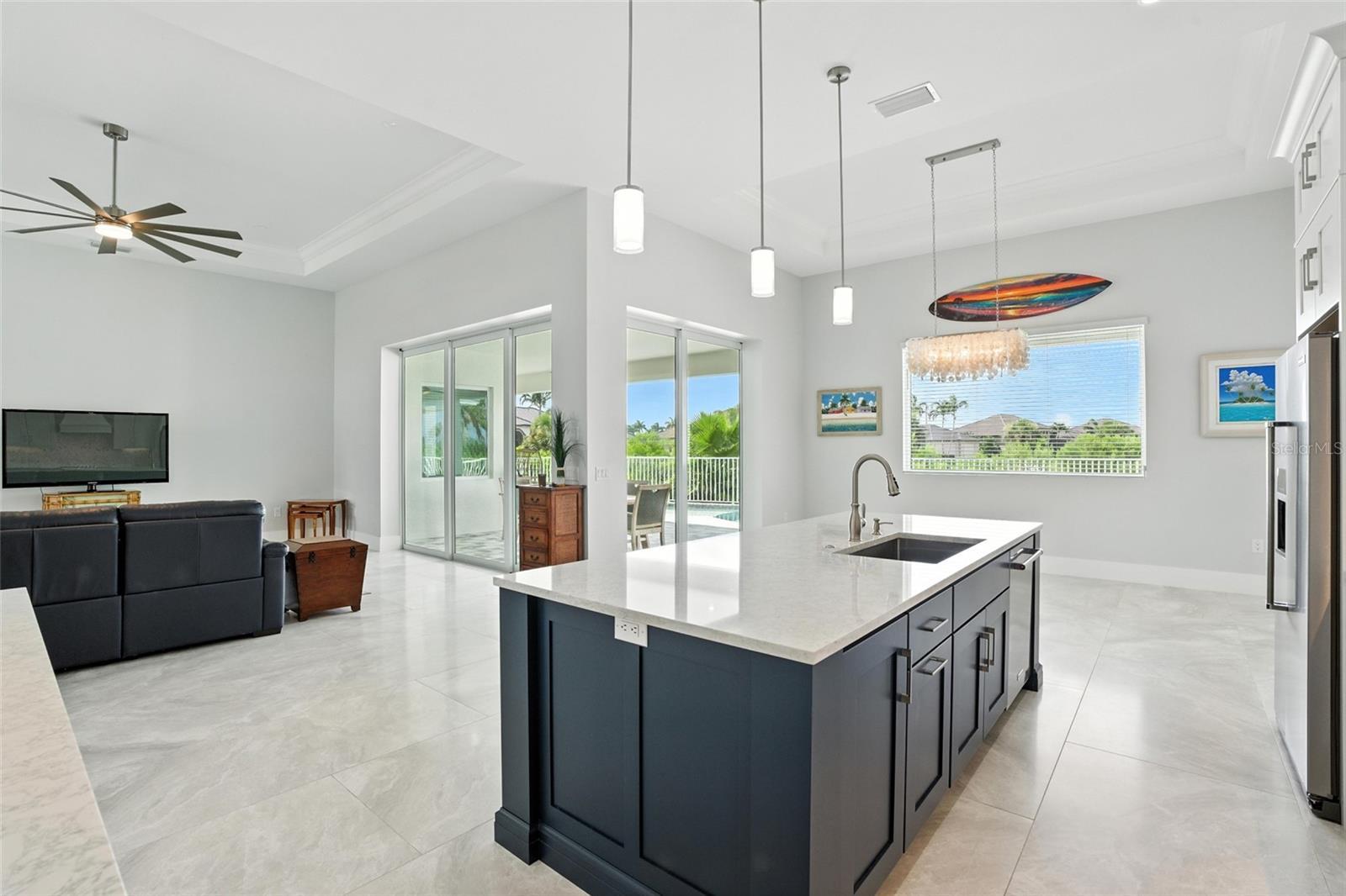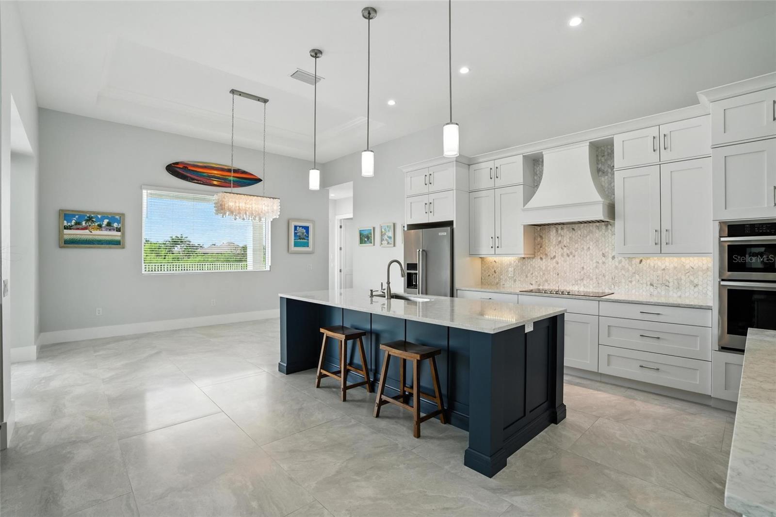 Experience the perfect blend of luxury and wellness living in this custom-designed Cape Royal estate, where every detail supports beauty, comfort, and peace of mind.** From the moment you step through the grand 14-foot entryway with transom windows and 7-inch base moldings, you'll feel the thoughtful craftsmanship that defines this one-of-a-kind home. Designed for elegant entertaining, the heart of the home features soaring 12-foot ceilings, a gourmet kitchen with Cambria quartz countertops, a Carrera marble backsplash, and top-tier KitchenAid appliances—including a cooktop and Samsung ceramic double oven. Custom Crystal cabinetry throughout the home is not only stunning but eco-conscious: crafted with no added formaldehyde and low-VOC finishes. A built-in mixer station, roll-out drawers, and pantry provide seamless organization. Adjacent, the dining room showcases a dramatic 13-foot tray ceiling and a Capiz shell chandelier, while triple pocketing sliders connect to the expansive lanai—blurring the line between indoor and outdoor living. The office, enclosed with opaque French doors, offers privacy and productivity with tinted hurricane-impact windows to reduce glare and noise. The primary suite is a true sanctuary with 12-foot tray ceilings, dual custom walk-in closets, and direct access to the pool. The spa-inspired bathroom features Cambria quartz, mother-of-pearl and marble tile, a soaking tub, and a dual raindrop shower illuminated by natural light. Step outside to your saltwater freeform pool with a sun shelf, glass tile accents, and views of Reflection Lake—Cape Royal’s only natural lake. Enjoy quietude and wildlife watching from the covered lanai with built-in storage, three ceiling fans, and no golfers behind you—just preserve views, peace, and privacy. Wellness is woven throughout: low-VOC Sherwin-Williams Cashmere paint, abundant natural light, impact-resistant PGT windows and sliders, and 30"x60" ceramic tile flooring enhance air quality and comfort. With fitness centers nearby and fresh produce just minutes away at Farmer Joe’s, healthy living has never been easier. The home also features a durable metal roof, six-zone irrigation system, 12-foot garage ceilings (thanks to stem wall construction), and solid-core 8-foot doors throughout. Located in unincorporated Lee County (no Cape Coral taxes, X flood zone—no flood insurance required), this home is backed by a Home-Tech one-year warranty. As part of Cape Royal, residents enjoy access to a 27-hole golf course, clubhouse, restaurant, tennis, pickleball, and a variety of social clubs—gardening, kayaking, arts, and more—making this more than a home… it’s a community that nurtures well-being and connection.