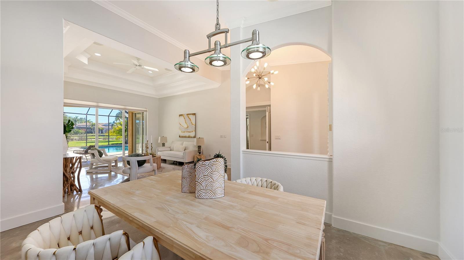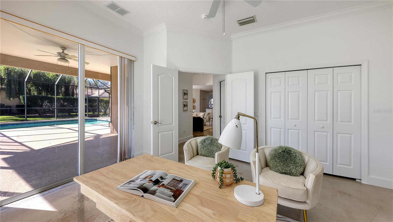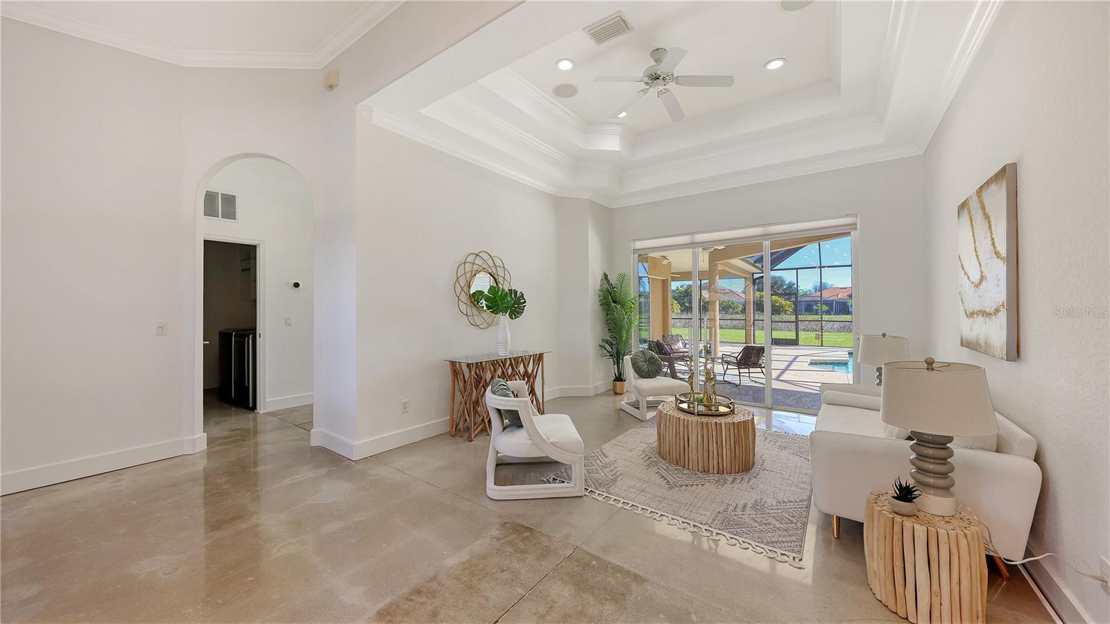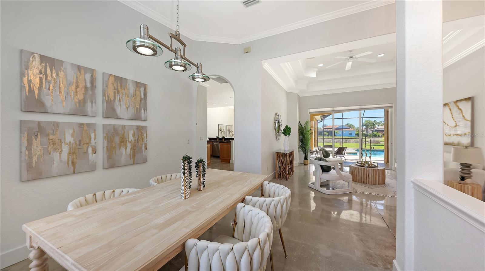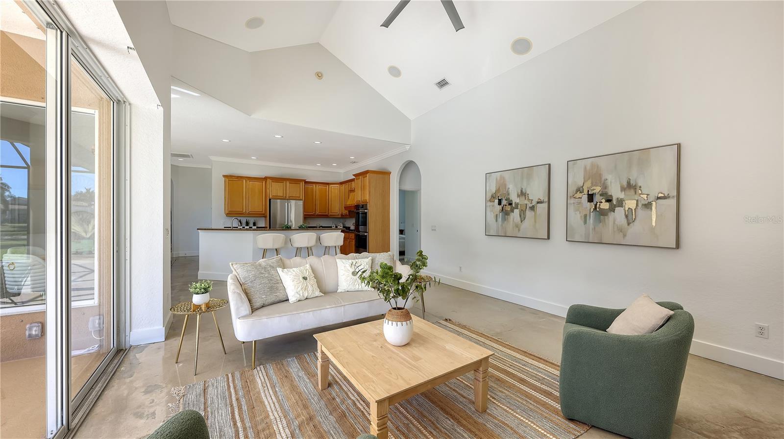 This beautifully maintained home offers the perfect blend of luxury, functionality, and Florida living at its finest. Situated on a large oversized lakefront lot, this spacious 4-bedroom, 3-bath residence features modern finishes and an open layout ideal for entertaining. The chef’s kitchen is a true showstopper, boasting brand-new Bosch appliances including a double oven, dishwasher, and refrigerator — all sleek, high-end, and energy-efficient. Concrete floors throughout the home provide a clean, contemporary aesthetic that’s both stylish and low-maintenance. Enjoy the private screened pool overlooking the peaceful lake and take advantage of the gas line already in place for your future outdoor kitchen—perfect for gatherings and sunset dinners. A 3-car garage provides ample storage and parking for your vehicles, golf cart, or workshop needs.