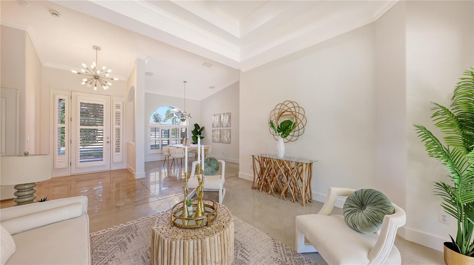 - Cathedral Ceiling(s), Ceiling Fans(s), Crown Molding, Eat-in Kitchen, High Ceilings, Open Floorplan, Solid Surface Counters, Split Bedroom, Tray Ceiling(s), Walk-In Closet(s), Window Treatments