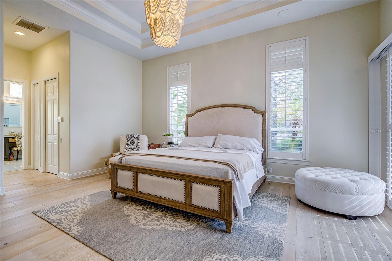 - Ceiling Fans(s), Coffered Ceiling(s), Crown Molding, Eat-in Kitchen, High Ceilings, Kitchen/Family Room Combo, Open Floorplan, Primary Bedroom Main Floor, Solid Wood Cabinets, Split Bedroom, Stone Counters, Tray Ceiling(s), Walk-In Closet(s), Window Treatments