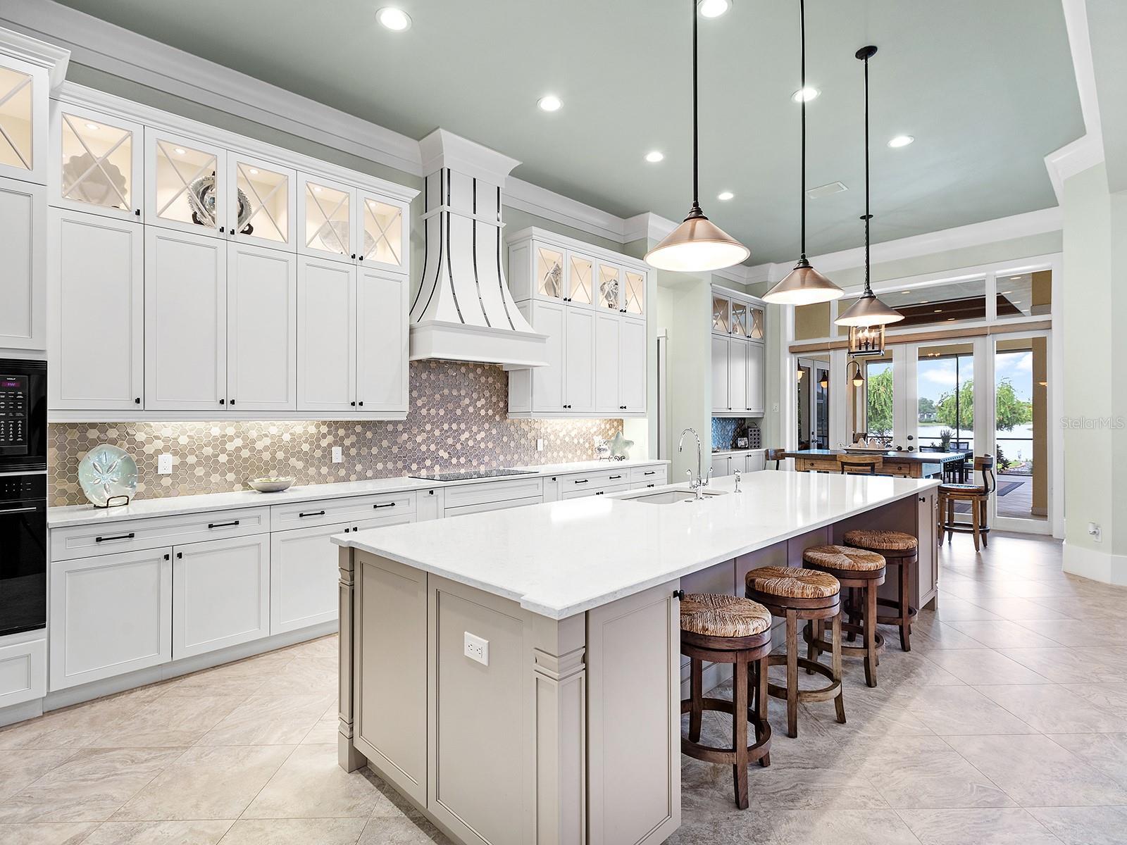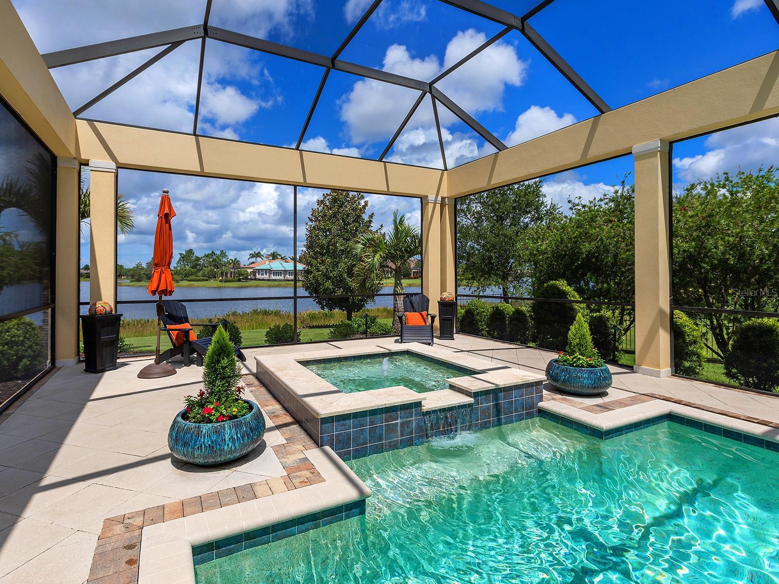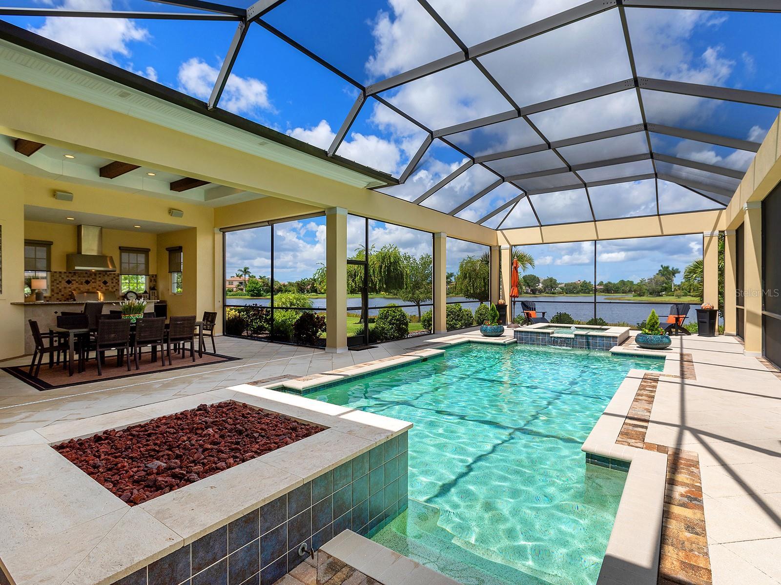 With stunning sunset views over the sparkling lake, this picture-perfect home in The Lake Club is truly a rare find in all of Lakewood Ranch! Built in 2016 is this completely custom home built by award-winning Nutter Custom Construction. Every detail in this residence has been meticulously selected for a luxurious yet functional lifestyle. Situated on 0.76 acres, this spacious lot affords you additional privacy, manicured landscaping, and over 80 feet of lakefront. In addition to the opulent upgrades inside, this home is outfitted with a rare METAL ROOF that offers up to 50 years of life, and IMPACT windows and doors throughout. From the spacious paver driveway surrounded by beautiful landscaping, you’re welcomed home to a charming front porch entry with Caribbean box railing and mahogany front door. The foyer invites you in with volume ceiling and custom painted wall to the open floor plan. The grand great room is truly the heart of the home and showcases vaulted ceilings with hand-stained wood beams, cozy electric fireplace, engineered hardwood flooring, custom built-in shelving, solar tubes for an abundance of natural light, and impact rated French doors to the lanai. Outdoors you’ll be immediately impressed with the western views of the lake, spacious gathering areas, custom ceilings, and colonnade screen enclosure. The heated pool and spa offers the ideal place to gather at one end around the gas firepit; or relax in the spa at the other end lakeside. Enjoy dinners alfresco from the outdoor kitchen expertly equipped with a Lynx grill, beverage refrigerator, and built-in ice chest cooler. Inside the chef will adore preparing meals in the gourmet kitchen complete with solid wood cabinetry including appliance bay and wine rack, quartz counters, central island with seating, and walk-in pantry with shelving. The high-end appliance suite includes a Jenn-Air paneled refrigerator, Wolf built-in microwave and wall oven, KitchenAid warming drawer, Miele dishwasher, and Bosch induction cooktop with flex bridge burners that make cooking a breeze. Dine in the formal dining room with designer chandelier, or in the casual dinette with built-in cabinetry. When you’re ready to end the day in relaxation, retreat to the primary suite with vaulted ceiling, dual custom walk-in closets, separate seating area, and private lanai with remote-controlled shades. Your primary bath is a sanctuary with dual split vanities, limestone tile, walk-in shower with bench, soaking tub, and private courtyard. Guests will enjoy their own luxe accommodations in the second primary bedroom with private en-suite bathroom and walk-in closet that is ideal for long-term guests or could be used as a bonus room; or the two additional guest bedrooms with walk-in closets and jack & jill bathroom. Rounding out this one-of-a-kind residence is a study with custom built-in shelving and desk, laundry room with plentiful storage, mudroom entry with 3 closets, and guest powder bathroom. Don’t forget about the oversized 3-car garage with fans to keep cool, custom storage cabinetry and workbench, and air-conditioned Florida basement perfect for storage. The Lake Club is an exclusive premier, gated community with a Grande Clubhouse, restaurant, pool, tennis, pickleball and more.