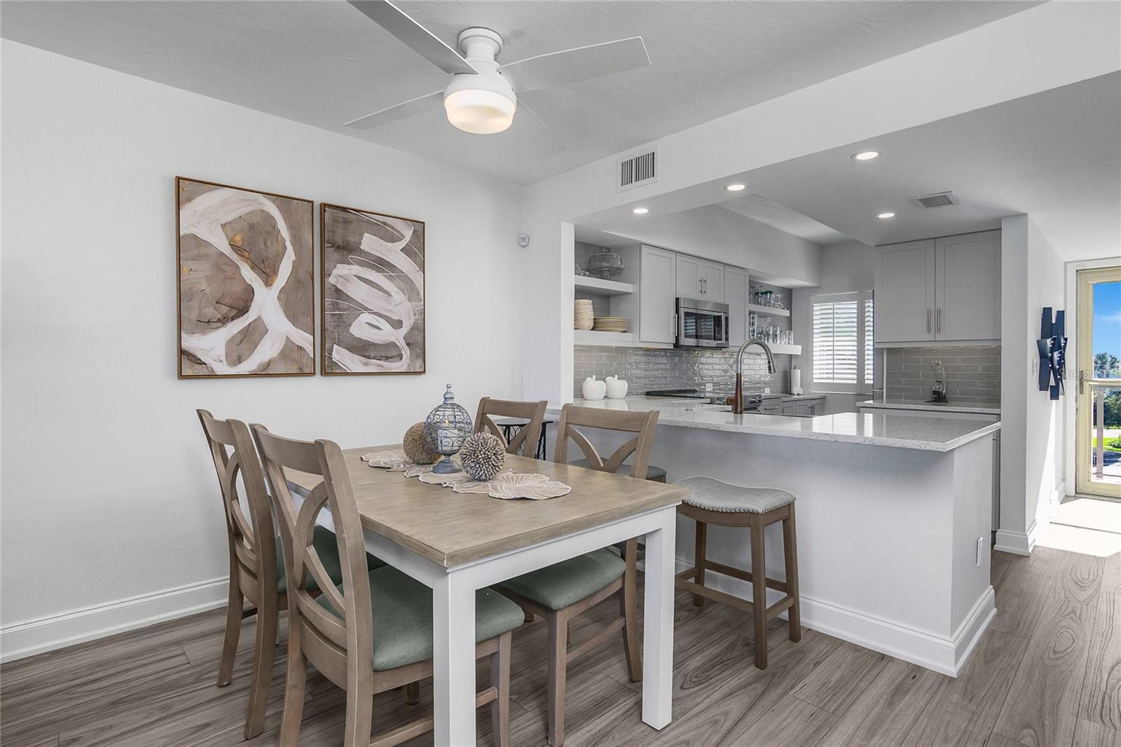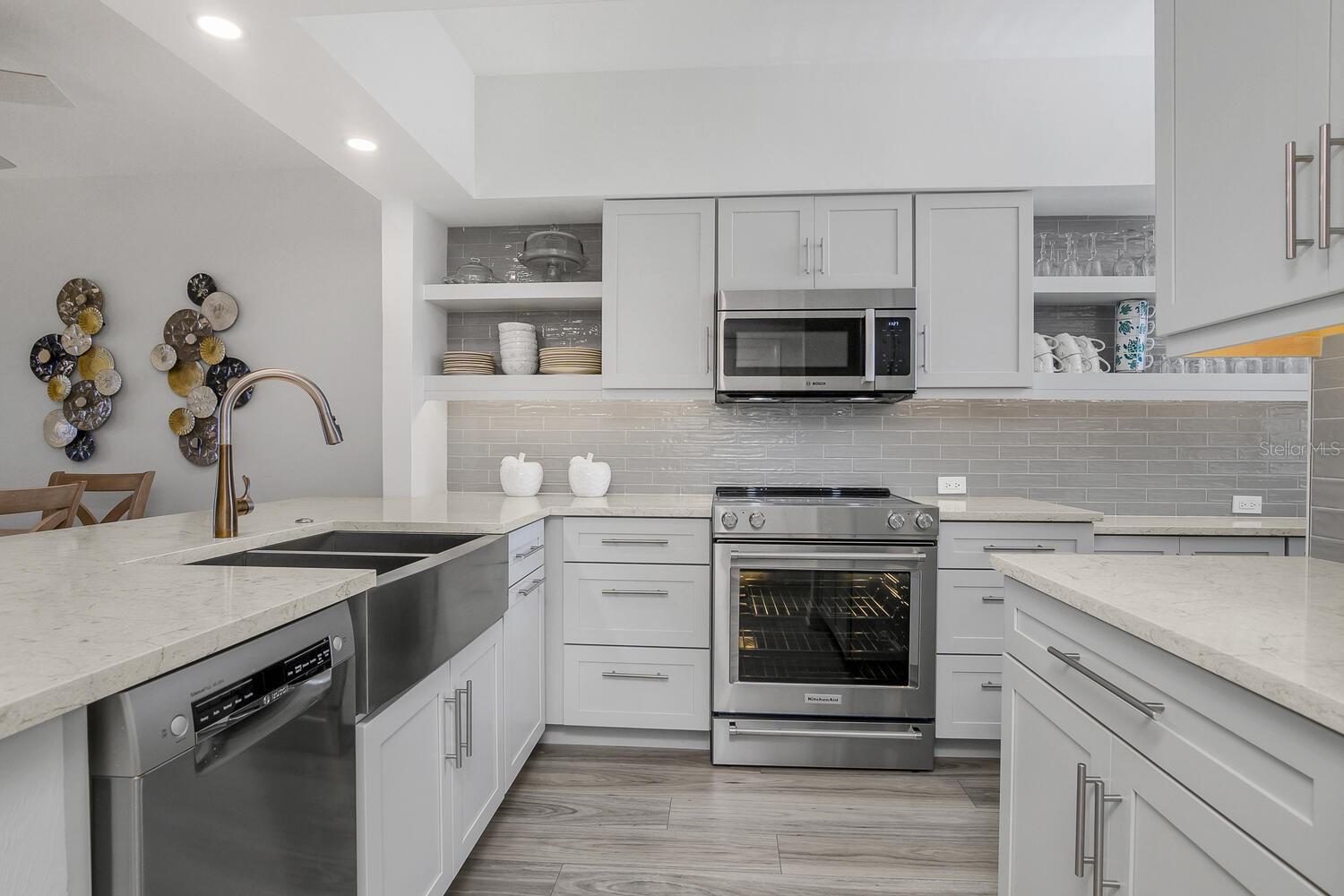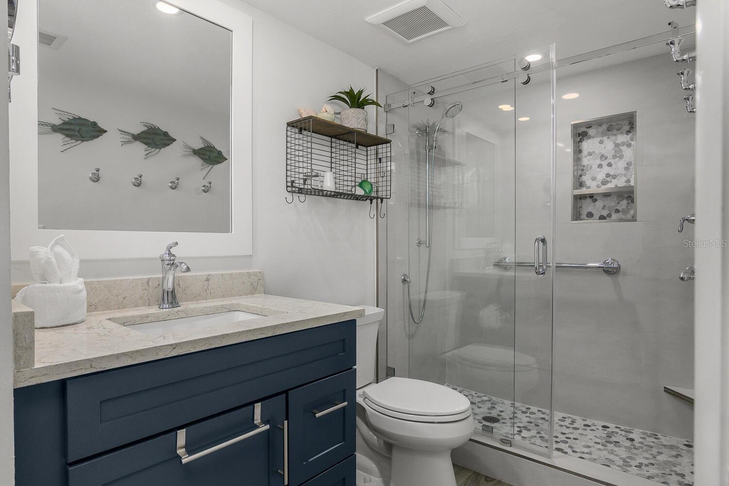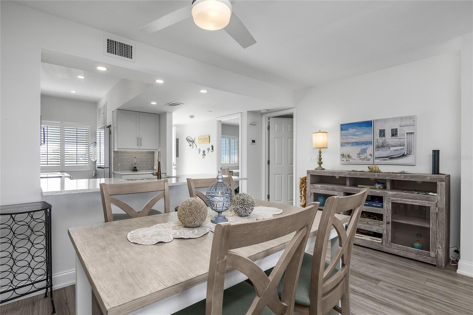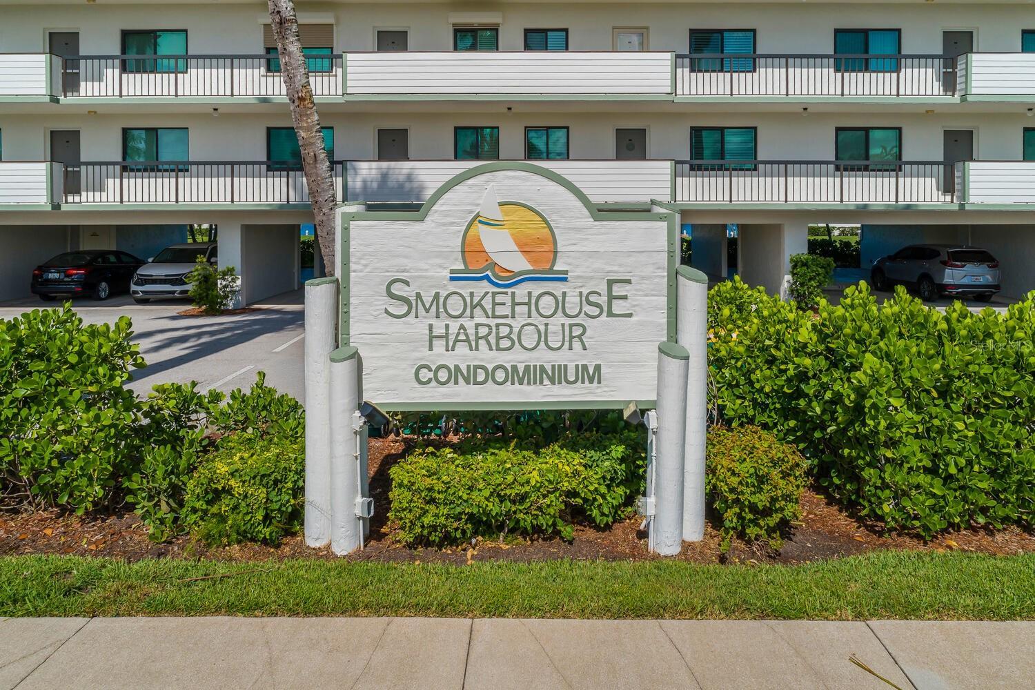 Welcome to Smokehouse Harbour, a stunning condominium conveniently located in the heart of the Island where all your needs are at arms length. This beautifully refurbished 2-bedroom, 2-bath unit perfectly blends comfort, security, and style and is offered turn key. The neutral and smooth decor enhances the breathtaking views of the lush landscape, pool, and bay. Completely renovated in 2022, this unit features impact glass, auto shade, and a security system for your peace of mind. The kitchen is a highlight, showcasing slow-close cabinetry, a farmhouse sink, and a spacious quartz island, making it both beautiful and functional. The wood-look tile flooring extends seamlessly throughout the unit, including the lanai, while Bahama shutter window treatments add a touch of elegance. The stocked galley kitchen is a chef's dream, offering fantastic counter space, a stylish subway tile backsplash, and a glass refrigerator. The Bosch stacked laundry unit is conveniently tucked away, complemented by an abundance of natural light that fills the space. The spacious primary suite is a true retreat, featuring a custom built walk in closet, double quartz vanity and an impressive stone walk-in shower with a stunning barn glass door and high-quality stainless steel hardware. The new sleep number bedding can accommodate either a king or two singles, providing flexibility for your comfort. Don't miss the opportunity to make this exquisite condominium your new home. Experience the perfect combination of luxury and tranquility at Smokehouse Harbour!