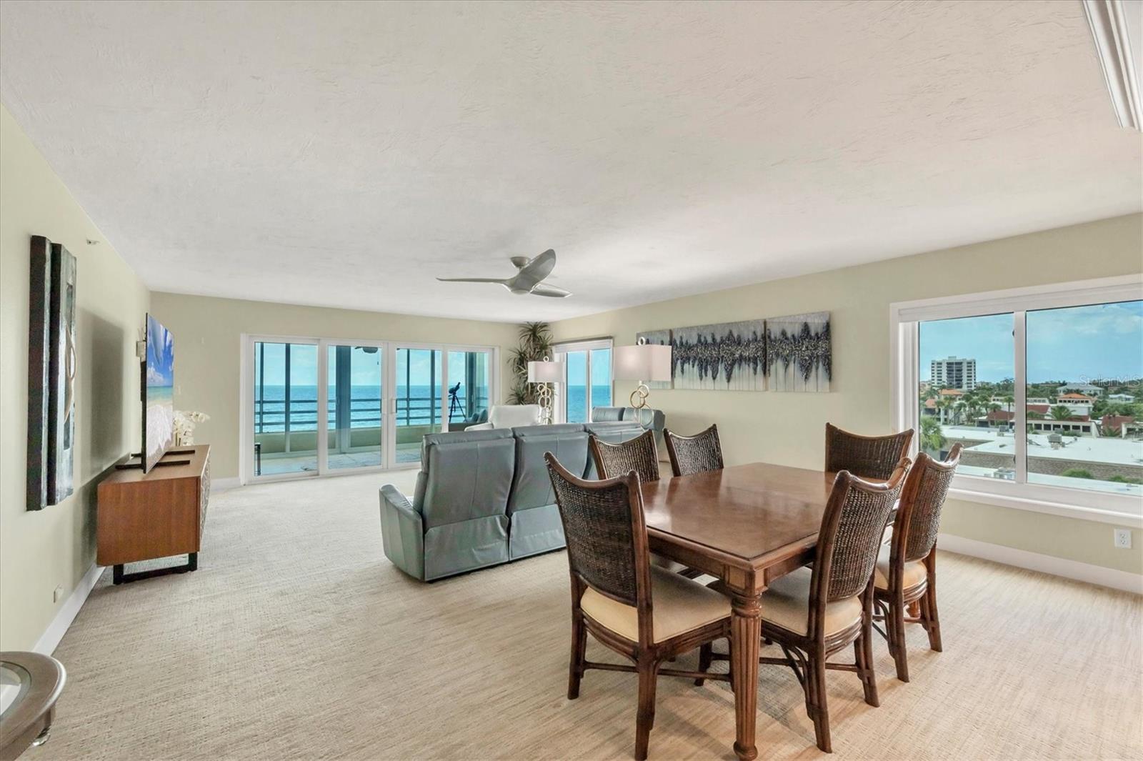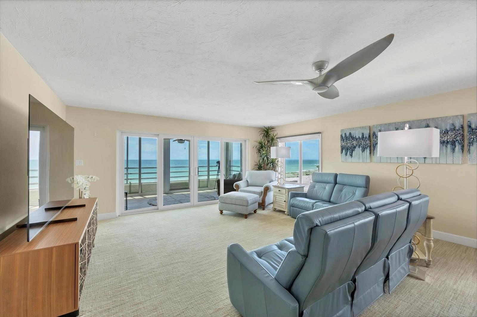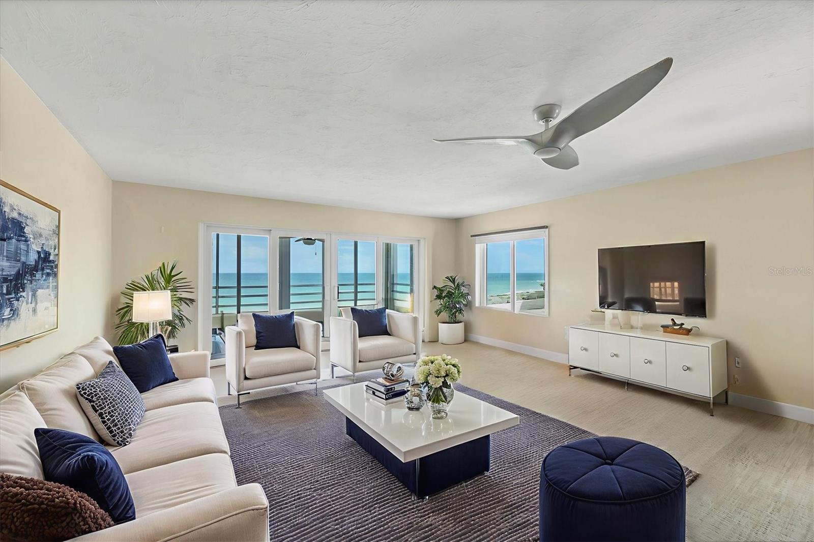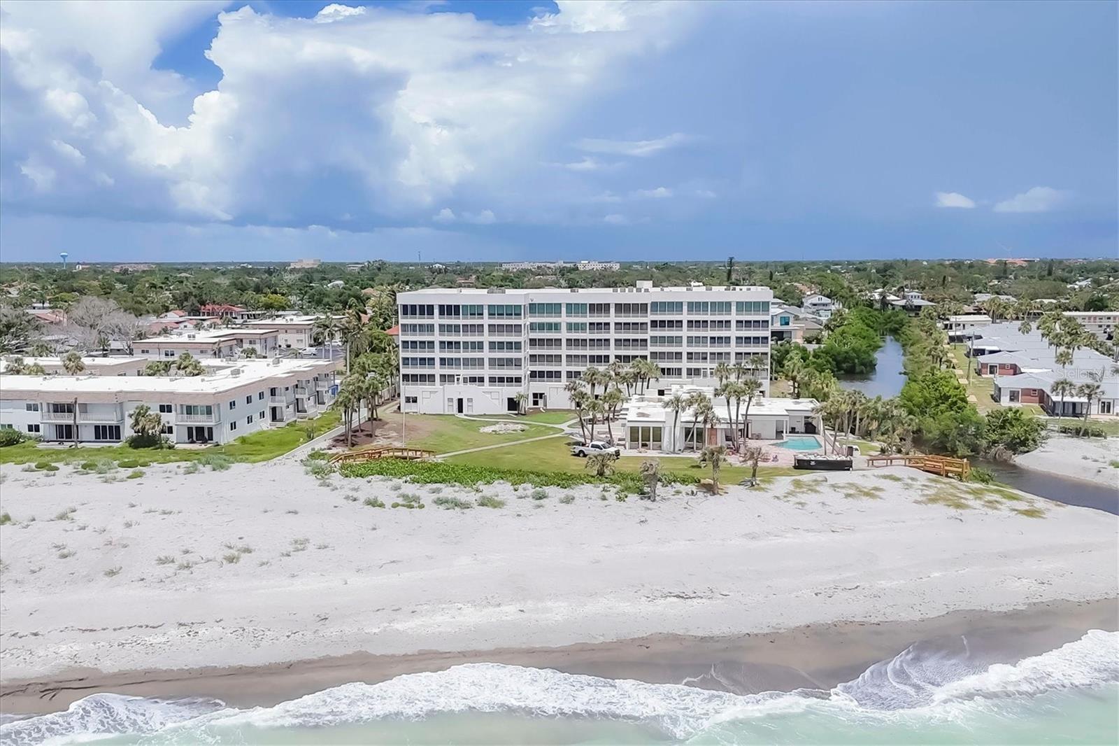 One or more photo(s) has been virtually staged. Rarely available corner residence at Island Shores on Venice Beach! This spacious 3-bedroom, 2.5-bath condo with a separate office/den (easily a 4th bedroom) offers incredible space, natural light, and one-of-a-kind views in a private beachfront mid-rise community. Enjoy breathtaking Gulf of Mexico sunsets from your 30-ft enclosed Florida room, plus two additional side balconies overlooking the Island of Venice—perfect for morning coffee, coastal breezes, and year-round indoor/outdoor living. Inside, the home features hurricane-impact windows and doors, Trane A/C, a Bosch tankless water heater, remodeled bathrooms, large walk-in closets, a hidden pantry, built-in bar, newer appliances, and updated tile flooring. Fully furnished with high-end décor is also available, making this a true turn-key opportunity. Island Shores residents enjoy a secure garage, guest parking, a clubhouse with kitchen, guest suites, a heated pool, fitness room, and private beach access just steps from your door. Located in one of the most walkable areas of Venice, you’re just minutes to shops, dining, marinas, parks, and Historic Downtown Venice. A rare find with unmatched views, space, and beachfront living—don’t miss this exceptional corner unit at Island Shores.
