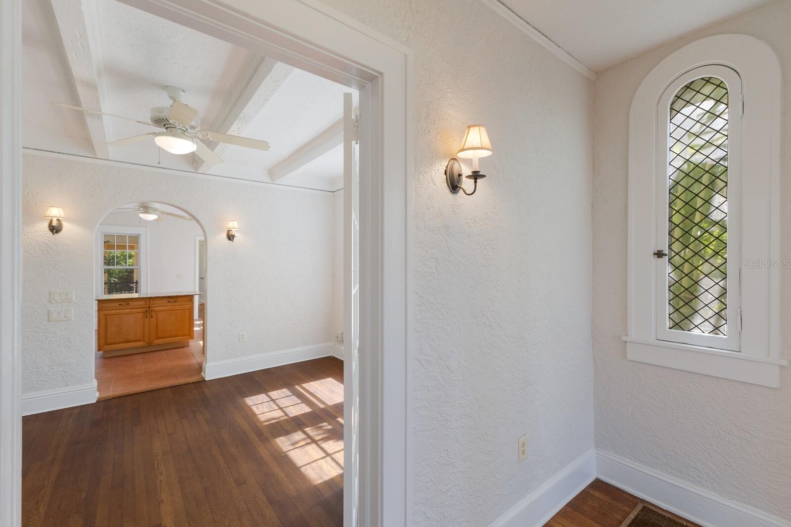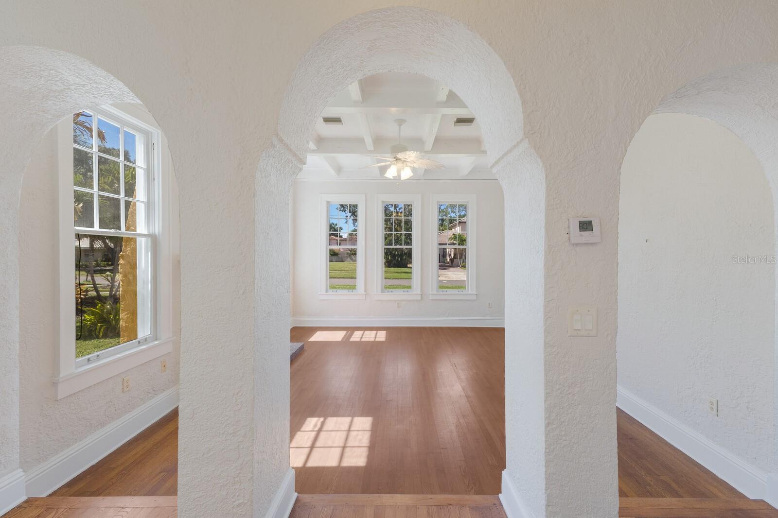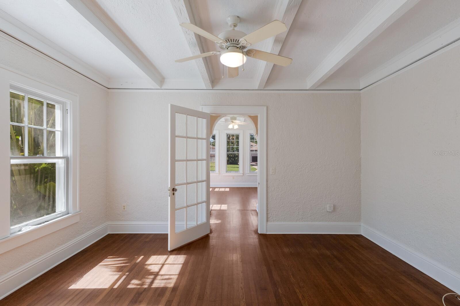 Step into timeless elegance with this stunning 3-bedroom, 2-bath Spanish Eclectic bungalow nestled in the heart of sought after Sapphire Shores. Rich in character and historic detail, this residence showcases dramatic architectural elements including beamed and coffered ceilings, gleaming oak floors throughout, and expansive windows that bathe every room in natural light. The spacious “sunken” living room centers around a show-stopping, decoratively carved mantelpiece, perfectly blending artistry with old-world charm. Each space offers a unique sense of craftmanship, from graceful arches to finely detailed trim, evoking romance and warmth of classic Mediterranean design. The current owner has elevated this home with a seamless addition: a stunning primary suite with a vaulted ceiling, French doors leading to a private back yard and a walk-in closet. Other “modern” updates include a spacious kitchen with and island and adjacent dinette, interior laundry and a 2-car garage accessed by a covered walkway; a loggia in keeping with the traditional nature of this architecture. Located just steps away from Sun Circle Park, Sarasota Bay, the Ringling Museum and the vibrant arts scene, this home is ideal for those seeking history, charm and convenience in one of Sarasota’s most beloved neighborhoods. Sapphire Shores in an eclectic waterfront neighborhood dating back to the Ringling Era and is now a combination of historic Mediterranean mansions, classic ranches and new construction. Live here amidst Sarasota's most significant cultural & educational institutions and you're only 2 miles north of downtown Sarasota, a 12-minute drive to St. Armands Circle and the beaches of Lido and Longboat Key and an equal distance to University Parkway anchored on the west by SRQ International Airport and UTC Mall and I75 on the east.