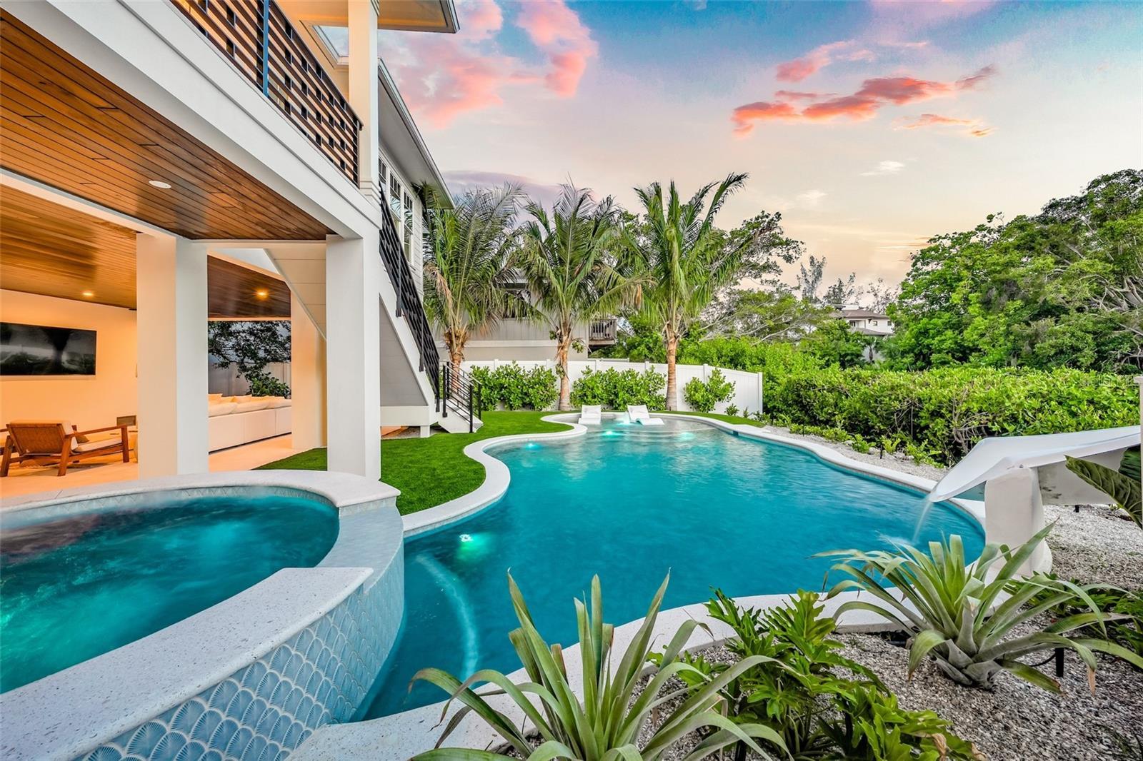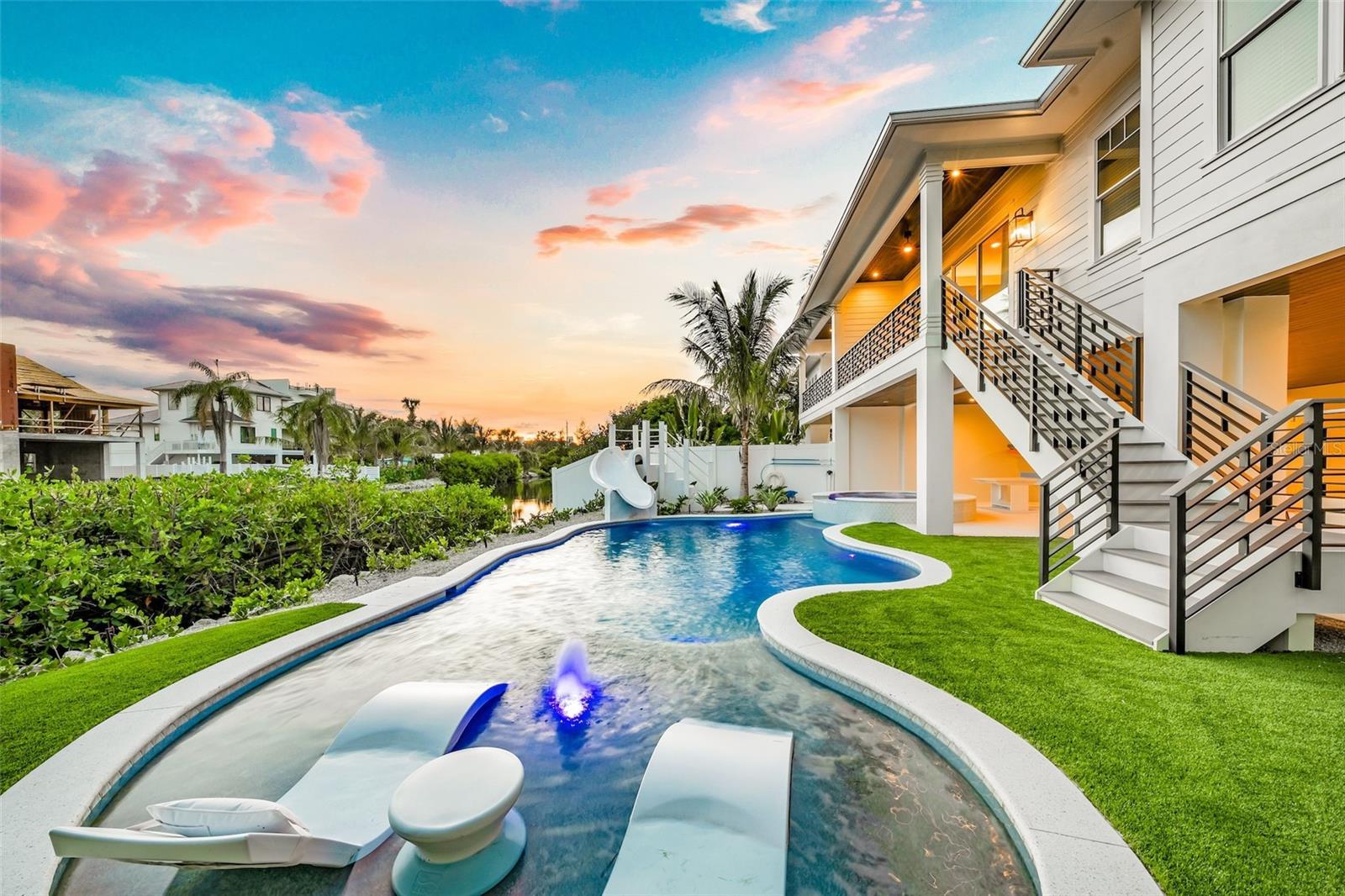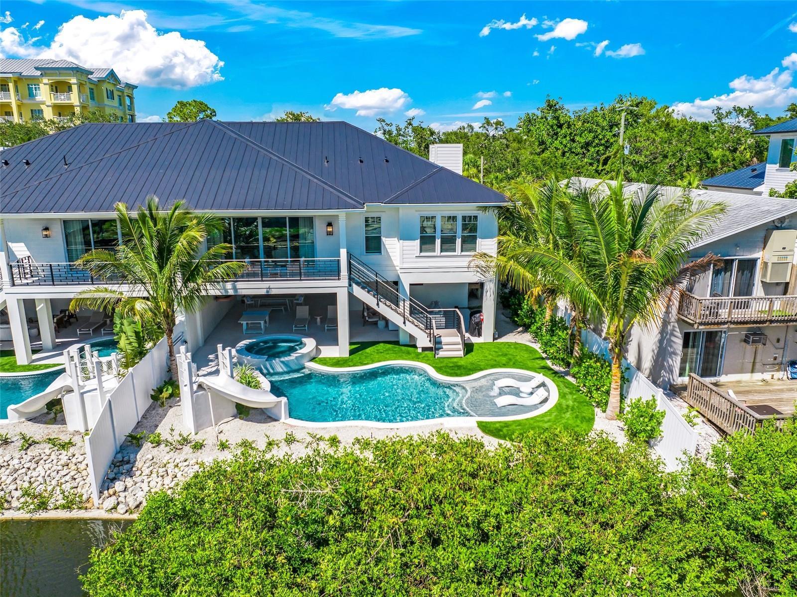 LOCATION, LOCATION, LOCATION ON BEAUTIFUL SIESTA KEY!!! Experience the ultimate in coastal luxury with this stunning new construction home by the renowned Eason Builders Group. Located on the tranquil and exclusive Peacock Road, this four-bedroom, four-and-a-half-bathroom waterfront residence offers a harmonious blend of modern elegance, tropical beauty, and thoughtful design. Be welcomed by sophistication as you enter the great room, where an open floor plan features inviting seating area and expansive sliding doors that bring the tropical breeze inside. The chef-inspired kitchen boasts top-of-the-line appliances, a generous center island, and a bar area with a wine fridge, creating the perfect space for entertaining or preparing gourmet meals. This home’s well-thought-out design includes four spacious bedrooms, each with its own en-suite bathroom adorned with designer finishes, ensuring comfort and privacy for every guest. This property is being offered turnkey furnished, allowing you to move in and start enjoying this exquisite home immediately or continue to use as a successful rental property. Outside, your personal paradise awaits. Surrounded by lush tropical landscaping and breathtaking water views, the outdoor living area features a sparkling pool with a water slide, an in-ground spa, and expansive patios perfect for hosting or relaxing. While part of an architecturally stunning paired estate, this home offers the independence and feel of a standalone residence- perfect for refined coastal living. Located in the heart of Siesta Key, this home offers the ultimate convenience. Just minutes from the renowned Siesta Key Beach—or less than a 10-minute walk—you can enjoy the powdery white sand and turquoise waters with ease. The home is also close to local restaurants, marinas, boutique shopping, and Sarasota’s vibrant arts and culture scene. Whether you’re seeking a serene personal retreat or a lucrative investment property with weekly rentals allowed, this home delivers it all. Don’t miss this rare opportunity to own a piece of paradise where luxury, breathtaking views, and the Siesta Key lifestyle come together to create your perfect coastal haven.