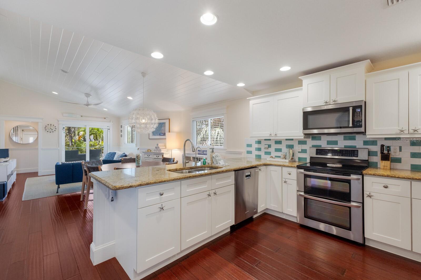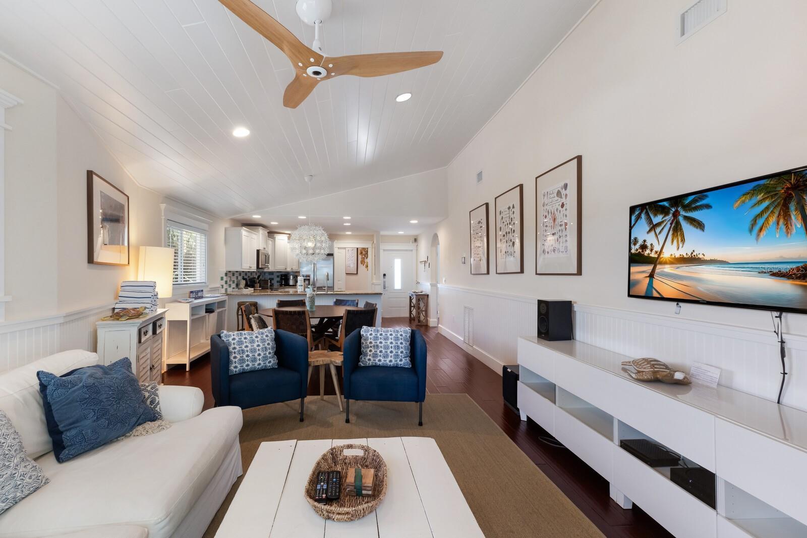 An easy 5-minute walk to the Gulf on the coveted north end of Anna Maria Island, Limelight is a fully furnished, nightly-rental-friendly pool home offering privacy, charm, and exceptional island value. Located just a few short blocks from direct beach access, this 3-bedroom, 2-bath single-family residence is ideal as a second home, full-time residence, or income-producing investment. Inside, vaulted white wood-plank ceilings, custom millwork, and rich wood flooring create a bright, welcoming coastal atmosphere throughout the open living and dining spaces. The kitchen flows seamlessly into the main living area and features stainless steel appliances, granite countertops, a custom tile backsplash, breakfast bar seating, and a reverse osmosis drinking water system. The primary suite offers a walk-in closet and en-suite bath with a walk-in shower, while guest bedrooms feature crown molding, custom wood trim, and warm wood floors — a timeless north-end aesthetic buyers seek. Outdoor living is where Limelight truly shines. A heated freeform pool is surrounded by lush tropical landscaping for complete privacy, complemented by a covered patio, outdoor shower, and an expansive open-air ground-level living area perfect for lounging, dining, or creating a poolside bar. Electric roll-down screens and hurricane shutters allow for year-round enjoyment. Notable upgrades include a new roof 2024, impact-rated doors and windows, 2-car tandem garage with impact door, interior laundry with storage, tankless hot water heater, app-controlled HVAC with AirKnight air purification, water softener with chlorine removal, 2020 stair and railing updates, and a new 2024 TV in the cabana area. Nightly rentals are permitted, and 2025 rental history reflects just under $100,000 in gross income, despite downtime related to hurricane impacts and owner use, highlighting strong income potential alongside personal enjoyment. The home is offered fully furnished and move-in ready, making this a rare opportunity to own a private pool home within walking distance of the beach on the north end of Anna Maria Island.