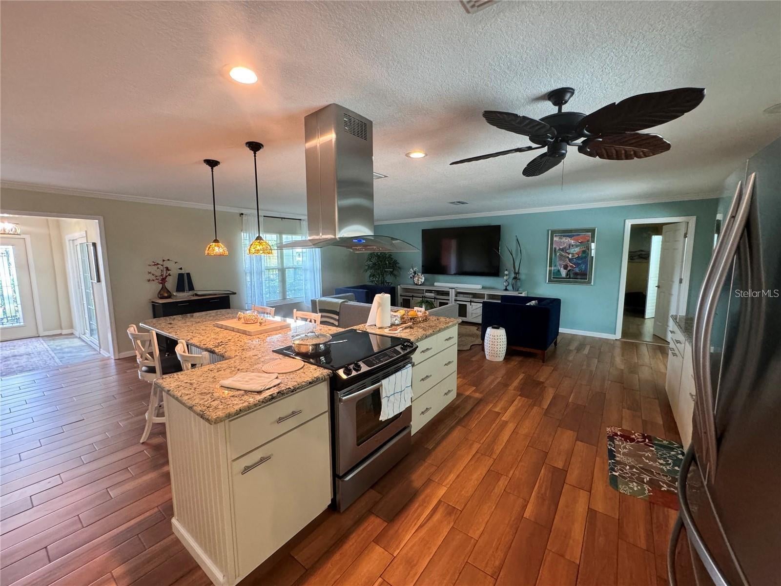 - Ceiling Fans(s), Crown Molding, Eat-in Kitchen, Kitchen/Family Room Combo, Living Room/Dining Room Combo, Open Floorplan, Primary Bedroom Main Floor, Stone Counters, Walk-In Closet(s), Window Treatments