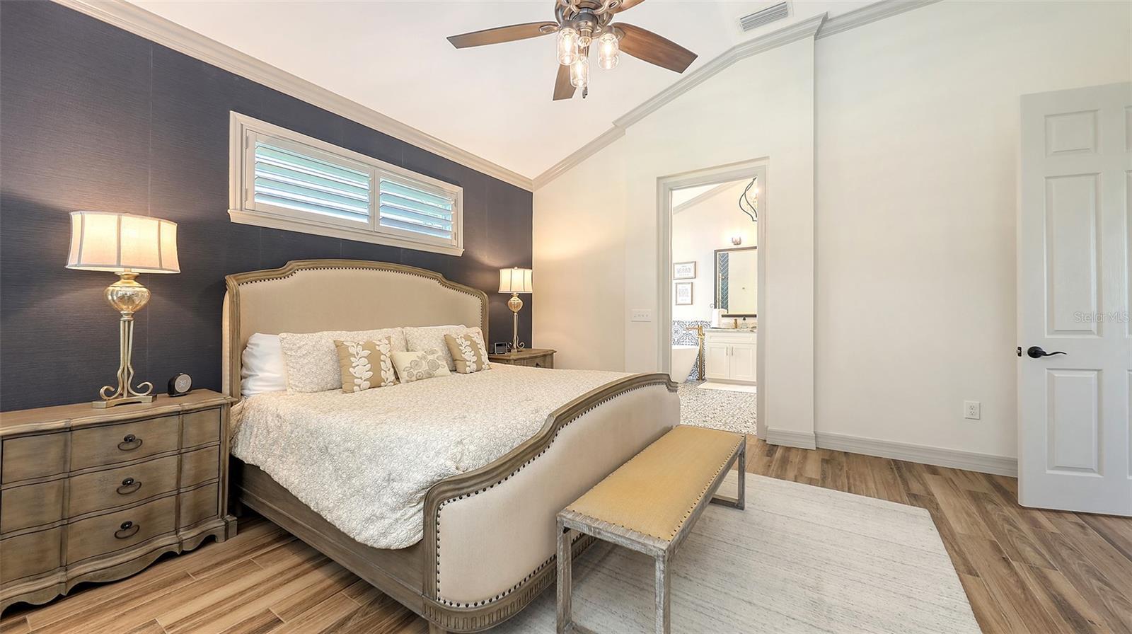 - Built-in Features, Ceiling Fans(s), Crown Molding, Eat-in Kitchen, High Ceilings, Living Room/Dining Room Combo, Open Floorplan, Primary Bedroom Main Floor, Solid Surface Counters, Solid Wood Cabinets, Split Bedroom, Thermostat, Vaulted Ceiling(s), Walk-In Closet(s), Window Treatments