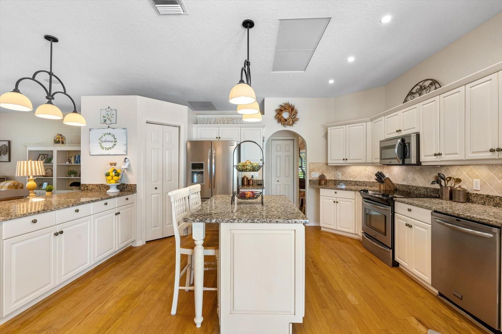 “Country Charm with Everyday Convenience” FANTASTIC PRICE REDUCTION! Nestled on over an acre of beautifully manicured and mature landscaping, this custom-built Augusta model, featuring 3 bedrooms, 2 baths, and a den, offers a rare combination of elegance & comfort. The beautiful double glass front entry with matching transom windows sets the tone, opening to soaring 12-foot ceilings, refined crown molding, and an abundance of natural light. The Family room is anchored by a lovely wood-burning fireplace, while the den features Bay Window with custom built-in seating, blending functionality with architectural charm. The gourmet kitchen is the heart of the home, showcasing a granite-topped island, premium finishes, and seamless flow for both intimate gatherings and grand entertaining. The expansive master suite is a private sanctuary, complete with large walk-in closet En-suite bathroom boasting double sink vanity, frameless glass shower, roman tub, and bidet. Sliding doors allow easy access to pool deck and lots of light. Practical touches such as a well-appointed laundry room with cabinetry and a utility tub access the spacious 3 car garage equipped with workbench and extra storage. Outdoors, the property embraces Florida living at its finest. A tranquil pond, shared with a neighboring property, provides the perfect setting for fishing and quiet reflection. At the same time, the surrounding grounds attract deer, turkeys, and other wildlife, not to mention abundant butterflies in the garden, creating a private nature retreat. Golf cart accessibility enhances the lifestyle, and additional features such as New Roof installed (2021), Well Pump (2025), Hot Water Heater (2022), solar film on south facing windows, a water softener all add both efficiency and convenience. Located just 30 min. from downtown Sarasota, 20 min. to Waterside LWR, Only 11 miles from I-75, shopping & Restaurants. Convenient to both Siesta and Lido’s beautiful beaches and 15 min. from the Majestic Myakka State Park. With timeless design and serene surroundings, this home is a refined retreat where luxury meets tranquility. Schedule you showing today!