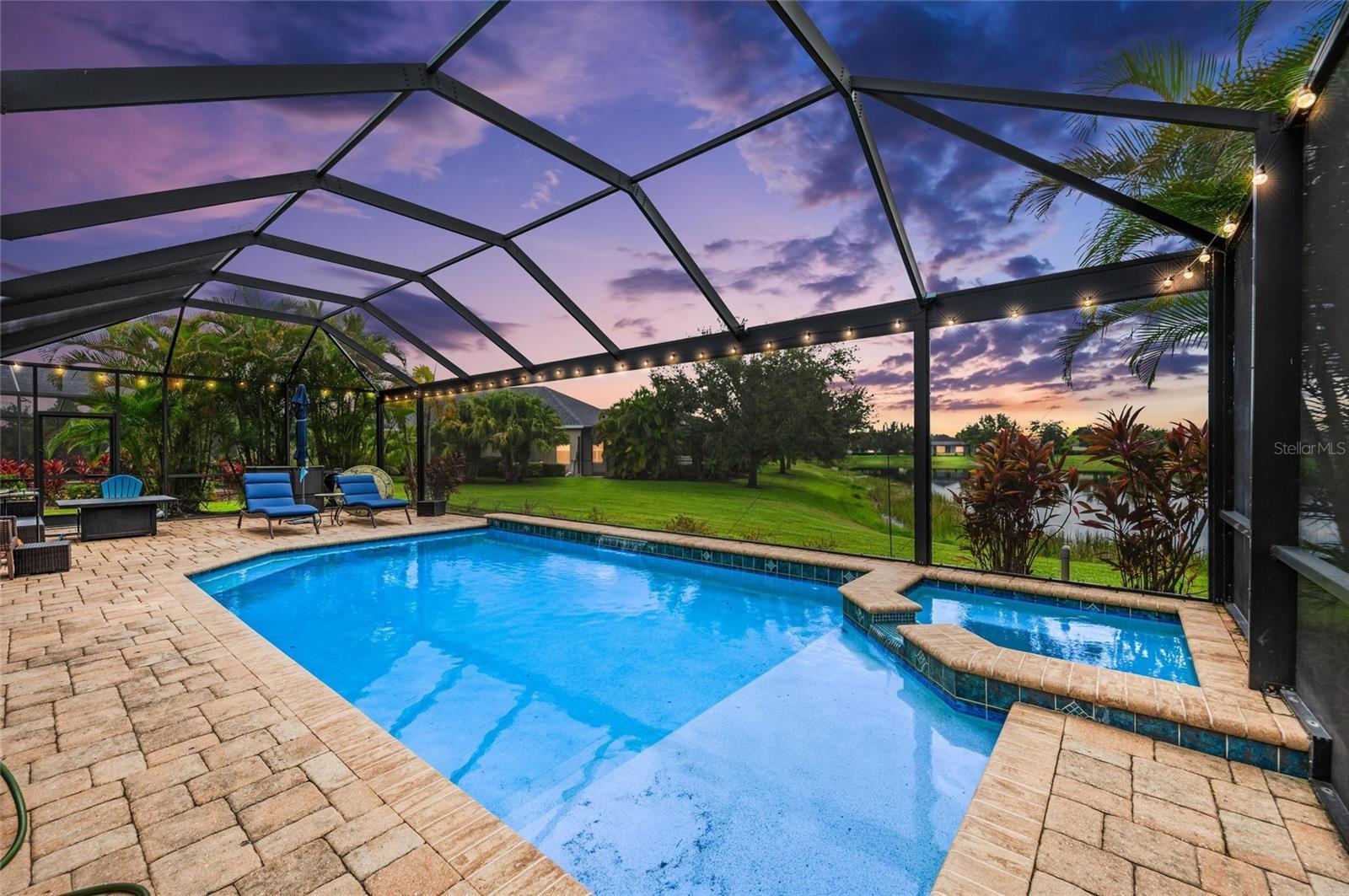 One or more photo(s) has been virtually staged. This beautifully maintained two-story residence offers over 3,100 sq ft of well-designed living space on a 1/3-acre lakefront lot, perfectly positioned to capture breathtaking sunrises and sunsets. Featuring 5 spacious bedrooms—including 4 on the main level—and 4 full bathrooms (two with walk-in showers and two with soaking tubs), this home blends comfort, elegance, and functionality. The open-concept kitchen, dining, and family room is the heart of the home, boasting granite counters, a center island, walk-in pantry, and brand new stainless steel appliances. Recent upgrades include luxury vinyl flooring, plush carpeting, and a brand new roof with solar panels (owned and completely paid off) for great energy savings. Step outside to your private outdoor oasis, complete with a spa, oversized swimming pool, and panoramic screened lanai plumbed for a future outdoor kitchen—ideal for entertaining or simply relaxing by the water. Upstairs, a large bonus room with full bath and walk-in closet offers the perfect space for a guest suite, home office, or in-law accommodations. Additional highlights include a 3-car garage with a Tesla charging station, central vacuum, surround sound, and a two-zone A/C system for efficiency and comfort. X flood zone, safest in the area, and we’re on the same power grid as the school, which is also a shelter so we never lose power. Located in the highly sought-after Central Park community, you’ll enjoy resort-style amenities including tennis and pickleball courts, a splash pad, playgrounds, and scenic walking trails. This home is zoned for top-rated schools—Mona Jain, Lakewood Ranch High, and Gullett—all within walking or biking distance. Just minutes from shopping, dining, golf, and recreation. This lakefront gem is move-in ready and offers the perfect blend of luxury and lifestyle in one of Lakewood Ranch’s most desirable neighborhoods.