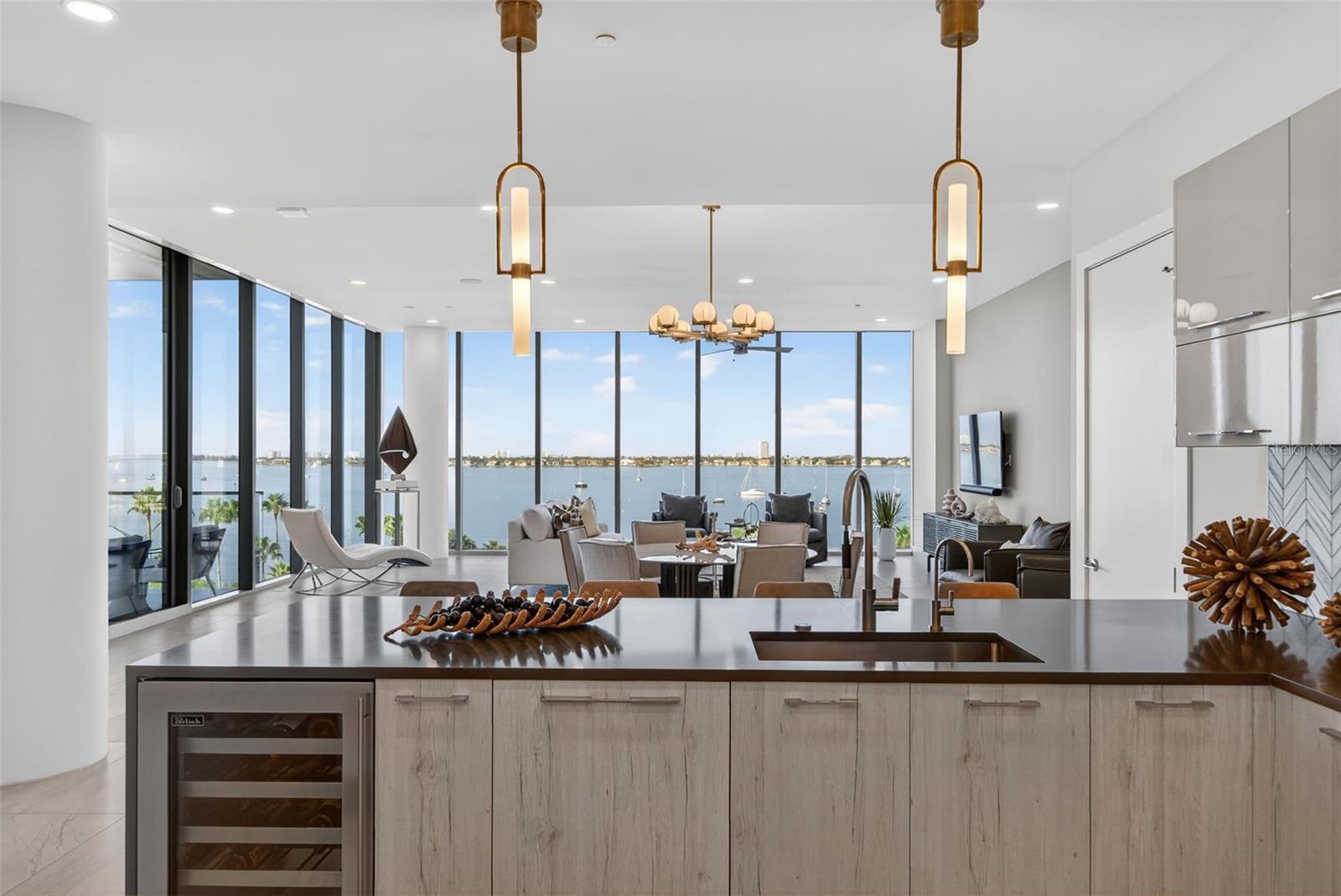 If you’re looking for a downtown condominium with unparalleled views of the Bay and City lights, framed by the drama of a panoramic southwest corner, look no further than this exceptional EPOCH residence in Sarasota’s most desirable walkable neighborhood. Arrive via your private elevator foyer and be greeted by walls of glass showcasing sweeping vistas from Marina Jack to Big Pass and the Gulf beyond. Spanning 3,600 air-conditioned square feet, this coastal contemporary home blends sophisticated style, smart technology, and exceptional comfort. Soaring ceilings and an open floor plan enhance the grand scale of the great room, dining area, and expansive terraces, creating seamless spaces for both intimate living and large-scale entertaining. The gourmet kitchen is a true centerpiece, with a large island, bespoke Cucine Ricci Italian cabinetry, quartz countertops, and ultra-premium Gaggenau appliances including a six-burner gas range, double ovens, side-by-side refrigerator/freezer, and wine refrigerator. Access to the terrace with a summer kitchen makes indoor-outdoor living effortless. The owner’s retreat is an unrivaled sanctuary with direct bayfront terrace access, generous custom walk-in closets, and a spa-inspired bath featuring a curbless walk-in shower, sculptural soaking tub, double vanities, and two private water closets. The guest wing includes two en-suite bedrooms and a private den/TV lounge, providing comfort and privacy for family and visitors. Every finish speaks to refined living, from large-format porcelain flooring to Lutron automated shades, smart lighting controls, multi-zone air conditioning, and an oversized laundry room. A private storage space and two secure deeded parking spaces further elevate convenience. At EPOCH, residents enjoy world-class amenities: a 70-foot recreation and lap pool with spa, fire tables, pool bar and grill; a dramatic rooftop terrace; a Residents’ Club; state-of-the-art fitness center; massage suite; steam showers; and a private guest suite for visitors. Meticulously conceived to honor the Sarasota School of Architecture, EPOCH offers just 23 exclusive residences where contemporary elegance and unmatched quality converge. Nestled on the shoreline of Sarasota Bay and steps from downtown’s cosmopolitan core, this is the pinnacle of Gulf Coast living.