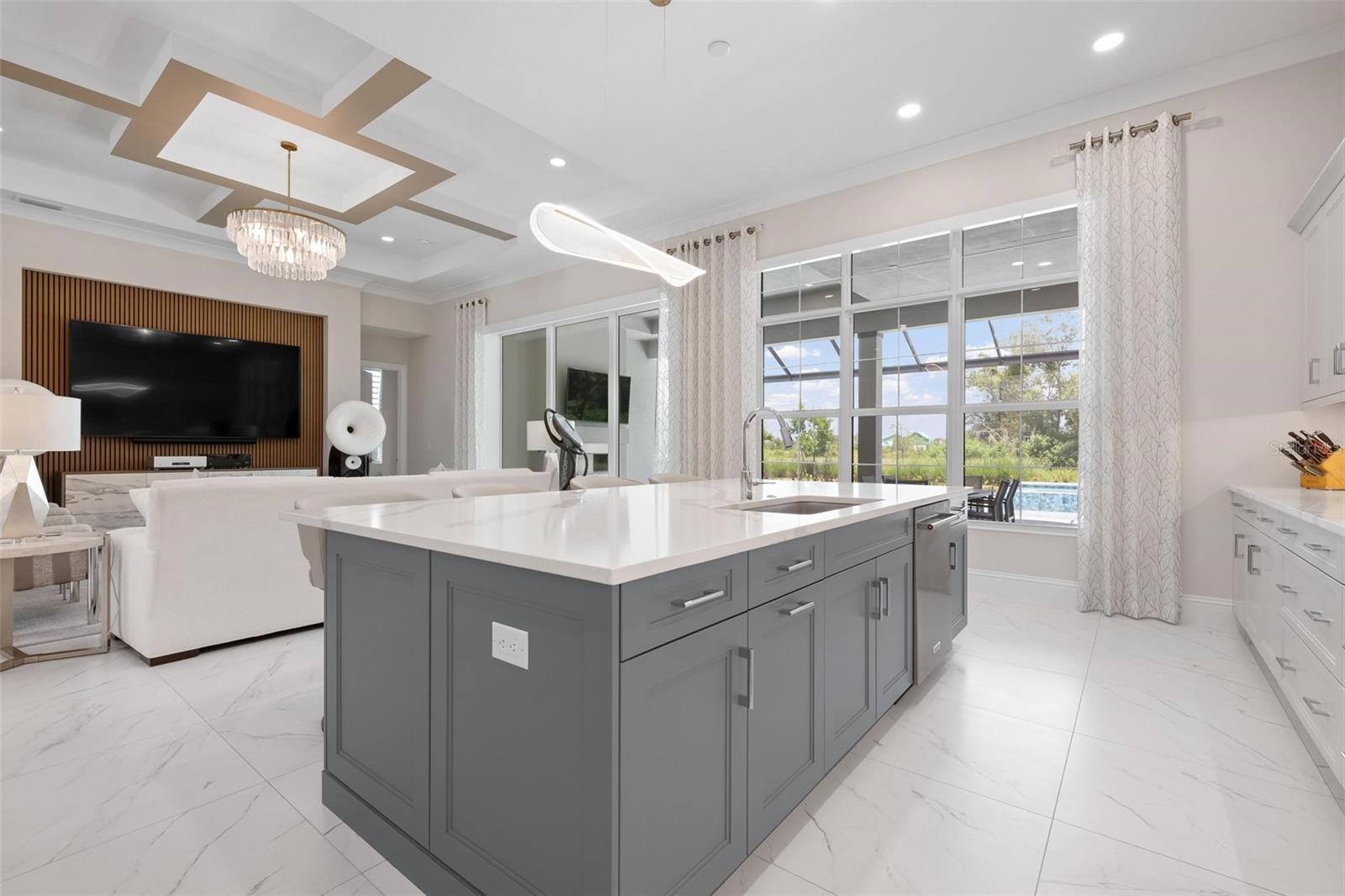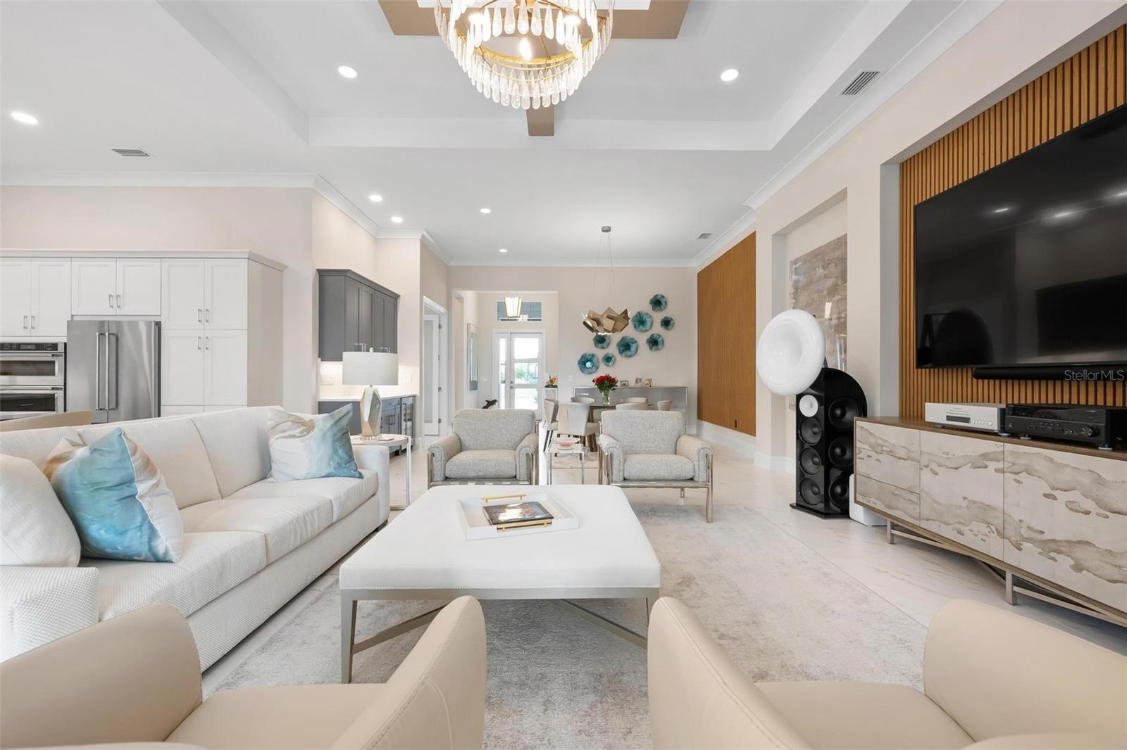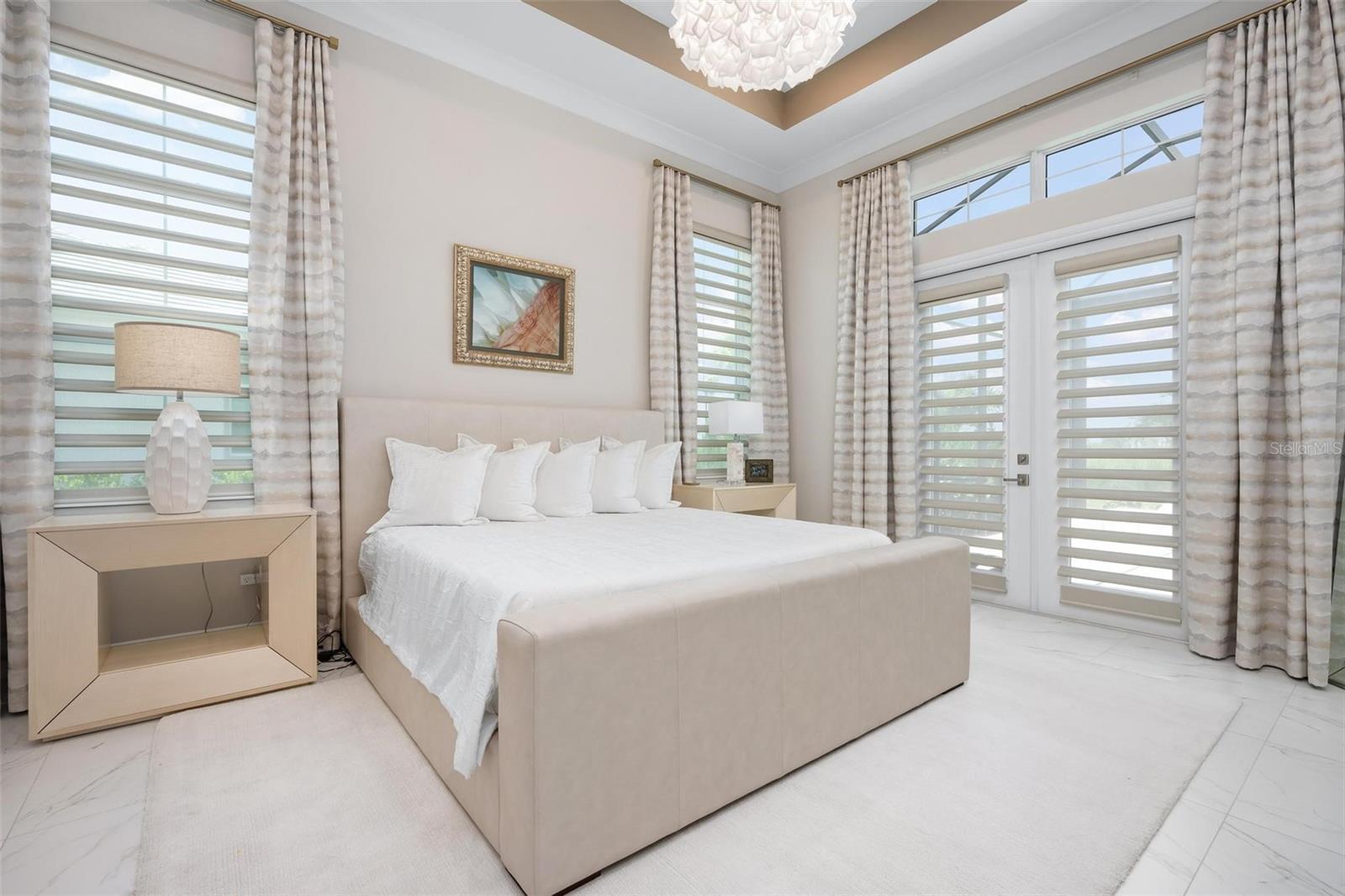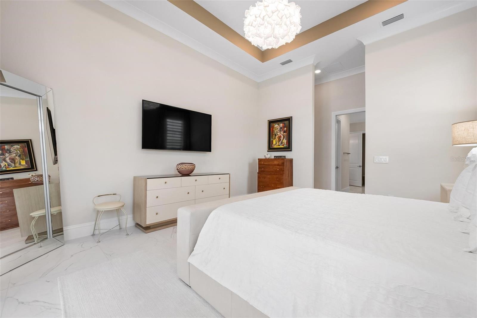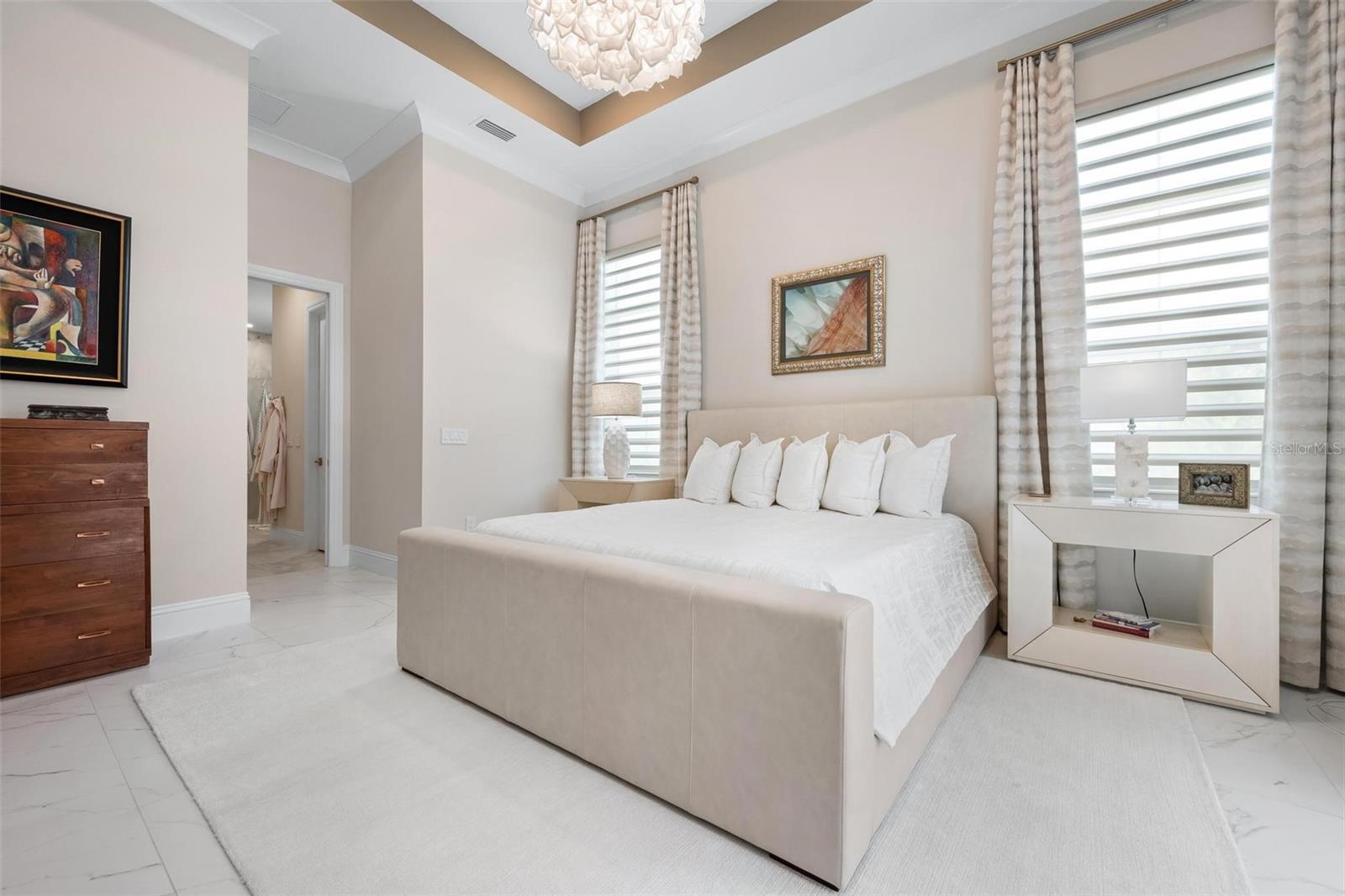 - Ceiling Fans(s), Coffered Ceiling(s), Crown Molding, Dry Bar, Eat-in Kitchen, High Ceilings, In Wall Pest System, Kitchen/Family Room Combo, Open Floorplan, Primary Bedroom Main Floor, Solid Wood Cabinets, Split Bedroom, Stone Counters, Thermostat, Tray Ceiling(s), Walk-In Closet(s), Window Treatments