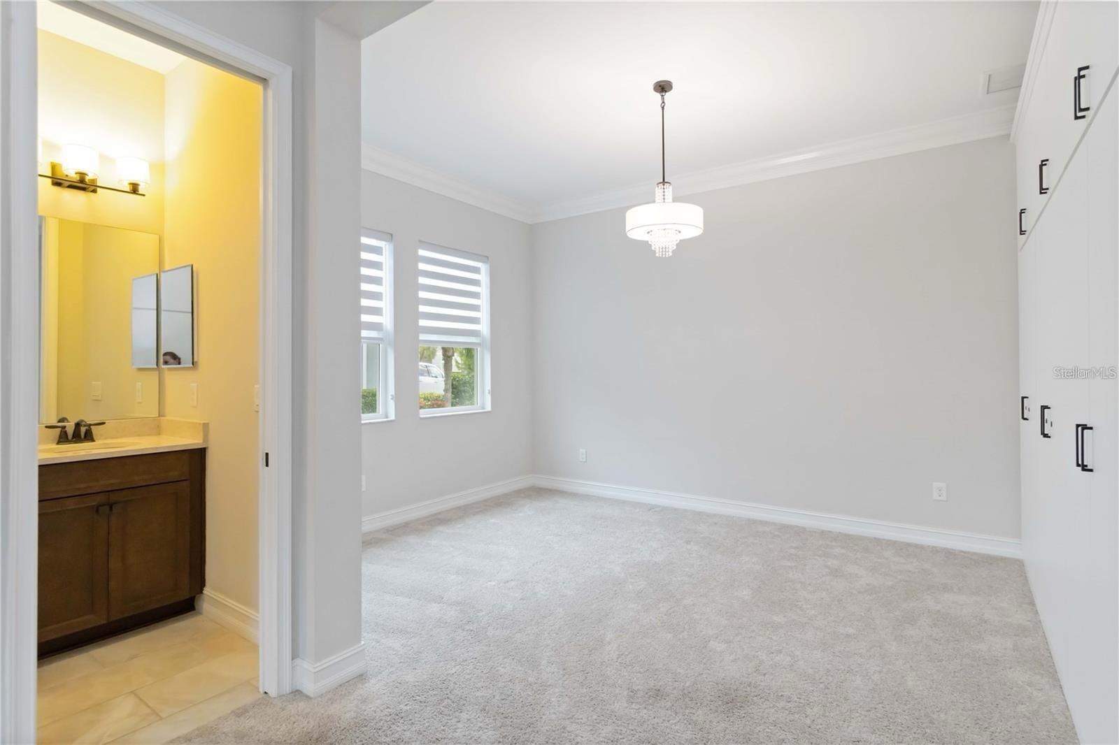 - Built-in Features, Ceiling Fans(s), Coffered Ceiling(s), Crown Molding, Eat-in Kitchen, High Ceilings, In Wall Pest System, Kitchen/Family Room Combo, Living Room/Dining Room Combo, Open Floorplan, Pest Guard System, Primary Bedroom Main Floor, Solid Surface Counters, Solid Wood Cabinets, Split Bedroom, Stone Counters, Thermostat, Tray Ceiling(s), Walk-In Closet(s), Window Treatments
