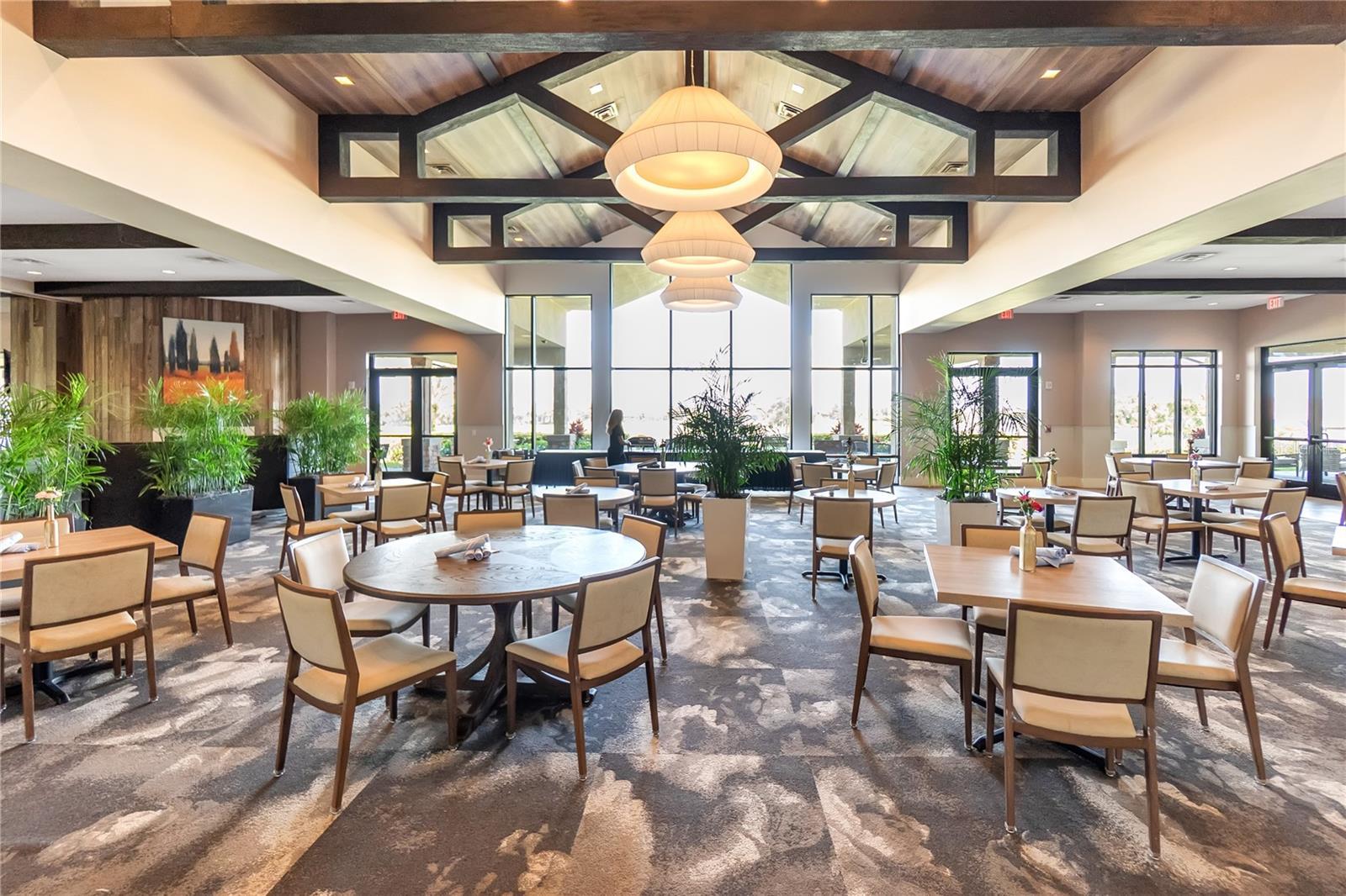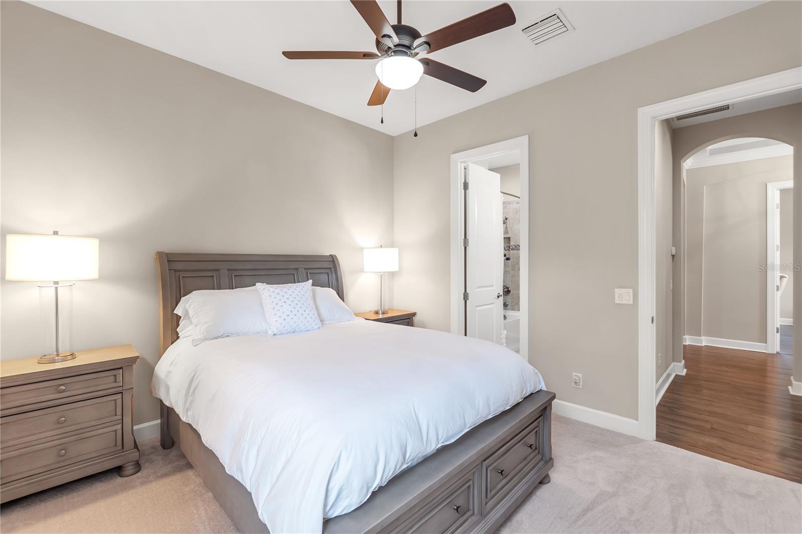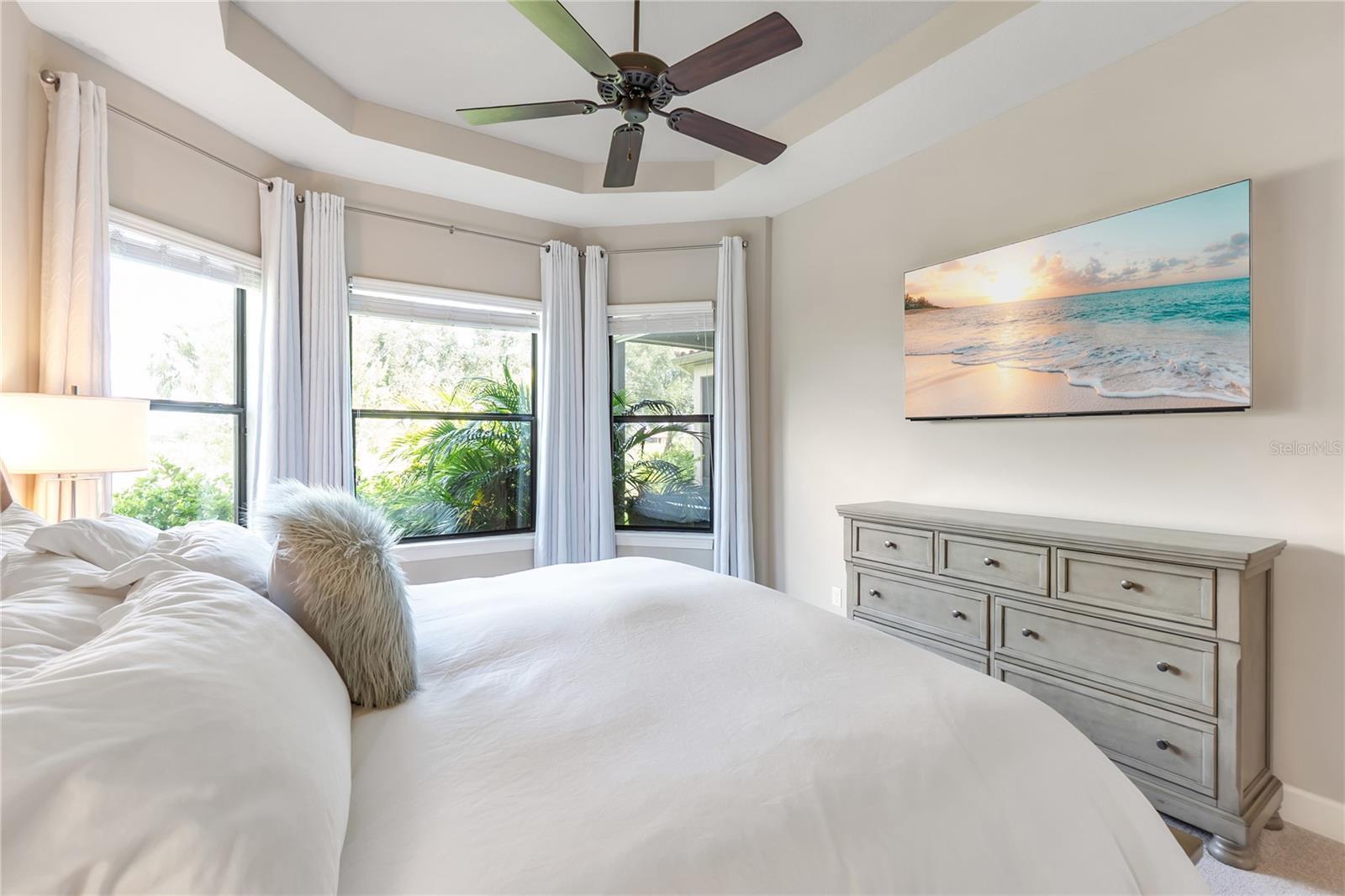 - Ceiling Fans(s), Coffered Ceiling(s), Crown Molding, In Wall Pest System, Primary Bedroom Main Floor, Solid Wood Cabinets, Split Bedroom, Stone Counters, Walk-In Closet(s), Window Treatments