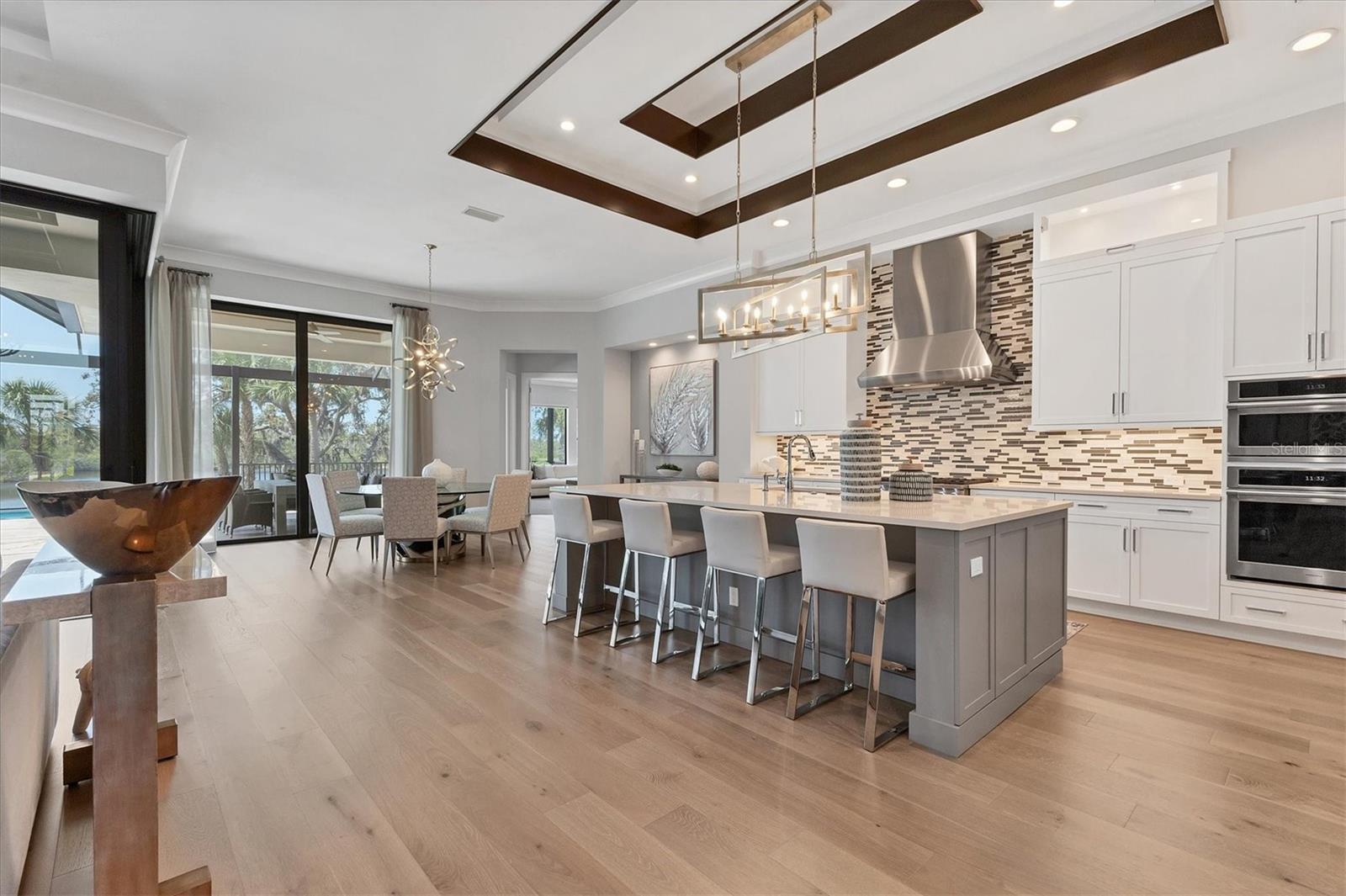 Discover a luxurious blend of craftsmanship, comfort and elegance in this custom-built Arthur Rutenberg waterfront estate with a private boat lift and pool/spa located in The Islands on the Manatee River - one of the most prestigious and sought-after guard-gated boating communities. Designed to capture the essence of Florida living, this exceptional residence sits on a southern-facing, half-acre lot with stunning views of the river, offering direct boating access with no locks to the Gulf. From the moment you step through the double iron doors, the detailed foyer entry with wood inlay flooring sets the stage for the refined design and thoughtful details throughout. Built to high-quality standards and spanning nearly 4,000 square feet of air-conditioned living space, this home features 4 spacious bedrooms, each with its own en-suite bath, a dedicated home office and an inviting bonus room. Soaring 12-foot ceilings, solid 8-foot interior doors, impact-tinted glass windows, custom closets, crown molding, high-end lighting and rich wood flooring set the tone. The heart of the home is the impeccable chef’s kitchen, outfitted with top-of-the-line Monogram stainless steel appliances, including a 6-burner dual-fuel range, built-in oven and microwave, 42-inch built-in refrigerator and wine fridge. A large walk-in pantry hidden behind a custom cabinet door, quartz countertops, high-end cabinetry, a massive island with additional storage and a wood-accented double tray ceiling with chandelier, ensure both beauty and functionality. The kitchen overlooks the family room with an elegant electric fireplace, coffered ceiling with wood accents and expansive impact-resistant pocketing sliding doors with access to the covered lanai and pool/spa. The travertine-tiled lanai is designed for entertaining, with a fully equipped outdoor kitchen featuring a Lynx gas grill, vent hood, sink, fridge, custom cabinetry and quartz counters. Lounge under the wood ceiling with triple outdoor fans, gather around the gas fireplace, or unwind in the 17,200-gallon saltwater pool/spa - all framed by a picture-view screen cage that maximizes your panoramic water views. The Mosquito Masters system adds another layer of outdoor comfort. For boating enthusiasts, the 36-foot private dock with 14,000-pound lift, electric, water, lighting, and walkway to the lanai is a rare luxury - offering seamless access to the river and Gulf. The primary suite is a serene sanctuary featuring oversized French doors to the lanai, tray ceilings, custom drapery and shades, dual walk-in closets and a spa-inspired bathroom with a freestanding soaking tub, double vanities with makeup station, walk-in shower, water closet and access to a secluded garden patio - a rare and peaceful escape. Additional bedrooms are thoughtfully separated for privacy, each offering their own en-suite bathrooms and walk-in closets. Work from home in the dedicated office/den with floor-to-ceiling windows, 14-foot ceilings and custom millwork. The oversized bonus room overlooks the pool and river – making it an ideal space for a media room, lounge or game space. The laundry room is equipped with Samsung washer/dryer, custom cabinetry, utility sink, and natural light pouring in through oversized windows. The 3-car garage features epoxy floors, custom storage cabinetry and a 2-foot extension on both bays. This is more than a home - it’s a lifestyle destination for those who value privacy, quality, and direct boating access.