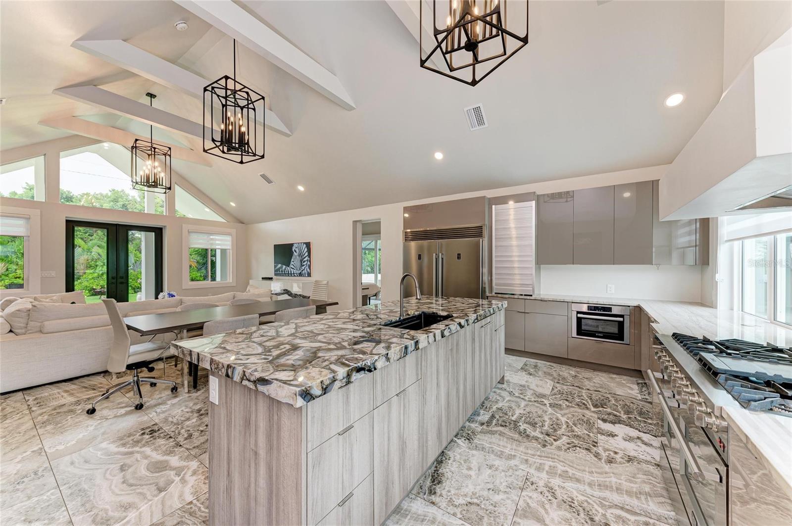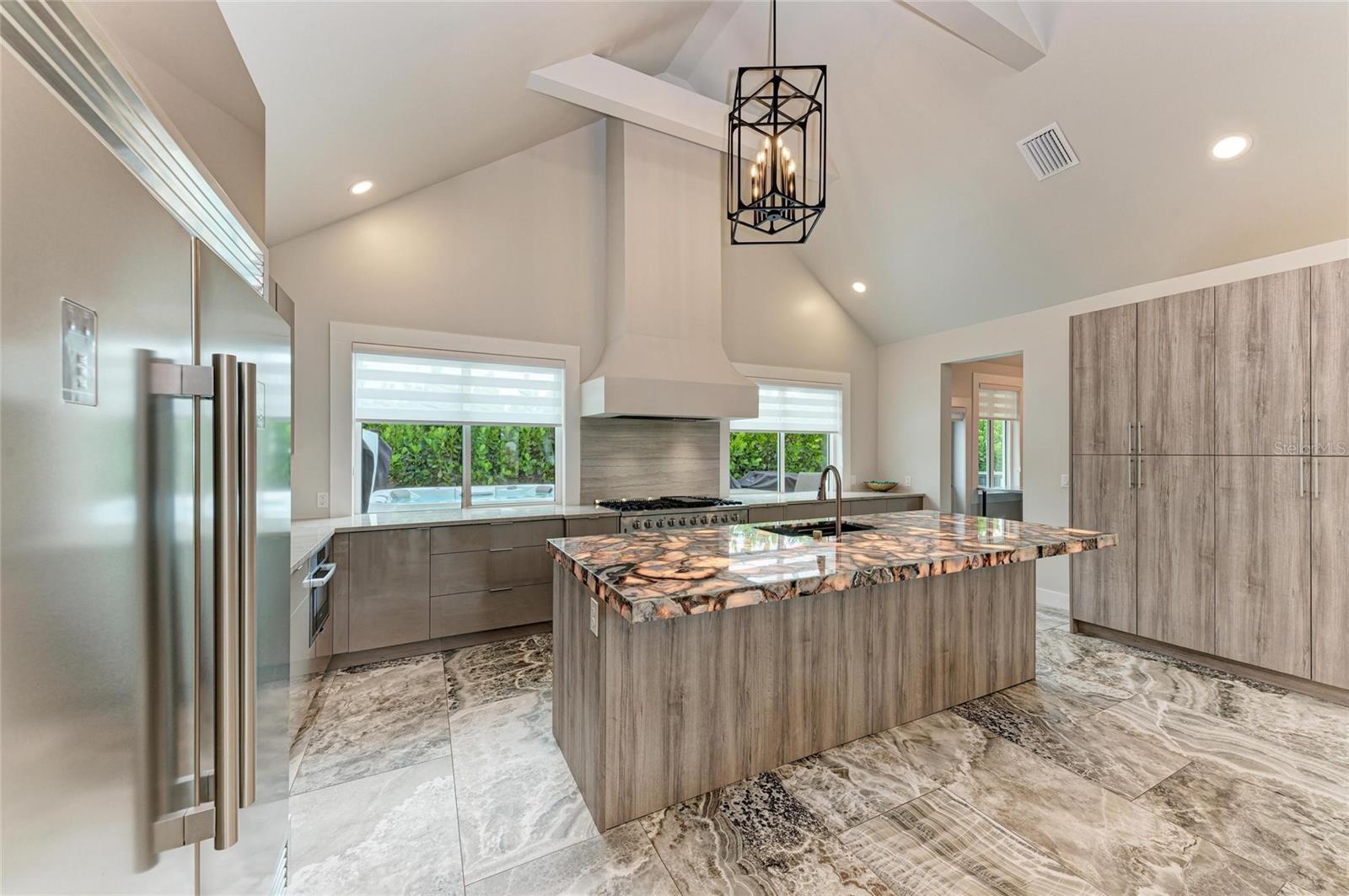 If you’re looking for a true “wow” factor, this stunning new-construction residence delivers. This custom-designed home combines luxury finishes with thoughtful functionality. Step inside to soaring 16-foot ceilings and dramatic exposed beams in the great room, creating an impressive sense of space. The chef’s kitchen is the centerpiece, featuring a striking brown agate back-lit island, Mustang granite countertops, modern cabinetry with pullouts and utensil organizers, an eight-burner professional range with bread and baking oven, custom vent hood, and upscale appliances—perfect for entertaining. Throughout the home, you’ll find large-format tile floors, custom window treatments, and the option to purchase designer furnishings. Offering 3 spacious bedrooms and 2.5 baths, this residence blends style and comfort seamlessly. Outdoor living is just as impressive, with a brand-new modern pool and pool cage (completed August 2024), a Jacuzzi brand hot tub, and a private outdoor shower with hot and cold water. The property is professionally landscaped, freshly painted inside and out (August 2025), and boasts impact windows and doors, ensuring safety, efficiency, and some of the lowest homeowners insurance rates available. Additional highlights include a tankless gas water heater, gas and electric dryer connections, and no flood zone location. Situated on one of Sarasota’s highly coveted “Flower Streets,” this property offers rare flexibility: the City of Sarasota permits 7-night minimum rentals, and the home is not subject to Southgate deed restrictions. Just 1 mile south of Sarasota’s luxury waterfront downtown, and less than 3 miles to the world-famous Siesta Key Beach, the home is also walkable to Conner’s Steakhouse, Baker & Wife, shopping, dining, banks, and groceries—all tucked away on a quiet dead-end street. Make an offer