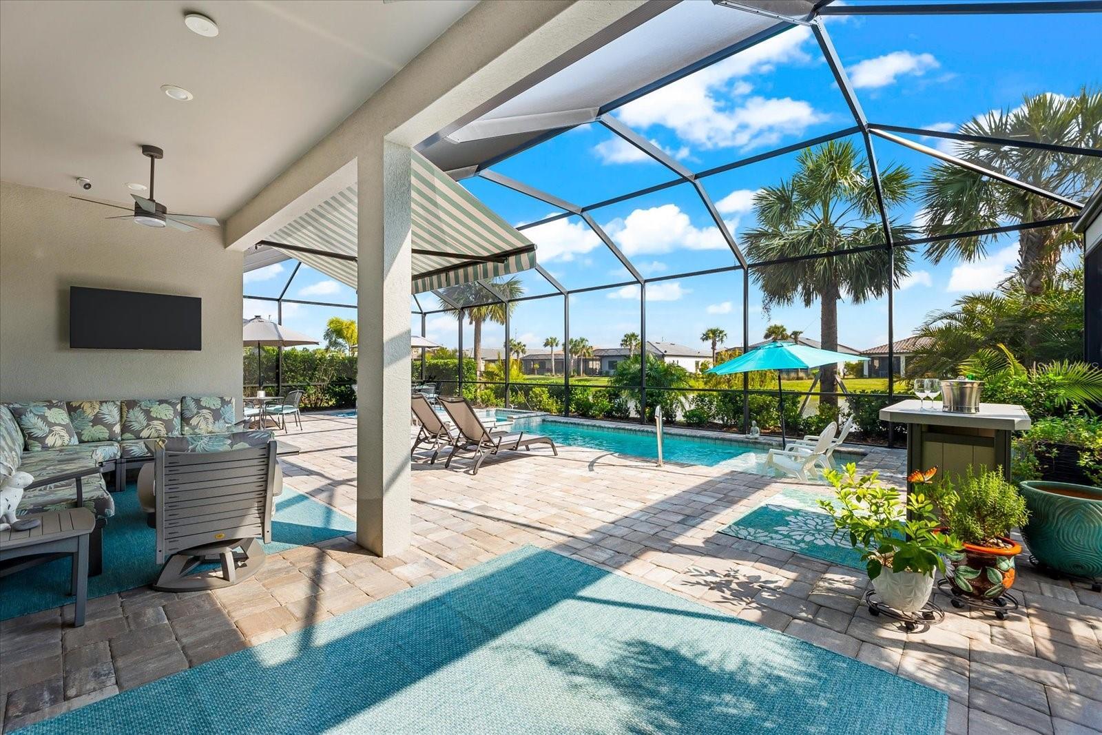 WHOLE HOUSE GENERATOR* IMPACT DOORS AND WINDOWS* PRICED TO SELL*Modern Comfort Meets Resort-Style Living in Del Webb Lakewood Ranch. Welcome to easy, elegant living in the heart of Del Webb Lakewood Ranch—one of the area's most desirable 55+ communities. Set on a premium south-facing waterfront lot, this beautifully upgraded Renown floor plan offers everything you need for comfort, style, and low-maintenance Florida living. Step inside to discover an open, airy layout with 3 spacious bedrooms, 3.5 bathrooms, and a flexible bonus room—perfect for a home office, hobby space, or additional living area. Thoughtful upgrades shine throughout the home, from tray ceilings and crown molding to plantation shutters and impact-resistant windows and doors. The gourmet kitchen is a standout feature, complete with Bosch induction cooktop, built-in double ovens, stainless steel range hood, 2-zone wine fridge, wine rack, reverse osmosis system, touchless faucet, custom cabinetry, and a perfectly organized walk-in pantry. The oversized island is the heart of the home—ideal for casual dining, entertaining, or prepping meals in style. The owner’s suite is your personal retreat, featuring a luxurious bath with dual vanities, an oversized walk-in shower, private water closet, and two custom walk-in closets. Two additional guest suites, each with their own private bath and walk-in closet, offer comfort and privacy for visitors. Enjoy peace of mind with a whole-house 24kW generator, water softener system, and an extended 3-car garage with built-in storage and epoxy floors. A separate powder room, drop zone, and large laundry room add to the home’s smart and functional design. Love the outdoors? You’ll appreciate the custom-designed heated saltwater pool and spa, extended brick-paver lanai, automatic sunshades, awning, and panoramic water views—perfect for relaxing or entertaining year-round. Large pocket sliding doors open wide to blend indoor and outdoor living effortlessly. Living in Del Webb Lakewood Ranch means more than just a beautiful home—it’s a lifestyle. Enjoy access to top-tier amenities including 6 tennis courts, 8 pickleball courts, bocce ball, a fitness center with group classes, a resort-style and lap pool, on-site restaurant and bar, and endless social opportunities organized by a full-time Lifestyle Director. With close proximity to Gulf Coast beaches, airports, shopping, dining, and culture, this home truly has it all. Move-in ready and meticulously maintained—don’t miss the opportunity to make it yours.