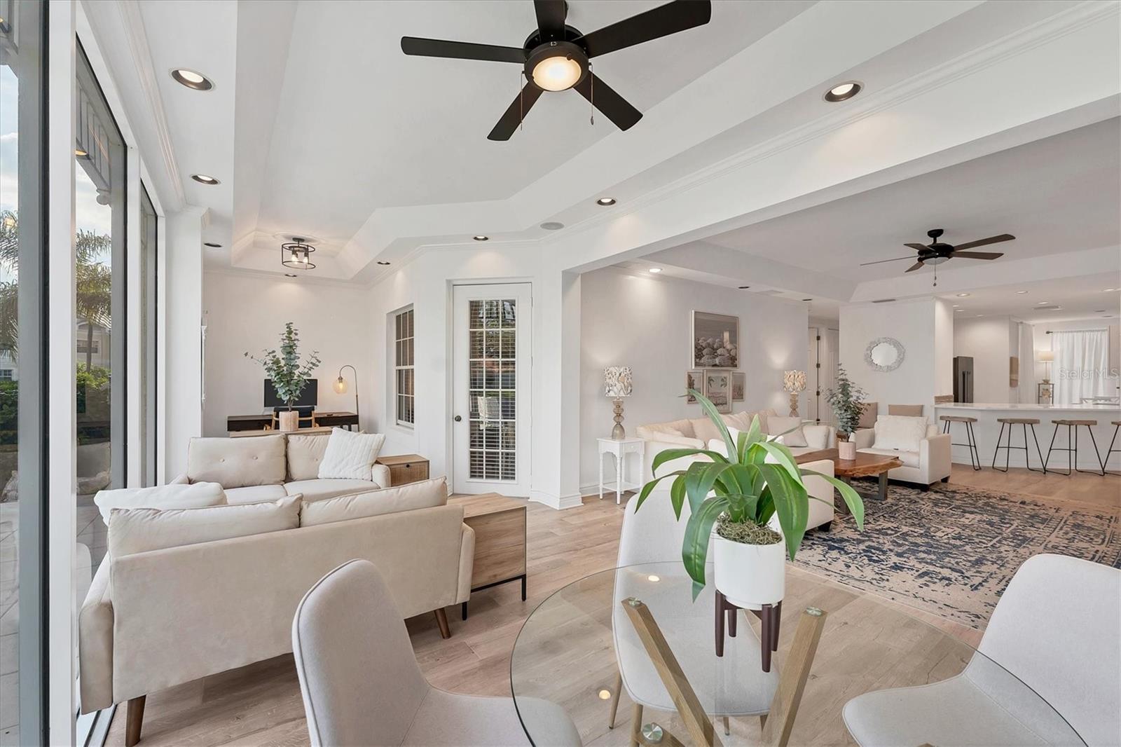 Gorgeous! Luxuriously FURNISHED 3 bedroom, 3 Full bathroom LAKESIDE villa with huge back patio and amazing interior natural light! Kitchen offers stainless steel appliances, subway tile backsplash, Quartz countertops, blonde wood cabinets, farmhouse large sink, pantry closet, and eat-in space. Interior features include wood-look luxury vinyl flooring, custom shelving in all bedroom closets, updated bathrooms, Florida Room with dining area + seating area + desk area. The seller has the flex space shown as a dining room, but new owner can transform it into a 4th bedroom, home office, home gym, etc. Owners enjoy access to heated pool and hot tub, fitness room, 1 month minimum rental policy, and close proximity to IMG Academy facilities. Dont wait to see this one!