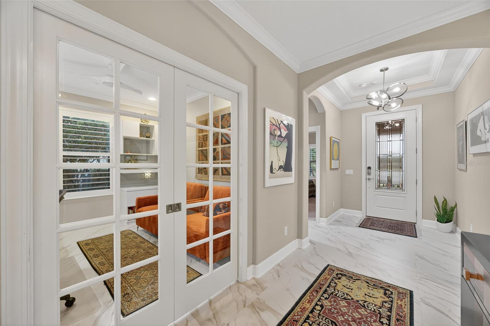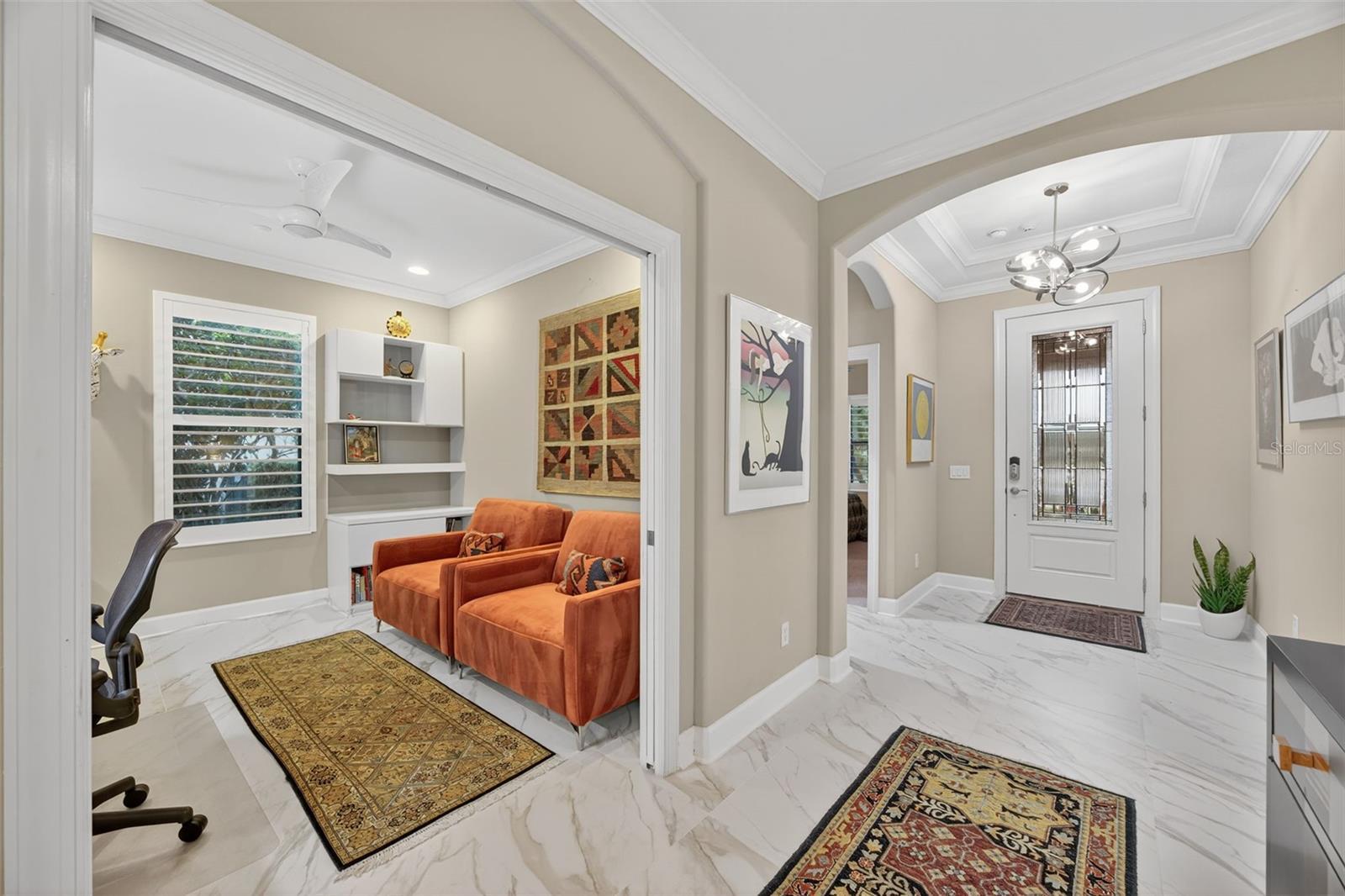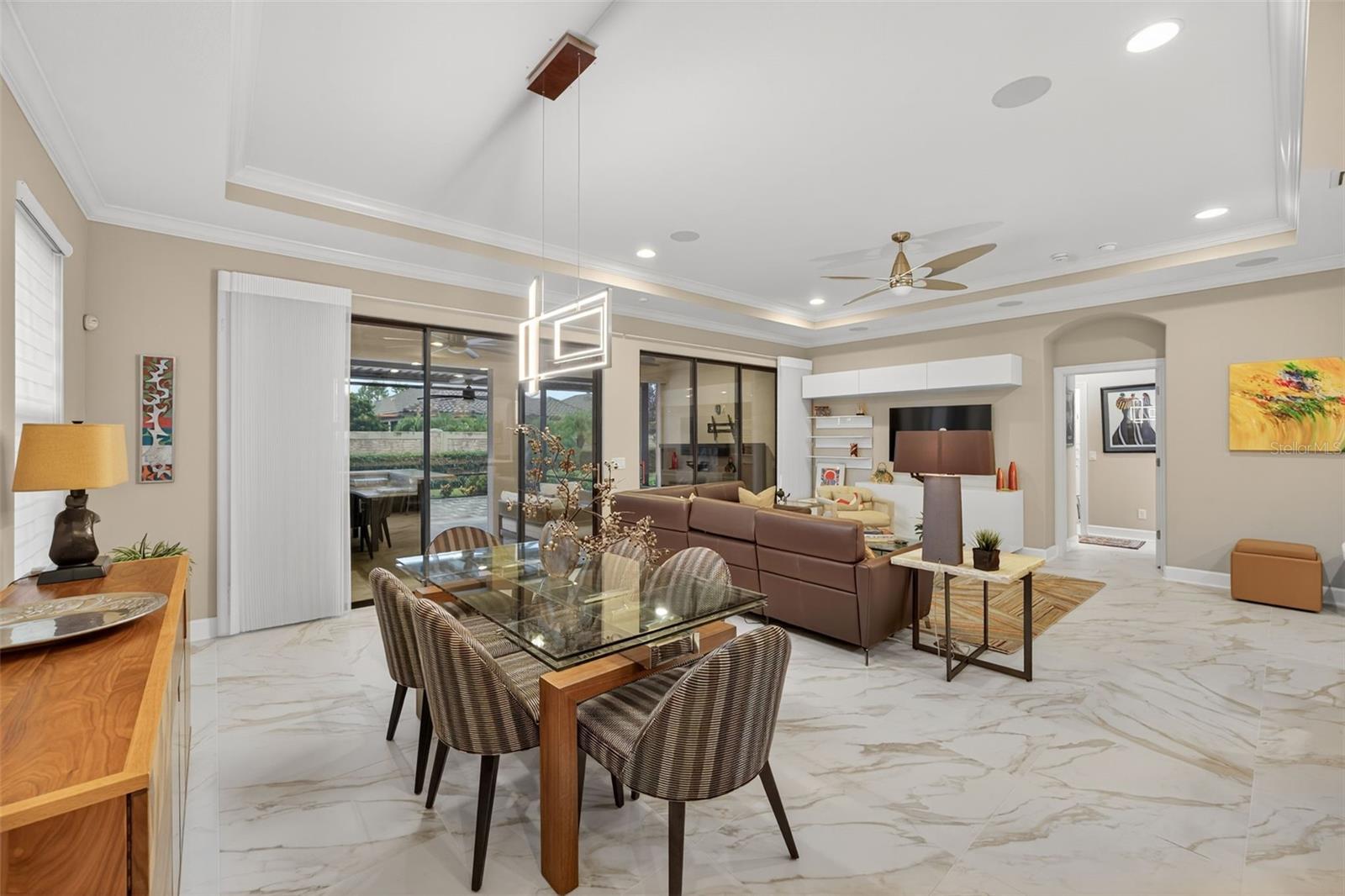Impeccably Upgraded Piceno Model | 2BR + Den | Outdoor Oasis & Designer Touches! Welcome to this beautifully upgraded 2-bedroom, 2-bath Piceno model featuring thoughtful design, high-end finishes, and exceptional indoor-outdoor living. The gourmet kitchen is a true showstopper with an oversized Cambria quartz island offering extra storage, a custom pantry, stainless steel LG appliances, built-in desk, wine fridge, and under-cabinet lighting. Ideal for entertaining or everyday living, it seamlessly connects to the open-concept great room with tray ceilings, built-in surround sound (indoors & outdoors), and Hunter Douglas motorized shades on the sliders. Step outside to your extended lanai oasis featuring newer pavers, Storm Smart roll-down shades, and a fully equipped outdoor kitchen with granite countertops, built-in grill, side burner, sink, fridge, and ice chest—perfect for hosting guests or unwinding in peace. The spacious primary suite boasts dual custom walk-in closets, Cambria quartz dual vanities, and a luxurious walk-in shower. Ceramic tile flows through the main living areas, while both bedrooms feature plush carpet and plantation shutters. The private den offers double French doors, LED lighting, custom built-ins, and interior roll-down shades—ideal for a guest space or home office. The laundry room is both functional and stylish with built-in cabinetry and an LG front-load washer & dryer with pedestals. Major systems are move-in ready with a new A/C and water heater (2023), whole-house generator, Ring doorbell, motion-sensor lighting, and full alarm system. The garage impresses with epoxy flooring, custom cabinets, workbench, and overhead storage. Ceiling fans throughout complete the comfort-focused upgrades. THIS IS A NON-GOLF HOME. Esplanade offers a wide array of amenities and activities such as an 18-hole championship golf course, two resort pools, hot tubs, resistance pool, pickleball, tennis, bocce ball, two fitness centers, exercise classes, two dog parks, firepit, spa/salon, an on-site lifestyle director, social events, and various clubs plus a Tiki bar. The state-of-the-art Culinary Center offers residents several dining options such as the Barrel House as well as catering services, wine tastings, and special events. THE CHANDELIERS IN THE FOYER AND DINING ROOM, THE WHITE SHELVING IN THE FAMILY ROOM DO NOT CONVEY. This home is the perfect blend of style, function, and peace of mind—schedule your private tour today. There are camera at the front door and on the lanai.