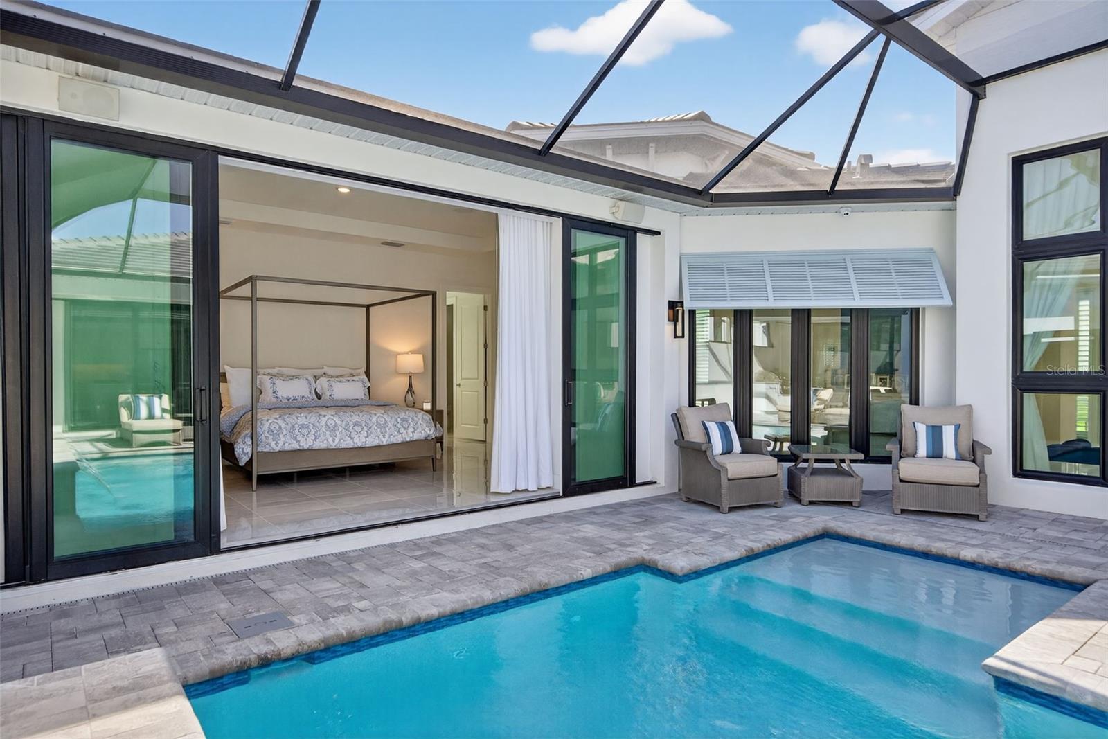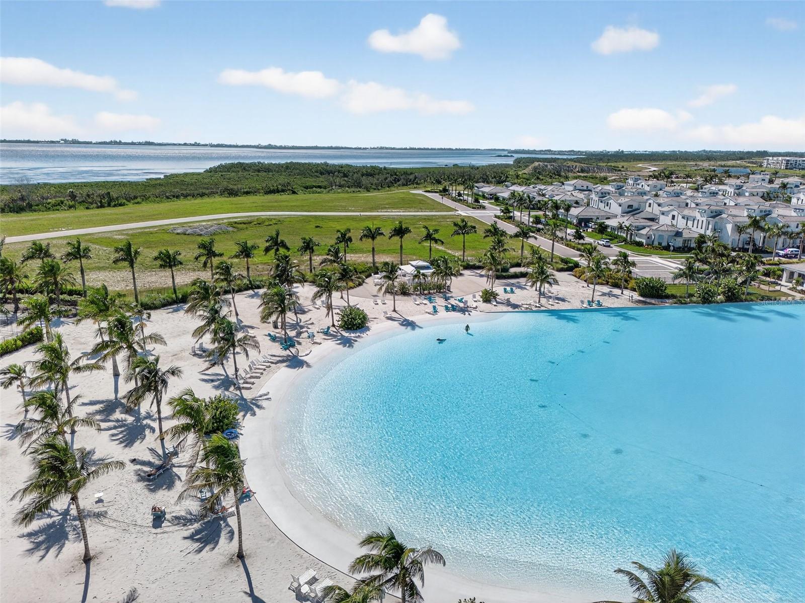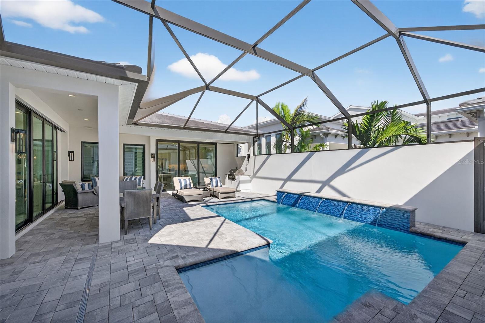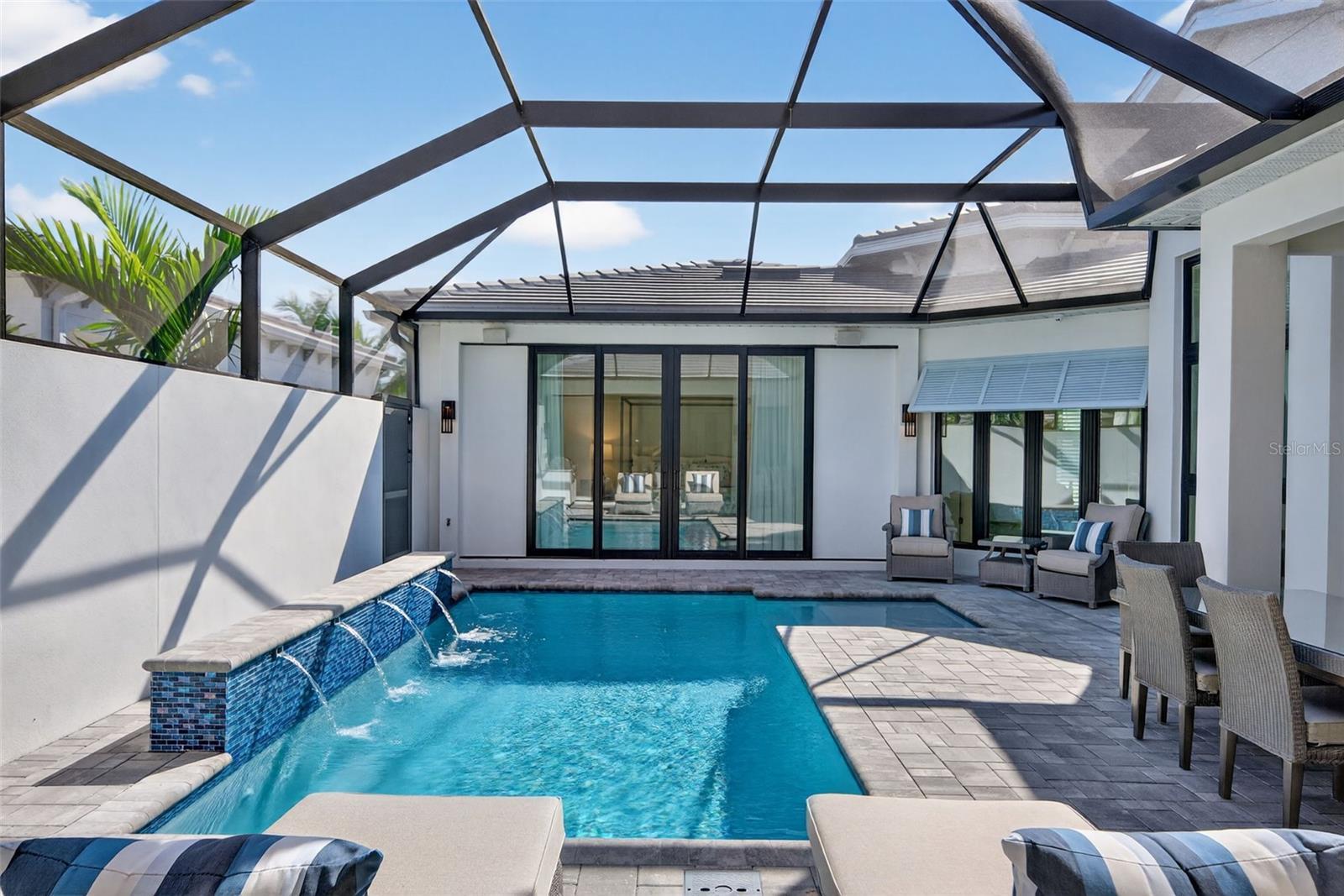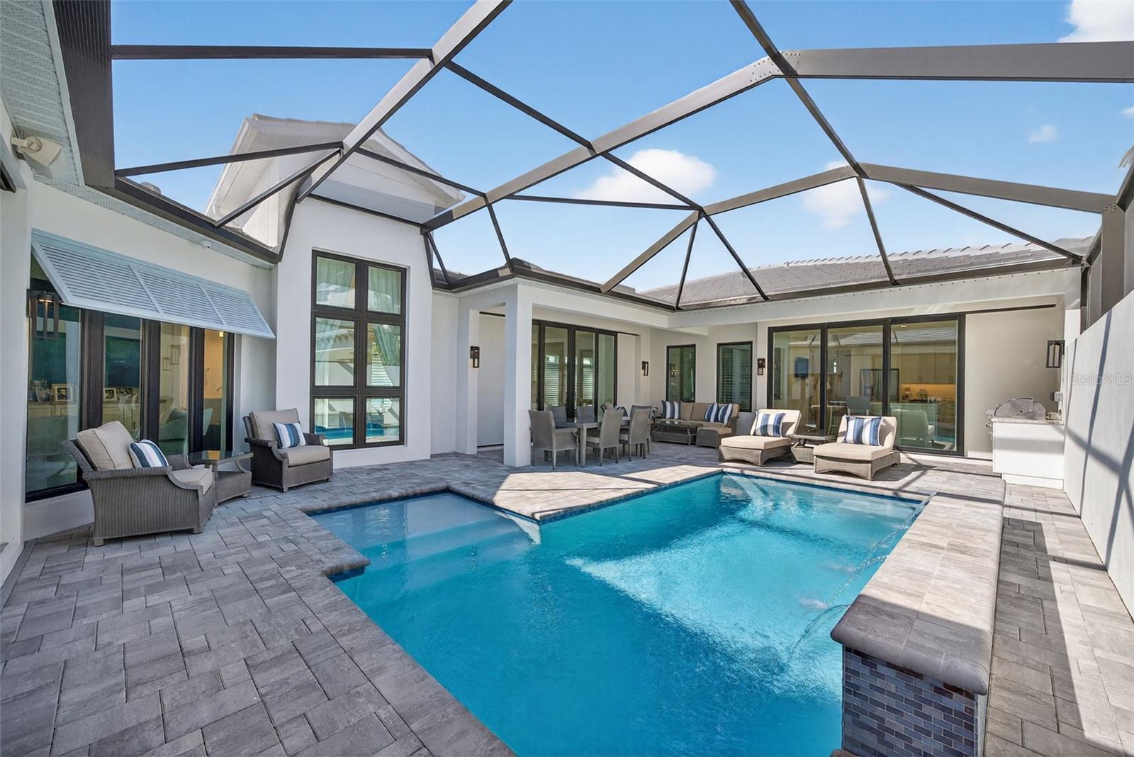 Under contract-accepting backup offers. OWNER RELOCATING! Step behind the gates of Aqua Lagoon, Bradenton’s premier waterfront community celebrated by the Parade of Homes and home to a 4-acre crystalline lagoon and private beach. This extremely popular, beautifully built, one-story Cat Claw model (which is no longer available in new phases) offers a rare opportunity to own a thoughtfully designed home that blends modern coastal elegance with relaxed Florida living. With 3 bedrooms, 3 bathrooms, and 2,700 sq. ft. of living space, the single-level layout is both spacious and effortless, perfect for everyday comfort and entertaining. Set on a premium lot, the home features an oversized caged pool, spa, and courtyard that create a private outdoor oasis not found in newer phases of the development with smaller lots. Inside, soaring ceilings, wide sliding doors, marble floors, designer lighting, and plantation shutters fill the home with light and airiness. The open floor plan includes formal living and dining areas, plus a stylish wet bar with beverage fridge and custom shelving. The chef’s kitchen is appointed with high-end stainless appliances, built-in oven and microwave, gas cooktop, walk-in pantry, and a generous island. The primary suite offers a serene retreat with wood accents, patio access, a spa-inspired bath with dual vanities, walk-in shower, soaking tub, and custom closet. Two additional bedrooms, including a flexible office/den option, provide comfort and versatility. The 2-car garage with alley access adds built-in cabinetry and overhead storage. At Aqua Lagoon, the sparkling 4-acre lagoon pool and private beach are the centerpiece of community life, providing a resort-style atmosphere just minutes from Anna Maria Island, IMG Academy, SRQ Airport, UTC, and St. Armand’s Circle. Skip the wait for new construction — your move-in ready, one-story Florida paradise is here.