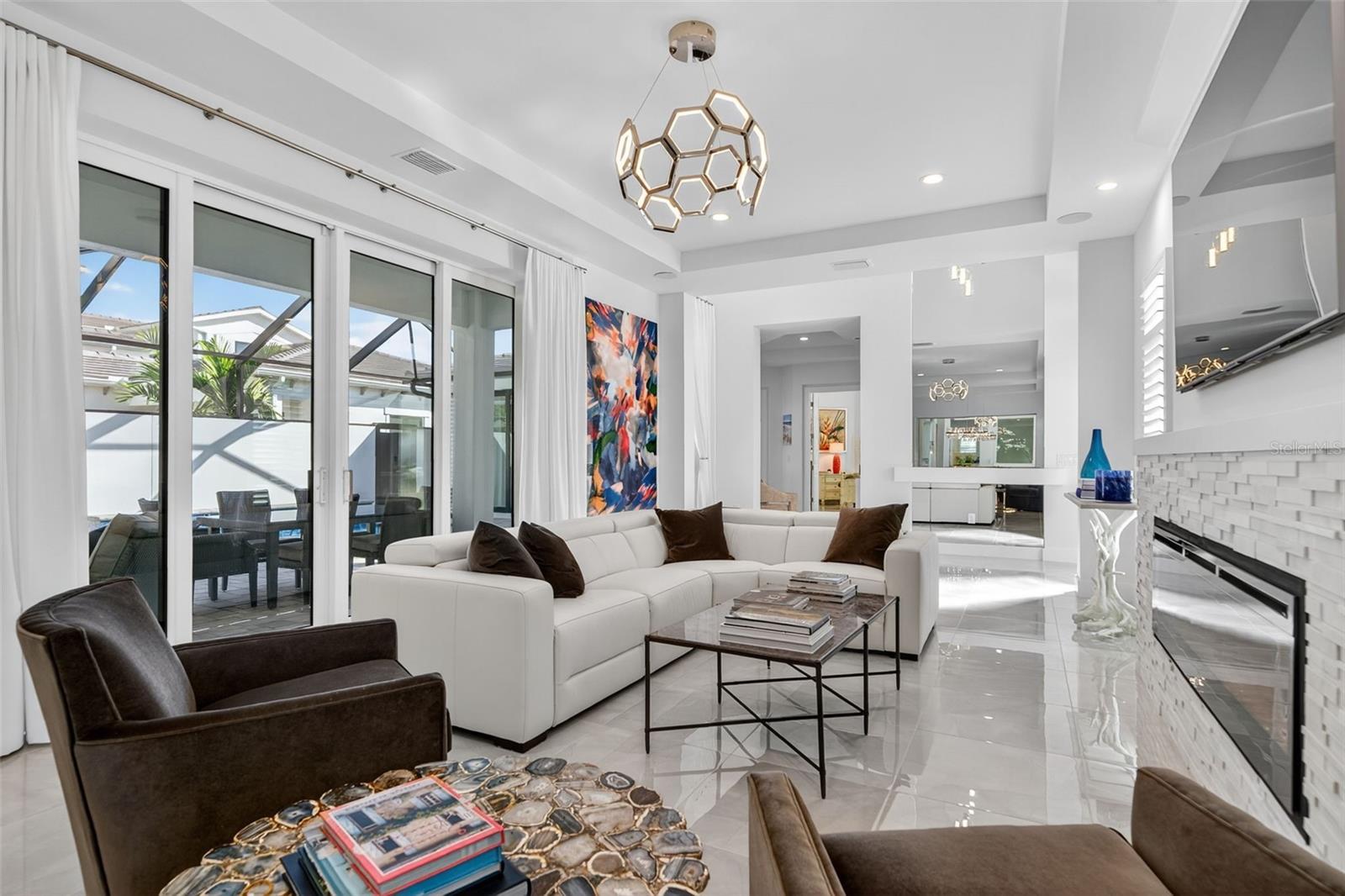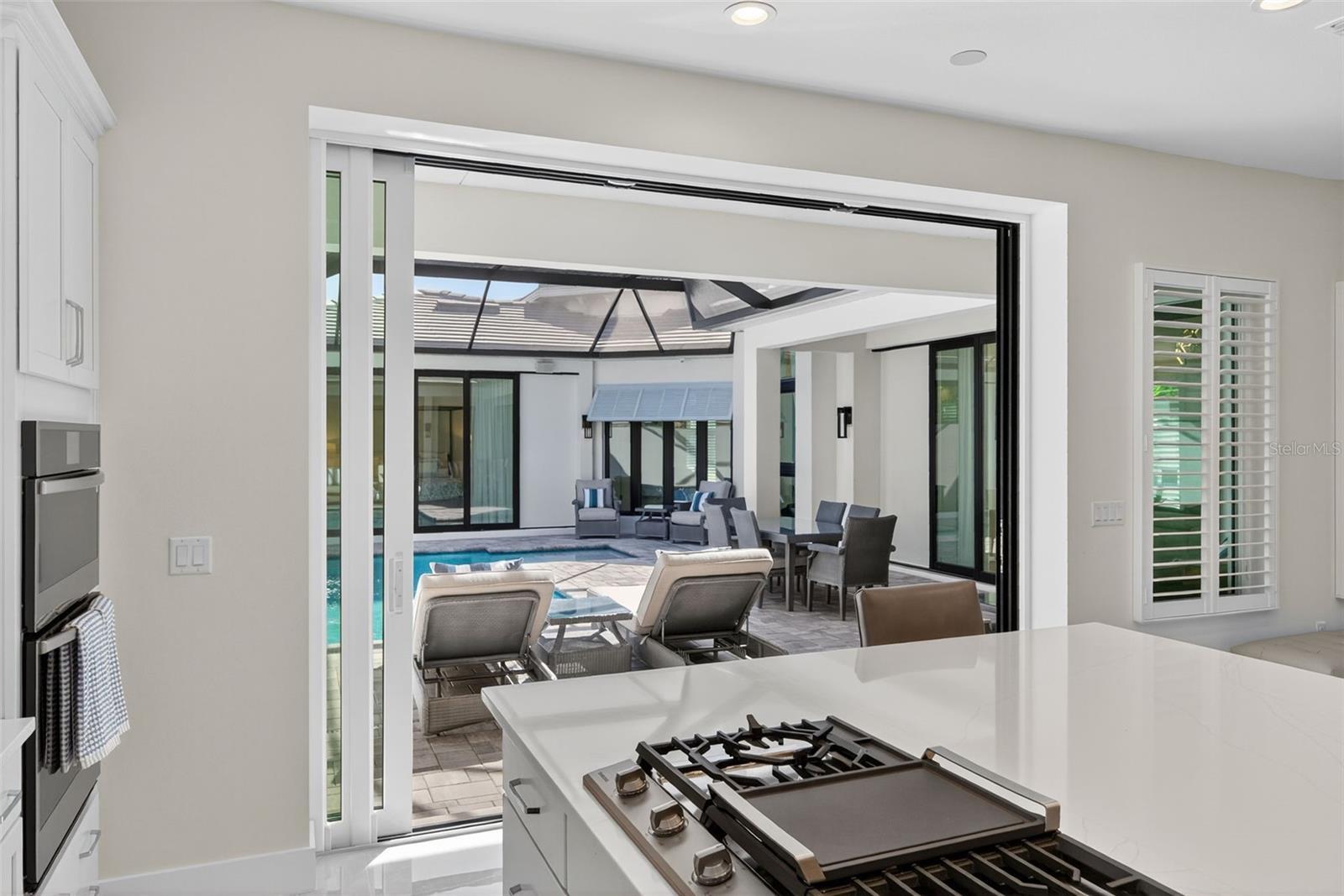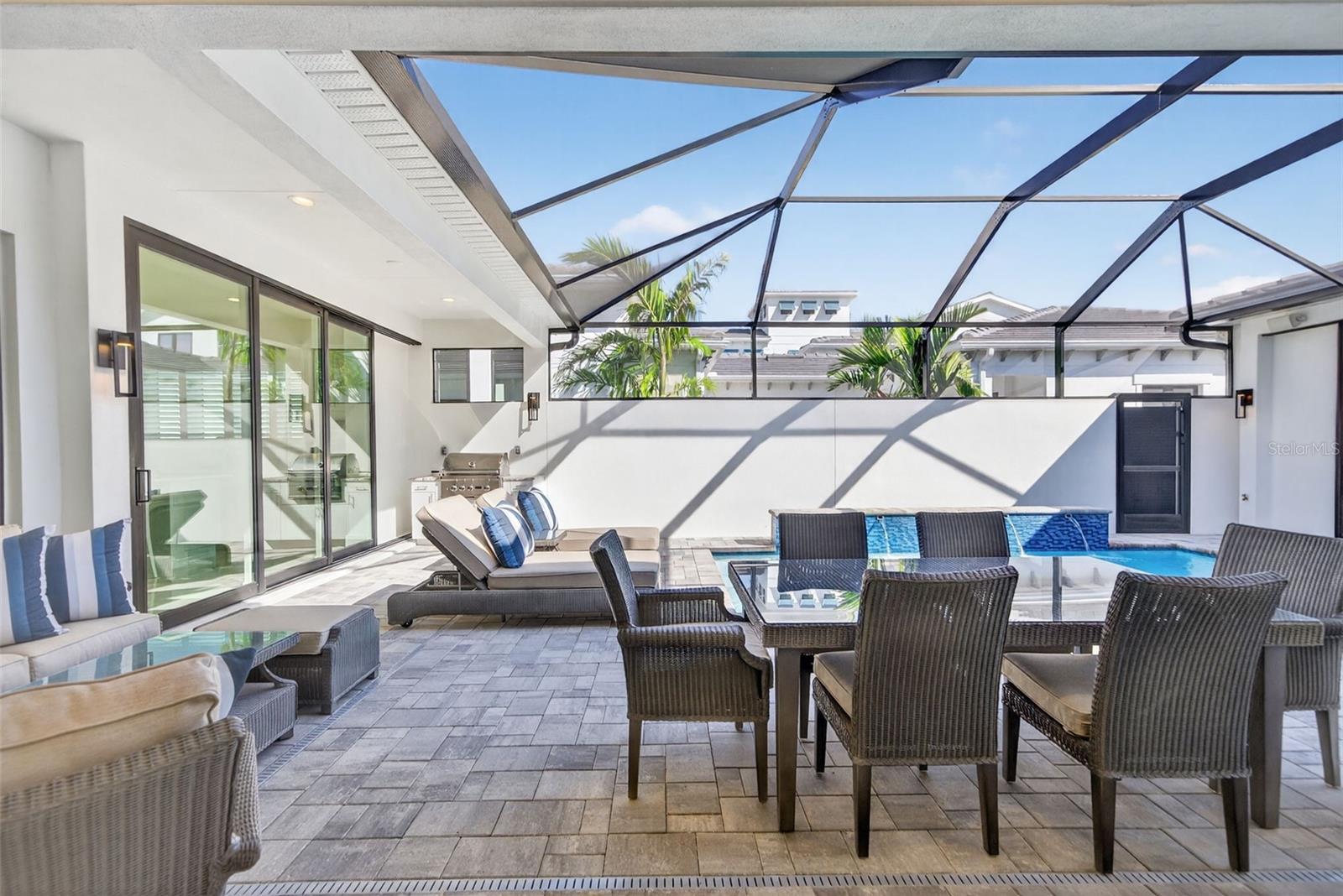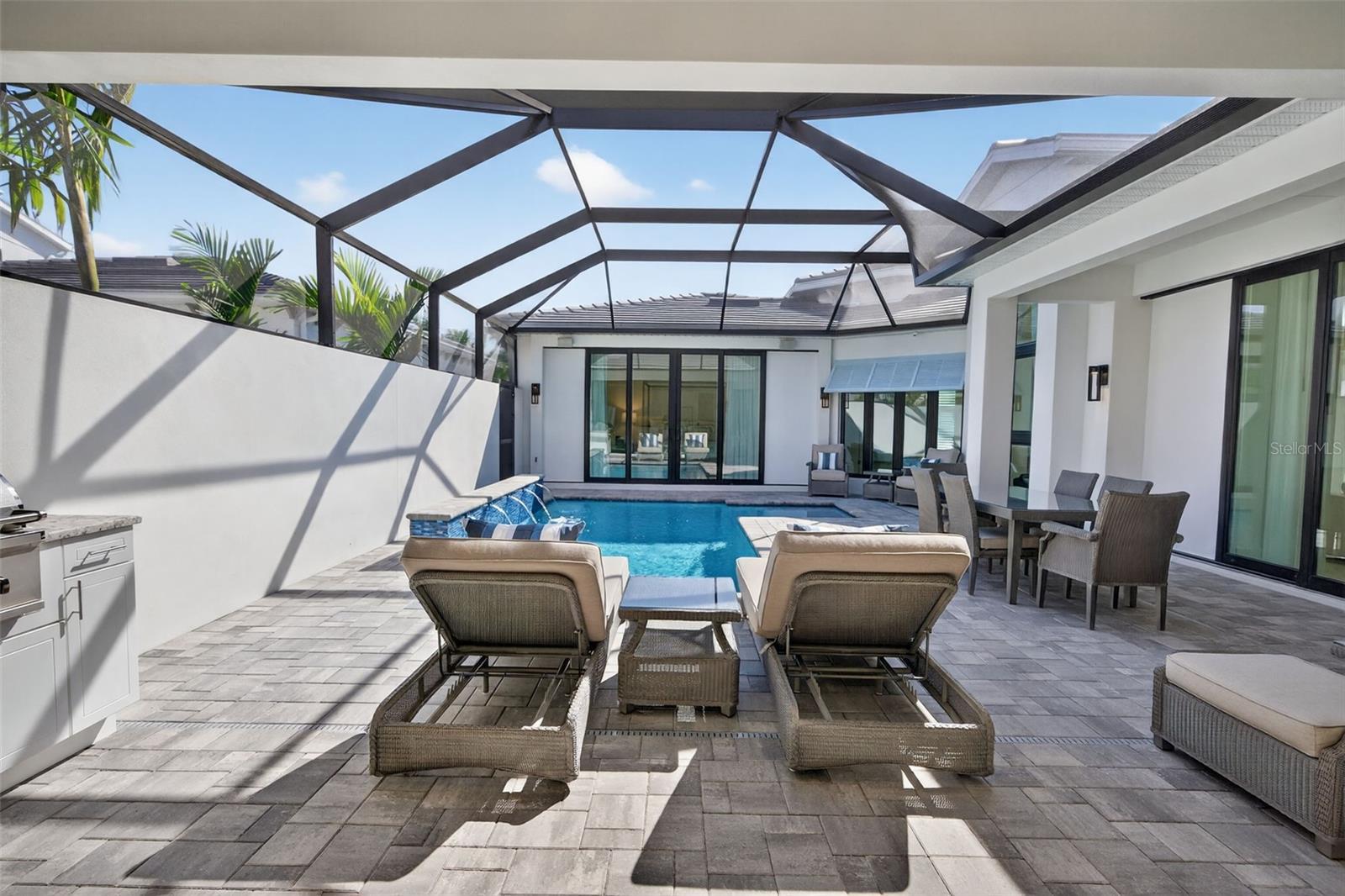 Under contract-accepting backup offers. OWNER RELOCATING! Step behind the gates of Aqua Lagoon, Bradenton’s premier waterfront community celebrated by the Parade of Homes and home to a 4-acre crystalline lagoon and private beach. This extremely popular, beautifully built, one-story Cat Claw model (which is no longer available in new phases) offers a rare opportunity to own a thoughtfully designed home that blends modern coastal elegance with relaxed Florida living. With 3 bedrooms, 3 bathrooms, and 2,700 sq. ft. of living space, the single-level layout is both spacious and effortless, perfect for everyday comfort and entertaining. Set on a premium lot, the home features an oversized caged pool, spa, and courtyard that create a private outdoor oasis not found in newer phases of the development with smaller lots. Inside, soaring ceilings, wide sliding doors, marble floors, designer lighting, and plantation shutters fill the home with light and airiness. The open floor plan includes formal living and dining areas, plus a stylish wet bar with beverage fridge and custom shelving. The chef’s kitchen is appointed with high-end stainless appliances, built-in oven and microwave, gas cooktop, walk-in pantry, and a generous island. The primary suite offers a serene retreat with wood accents, patio access, a spa-inspired bath with dual vanities, walk-in shower, soaking tub, and custom closet. Two additional bedrooms, including a flexible office/den option, provide comfort and versatility. The 2-car garage with alley access adds built-in cabinetry and overhead storage. At Aqua Lagoon, the sparkling 4-acre lagoon pool and private beach are the centerpiece of community life, providing a resort-style atmosphere just minutes from Anna Maria Island, IMG Academy, SRQ Airport, UTC, and St. Armand’s Circle. Skip the wait for new construction — your move-in ready, one-story Florida paradise is here.