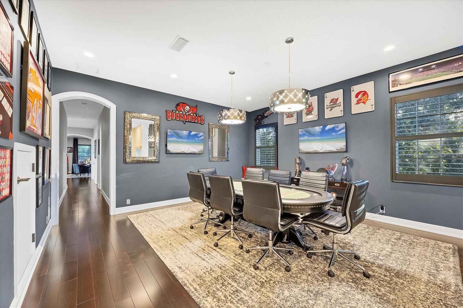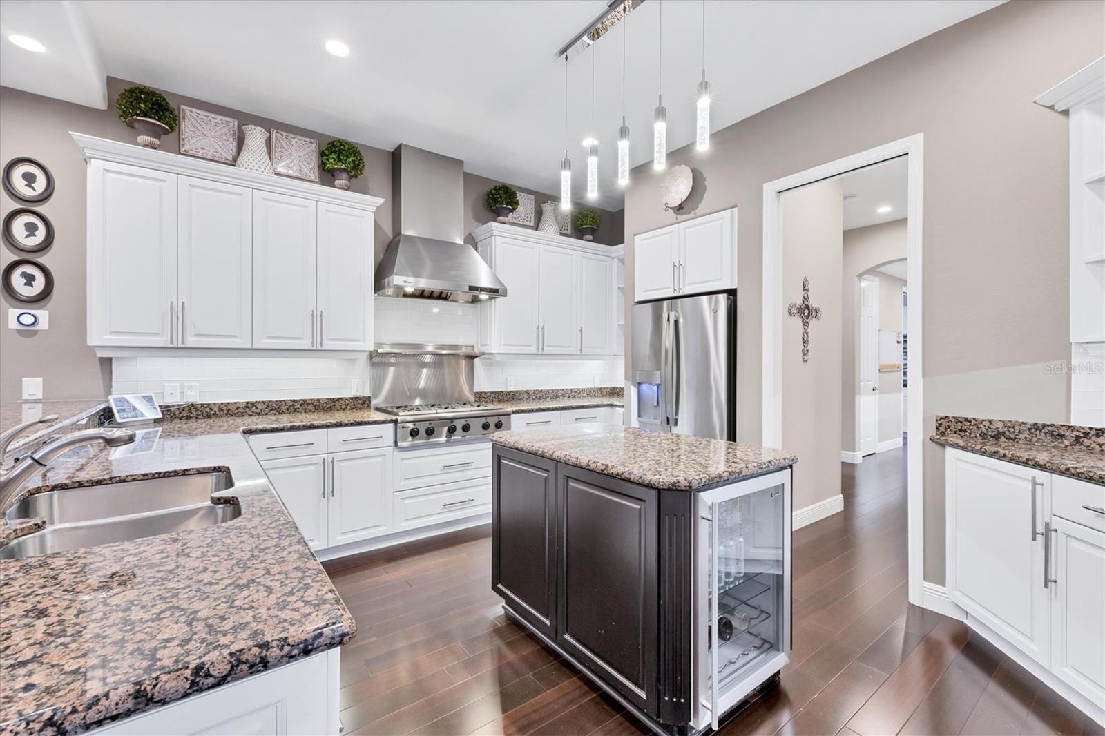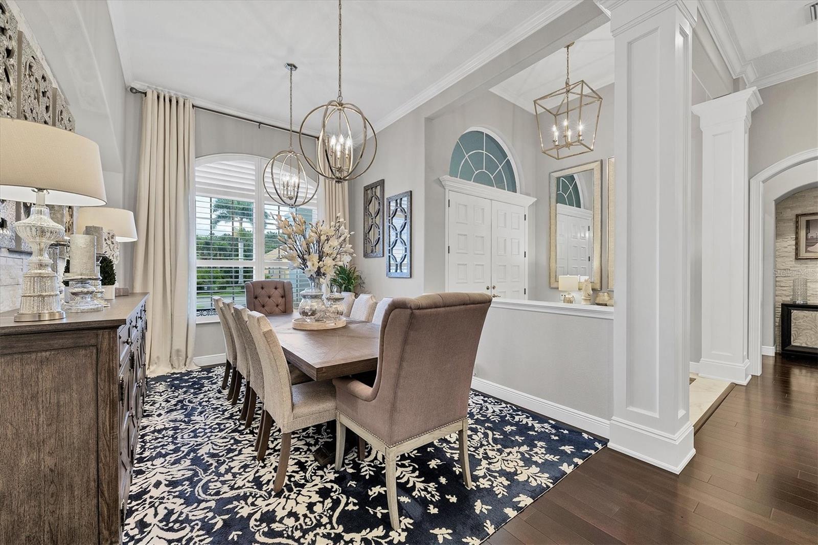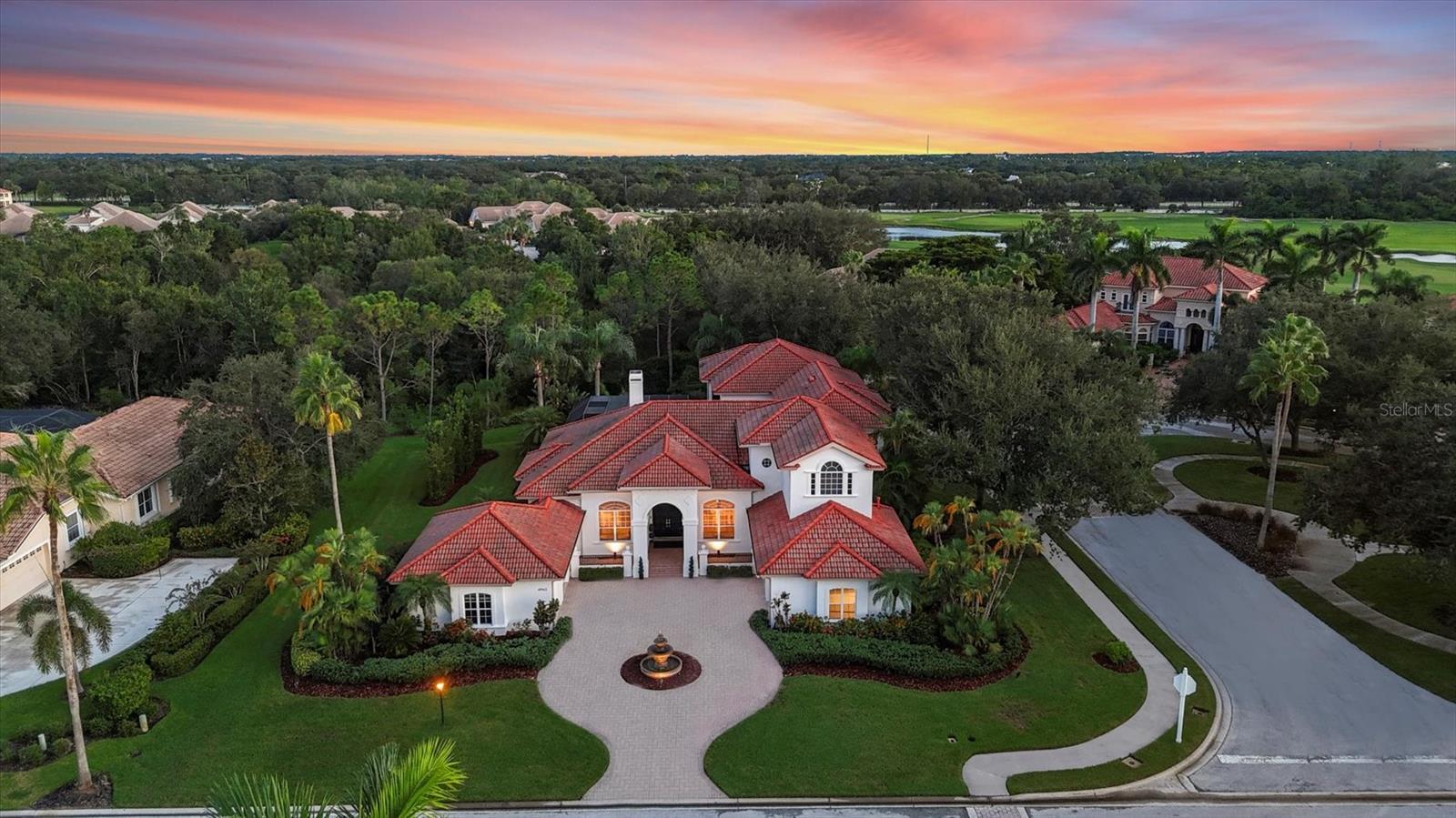 On a private cul-de-sac next to a quiet park within the exclusive, gated enclave of Lakewood Ranch Country Club, this stunning five-bedroom estate offers nearly 6,000 square feet of updated, luxury living designed for grand entertaining and everyday comfort. A beautifully manicured lawn, circular driveway, and striking fountain set the stage as you approach the stately double-door entry. Go inside to an impressive foyer, where 36-by-36-inch porcelain tile laid on the diagonal sets the tone. Soaring tray ceilings, dramatic stone accents, a warm gas fireplace, and rich wood floors flow seamlessly throughout the main living spaces. To the right, an elegant formal dining room is appointed for dinner parties, while to the left, a private office framed by double glass doors provides an ideal retreat. At the heart of the residence, the open kitchen and family room create an inviting gathering space. The chef’s kitchen is appointed with professional-grade appliances, a six-burner gas stovetop, granite counters, prep island, breakfast bar and large walk in pantry. A spacious eat-in nook comfortably accommodates family meals, while the family room showcases stone feature walls, wood-beamed tray ceilings, and expansive sliding glass doors that invite the outdoors in. The primary suite is a luxurious retreat, with tall ceilings, sliding glass doors that open to the lanai and two expansive custom walk-in closets. The en-suite bath is equally impressive, featuring a deep soaking tub, oversized walk-in shower and split vanities—one thoughtfully designed with a vanity area—blending beauty and function for daily living. The first floor also hosts a thoughtfully designed bedroom layout, including two bedrooms with a shared Jack and Jill bath, and a large bonus room that can serve as an additional bedroom or flex space. An adjacent bedroom features a generously sized walk-in closet and shares a full bath, ensuring comfort for family and guests alike. Upstairs, a bonus loft with its own summer kitchen and covered lanai extends the entertainment space, complemented by a dedicated media room for movie nights. An additional bedroom and a versatile room—ideal as a second office, bedroom or lounge—that opens to the upstairs lanai, complete the upper level. Go outside to your private paradise, where a resort-style pool and spa are surrounded by a spacious lanai with ample lounging and dining areas. A full outdoor kitchen elevates alfresco living. This exceptional residence offers abundant space for family and guests, an entertainer’s flow, and the finest details of luxury living such as side-facing garages with ample space for four cars and storage as well as a convenient drop zone just inside to keep belongings tidy. As a resident of Lakewood Ranch Country Club, you’ll enjoy access to a prestigious, planned community known for its world-class amenities and vibrant social life. The private country club offers three championship golf courses, tennis and pickleball courts, a state-of-the-art fitness center, resort-style pools and fine dining venues. Miles of walking trails, lush preserves and beautifully landscaped grounds provide a serene backdrop, while Lakewood Ranch Main Street and Waterside Place offer boutique shopping, dining and cultural events just minutes away.