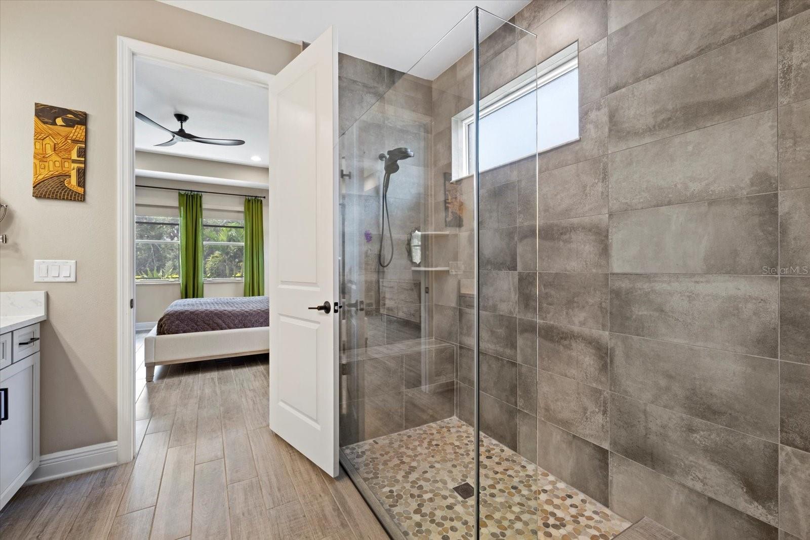 - Ceiling Fans(s), High Ceilings, Open Floorplan, Primary Bedroom Main Floor, Solid Surface Counters, Stone Counters, Thermostat, Tray Ceiling(s), Walk-In Closet(s)