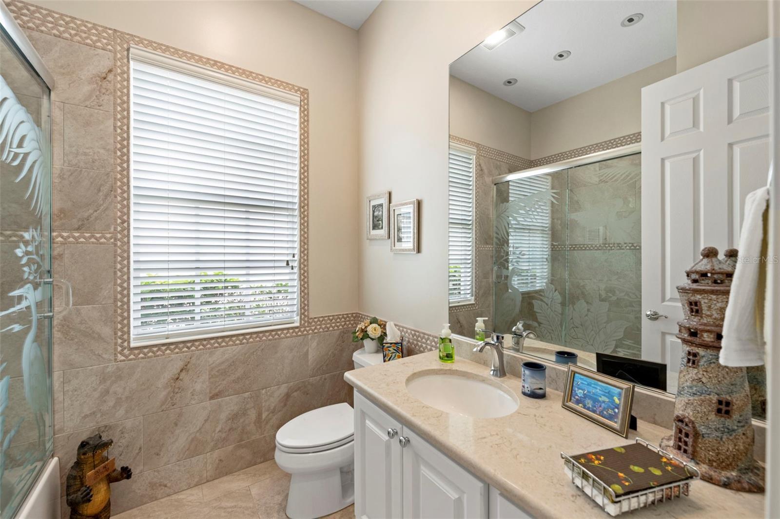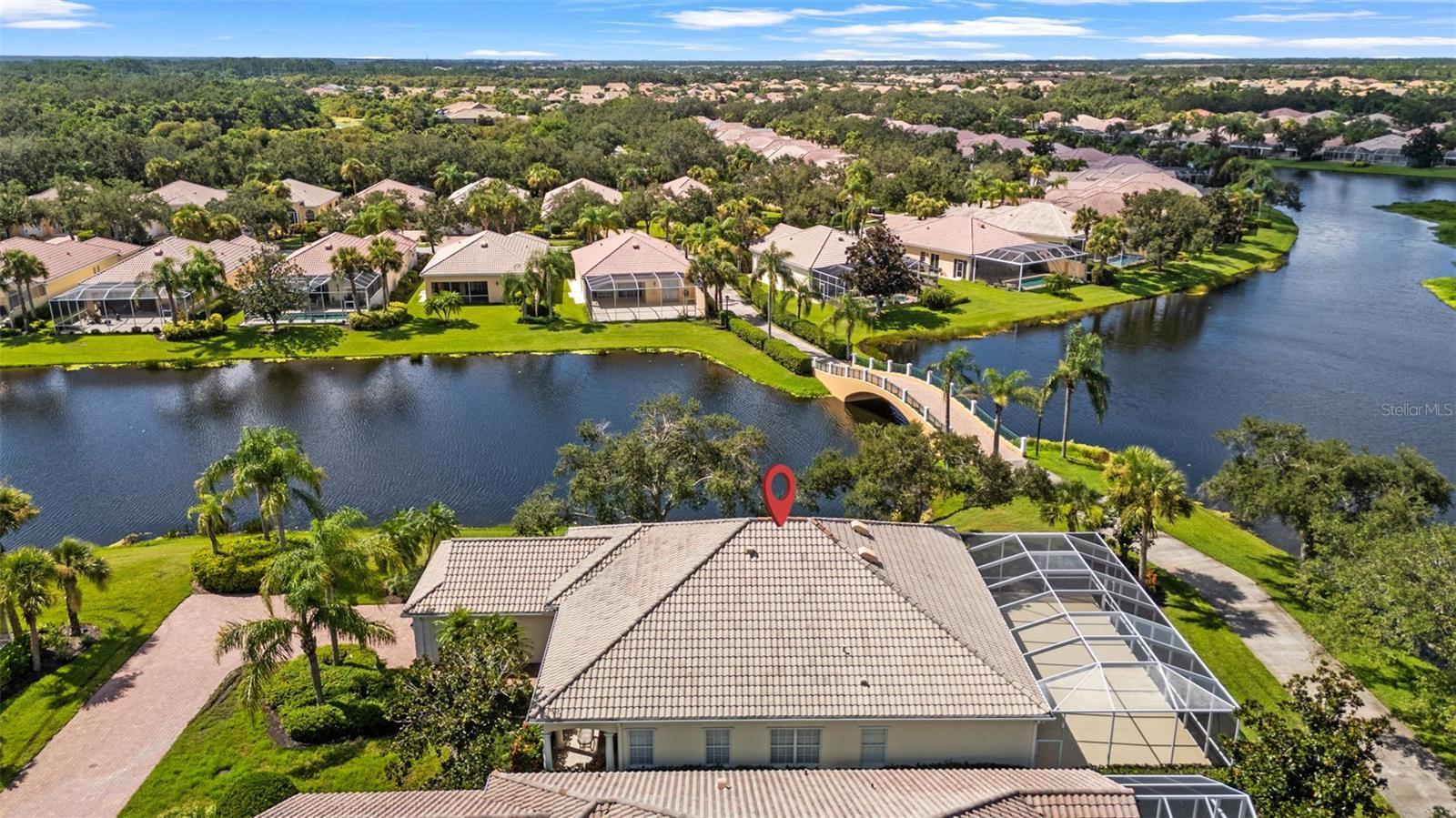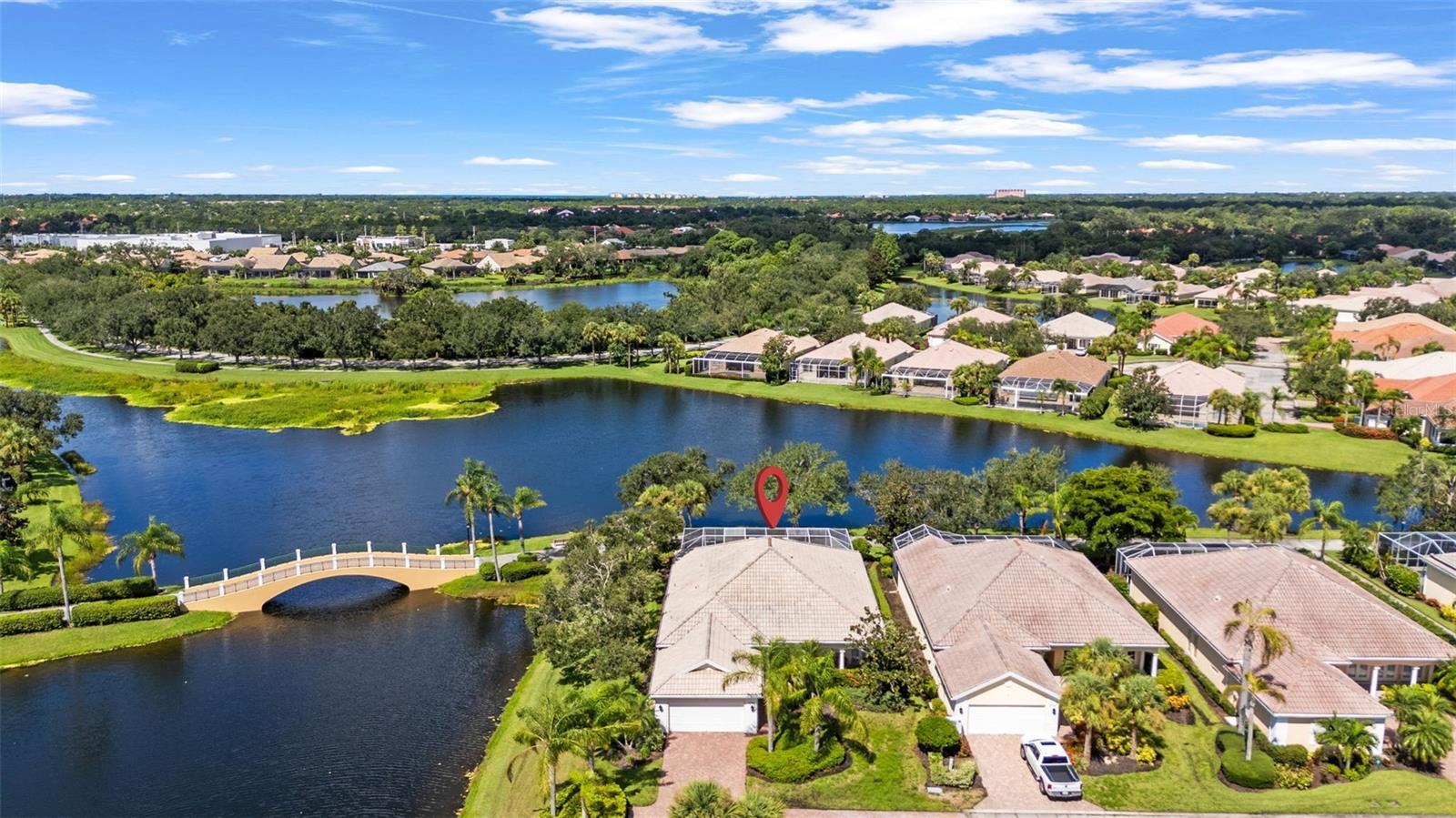 Under contract-accepting backup offers. One or more photo(s) has been virtually staged. Exceptional Waterfront Carlyle Home on a Cul-de-Sac! Located in the sought-after community of VillageWalk, this beautifully maintained 4-bedroom Carlyle model offers a spacious open floor plan and sits on a premium waterfront lot with water on two sides. Enjoy peaceful outdoor living with an awning-covered lanai and extra deeded driveway space for added convenience. Interior features include 10- and 12-foot ceilings, neutral ceramic tile flooring throughout the main living areas (2018), crown and detail moldings, motorized blinds in the front of the home, and a cozy fireplace in the living room. The family room boasts a built-in wall unit, perfect for entertainment and storage. The kitchen is designed for both function and style with Corian countertops, a closet pantry, and a newer microwave. The guest bathrooms feature updated quartz countertops, while the primary bathroom includes granite counters, a soaking tub, walk-in shower, vanity table, and generous storage with a walk-in closet plus three additional closets. One of the guest bedrooms includes a built-in setup ideal for a home office. Other recent updates include a brand-new hot water heater, cabinets in garage and an A/C system from 2017. DiVosta built to last with poured concrete reinforced construction. VillageWalk is a guard-gated, resort-style community offering outstanding amenities: clubhouse, restaurant, tiki bar, boutique, salon, 6 Har-Tru tennis courts, pickleball, bocce ball, lap pool, heated lagoon pool, and miles of walking and biking trails. Golf carts welcome! Conveniently located near Siesta Key Beach, dining, shopping, and top medical facilities. Full-time HOA manager on-site. Call today for your private showing.