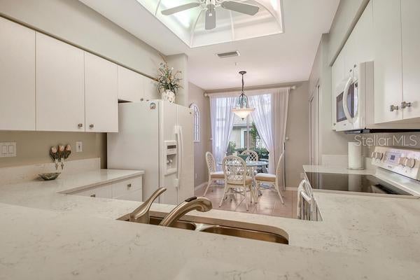 AVAILABLE MAY 2026 FORWARD: GROUND FLOOR VERANDA ON THE GOLF COURSE is bright and cheerful and tastefully decorated and sure to delight, 2 bedroom, 2 bath with front and rear lanai space - rear lanai is glassed and screened providing extra living space - and there is a one-car garage. King bed in the master bedroom with an adjoining updated bathroom with walk-in shower, queen bed in 2nd bedroom adjacent to a full bathroom. Kitchen with eating space, pantry, quartz countertops, and newer cabinets, is separated from the dining area with a breakfast bar. There is tile in the main living area and carpets in the bedrooms. There is no membership offered with this residence; however, you can dine at the clubhouse and the Fairway Veranda's heated pool is right across from the condo. The complex borders the Legacy walking and biking trail access, is less than 15 minutes from Siesta Key beaches, the village shops and restaurants. You can be downtown Sarasota in 25 minutes to enjoy the culinary and cultural flavors that Sarasota offers. This is a vacation condo that will not disappoint.