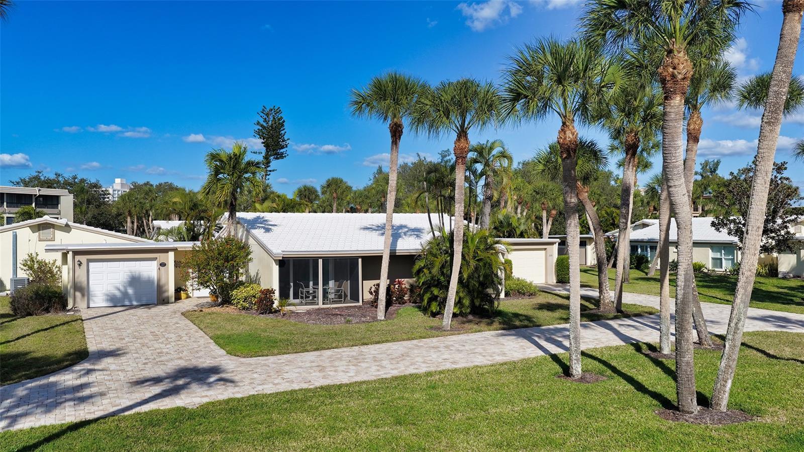 This beautifully reimagined, 3 bed/2 bath, detached freestanding villa with garage in the GULF FRONT property of Whispering Sands has been thoughtfully updated from top to bottom in 2025, offering 1,327 square feet of sophisticated, light-filled living space – blending modern style with effortless comfort. NEW 2025 villa roof. Elegant finishes include fresh interior paint, crown molding, textured ceilings, recessed lighting throughout, ceramic tile flooring in the main living areas, and newly carpeted bedrooms. At the heart of the home is a NEW open kitchen designed for both style and function, featuring granite countertops, breakfast bar, stainless Whirlpool appliances, abundant soft-close cabinetry, and pantry with convenient pull-out drawers. Recessed and under cabinet lighting complete this inviting space. NEW hurricane impact sliders in the living areas and bedrooms provide total peace of mind. A spacious brick paver patio creates an ideal setting for sunny relaxation, entertaining, or grilling under the stars. Both bathrooms have been tastefully updated with granite countertops, soft-close cabinetry, modern fixtures, lighting, and glassed walk-in showers. NEW full sized washer and dryer. Community enhancements include scheduled exterior pressure washing and villa painting in January 2026, with beautiful new landscaping to follow. FURNITURE minus a small exclusion list is included with the sale of the property. Conveniently located next door to the colorful boutiques & restaurants of Siesta Key Village, Whispering Sands is a 55+ GULF FRONT property offering 800' of PRIVATE beach, two heated pools, beachside Tiki Hut & gas grills, shuffleboard, & canoe/kayak storage. The main clubhouse is currently undergoing complete remodeling and will include fitness rooms, a full catering kitchen, large screen TV, and an elegant, comfortable space for entertaining. Well priced and truly move-in ready, this villa presents a rare opportunity for effortless, refined coastal living!