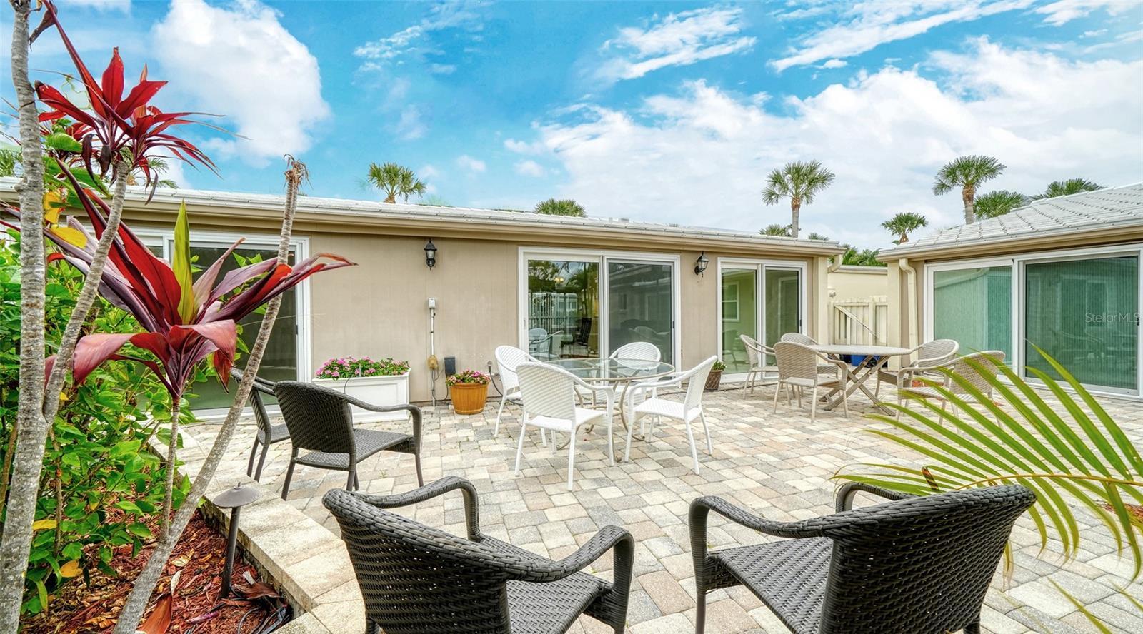 Welcome to your coastal retreat in the form of this secluded 2 bed/2 bath freestanding villa with one car garage in the premiere GULF FRONT property of Whispering Sands! This surprisingly large, 1,462 square foot property has been UPDATED in 2025 with fresh paint, new crown molding & baseboards, and new kitchen and baths. The exceptionally spacious living room provides space for multiple seating groups, while a wall of floor to ceiling sliders with southern exposure provides an abundance of natural light. Meal prep is easy in your NEW bright kitchen featuring white cabinetry & subway tile backsplash, granite counters, stainless Whirlpool appliances, recessed lighting, and vinyl plank flooring. Sets of new hurricane impact sliders conveniently open from the kitchen – as well as from your dining room and 2nd bedroom – into the newly fenced brick paver patio which offers valuable private outdoor space for sunny relaxation and effortless entertaining. Both newly carpeted bedrooms feature extended living space to accommodate a small seating group, desk, or exercise equipment. The bathrooms have been refreshed with new granite countertops, cabinets, vanities & fixtures. The dining room, primary bedroom, and patio FURNISHINGS are being offered with the sale of the property. NEW 2026 stacked washer/dryer in garage. Community enhancements include scheduled exterior pressure washing and villa painting in February 2026, with new landscaping to follow. Whispering Sands is a premiere 55+ condominium complex ideally located within walking distance to the colorful boutiques and myriad of dining options of Siesta Key Village, offering 800’ of PRIVATE beach, two heated pools, NEW beachside Tiki Hut, gas grills, shuffleboard, canoe/kayak storage, and onsite management. The main clubhouse is in the beginning stages of being completely remodeled and when completed will include fitness rooms, catering kitchen, and an elegant and comfortable space for social gatherings. Your coastal retreat awaits!