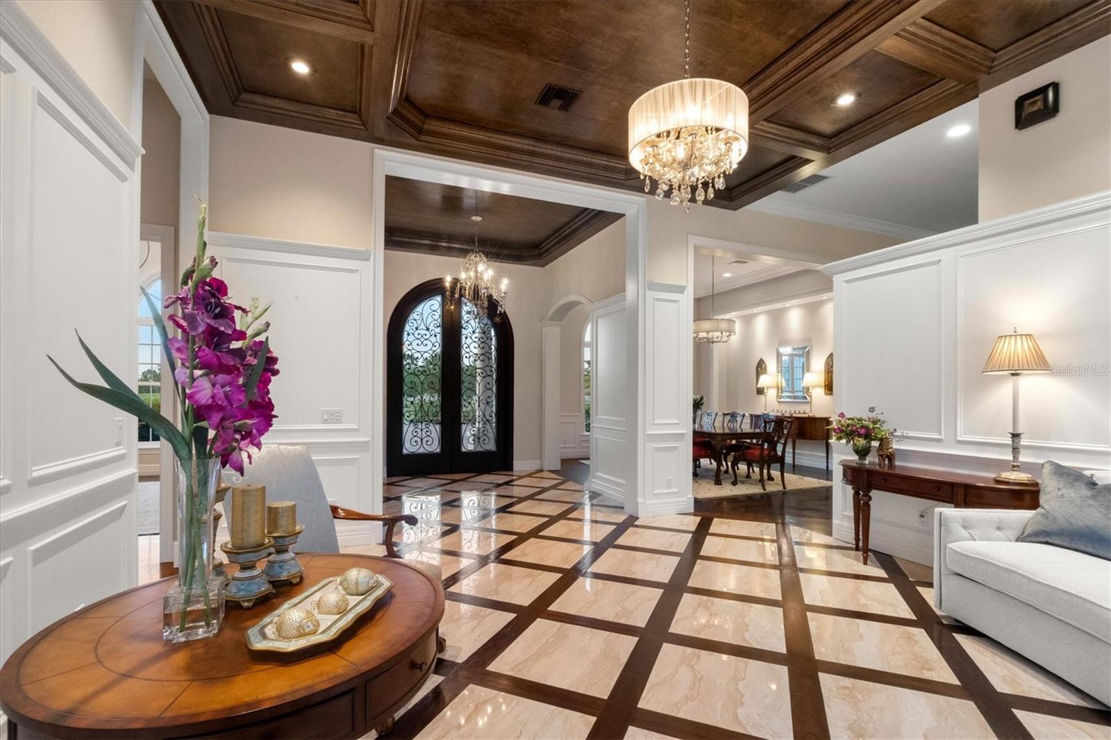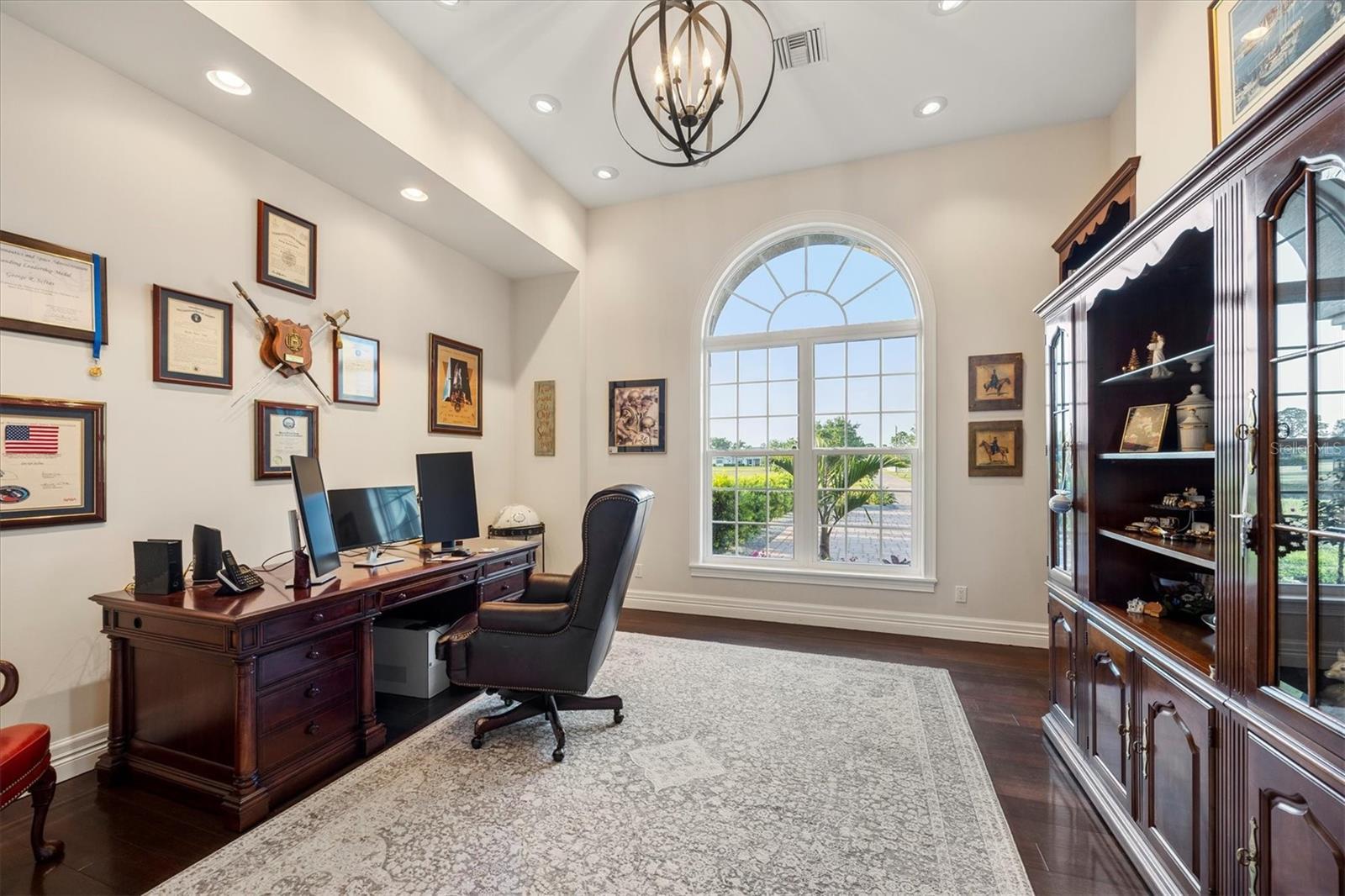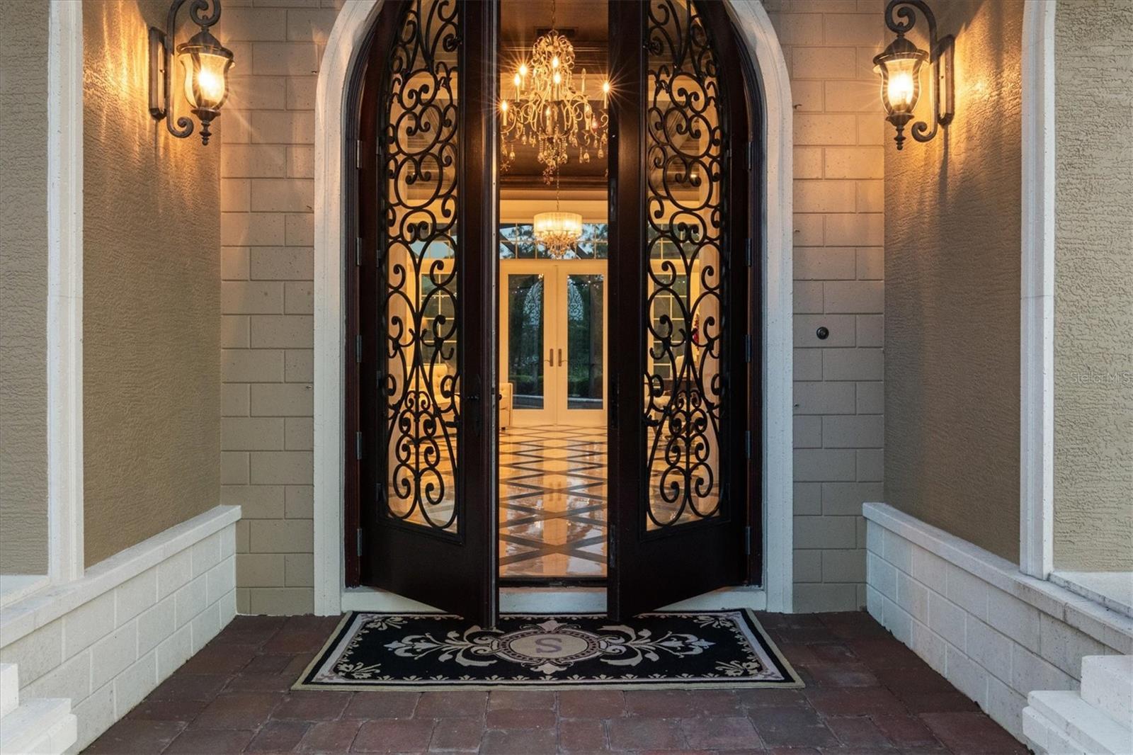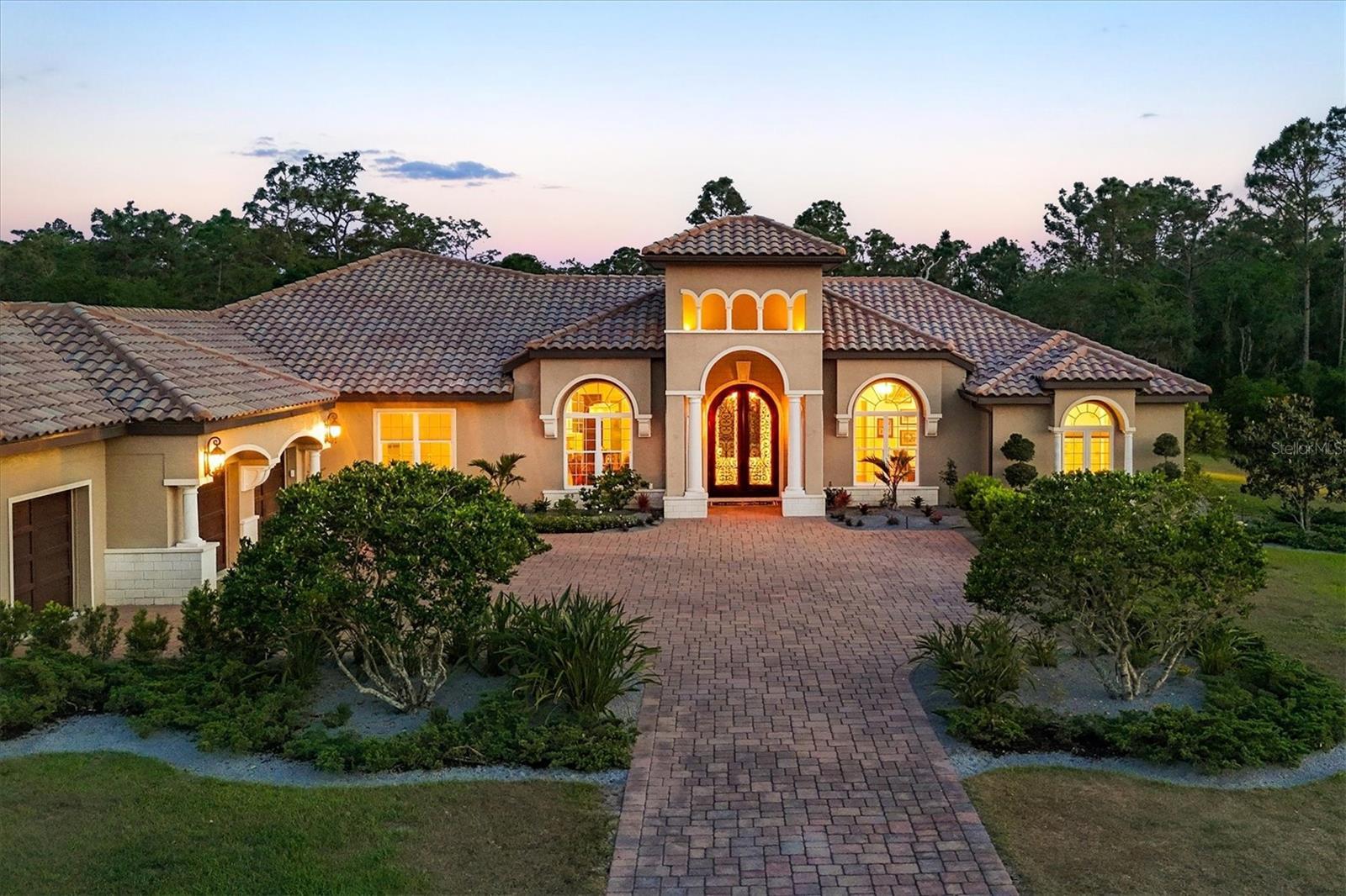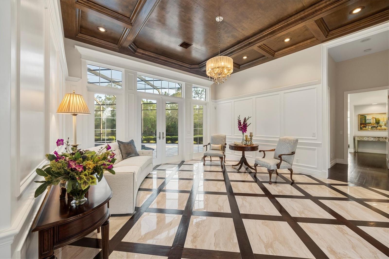 Set on over seven acres in the prestigious equestrian community of Panther Ridge, this custom-built estate offers refined single-story living surrounded by serene preserve views and a private lake. Thoughtfully designed for everyday living and elegant entertaining, the residence spans four bedrooms, four and a half baths, a dedicated office and a spacious bonus room, all underpinned by quality craftsmanship, security of impact-rated windows and front door, and impeccable overall design. A long, private drive leads to a stately entry framed by double-arched, hurricane-rated wood and glass doors with custom ironwork. Inside, high ceilings, architectural detailing, and a combination of rich wood and inlaid tile flooring create a sophisticated yet inviting atmosphere. Expansive windows bring in natural light and connect the interiors to the tranquil outdoor setting. The kitchen is professionally equipped with premium Dacor appliances, including a six-burner gas cooktop, wall oven, microwave drawer, built-in refrigerator and dishwasher. A custom pantry, custom-built breakfast banquette and seamless flow into the living room make this space ideal for everyday use and casual entertaining. A formal dining area is framed by tray ceilings and detailed millwork, offering a timeless setting for special occasions. The home’s guest accommodations include three well-appointed suites, two sharing a Jack and Jill bath, and a third with a private en suite and walk-in closet. A spacious bonus room with vaulted beamed ceilings offers flexibility as a media room, studio or play space. The home office, beautifully designed with custom built-in cabinets, provides a quiet and functional workspace. The expansive primary suite is a private retreat featuring dual walk-in closets and a spa-inspired bath with a freestanding soaking tub, walk-in shower with dual heads, dual vanities and elegant finishes throughout. Outdoor living is equally impressive. The screened lanai includes a saltwater heated pool and spa, an outdoor kitchen with built-in grill and multiple seating areas, all set against a private preserve. Limestone pavers and extensive landscaping elevate the outdoor experience. Additional features include whole-house water filtration and water softener systems, upgraded landscaping and thoughtful storage throughout. Minutes from Lakewood Ranch and close to top-rated schools, dining, shopping and Gulf Coast beaches, this estate offers the rare combination of privacy, luxury and convenience. Panther Ridge is known for its expansive homesites, equestrian trails and peaceful natural setting, making it one of Sarasota’s sought-after communities. This property is more than a residence, it’s an exceptional lifestyle opportunity.