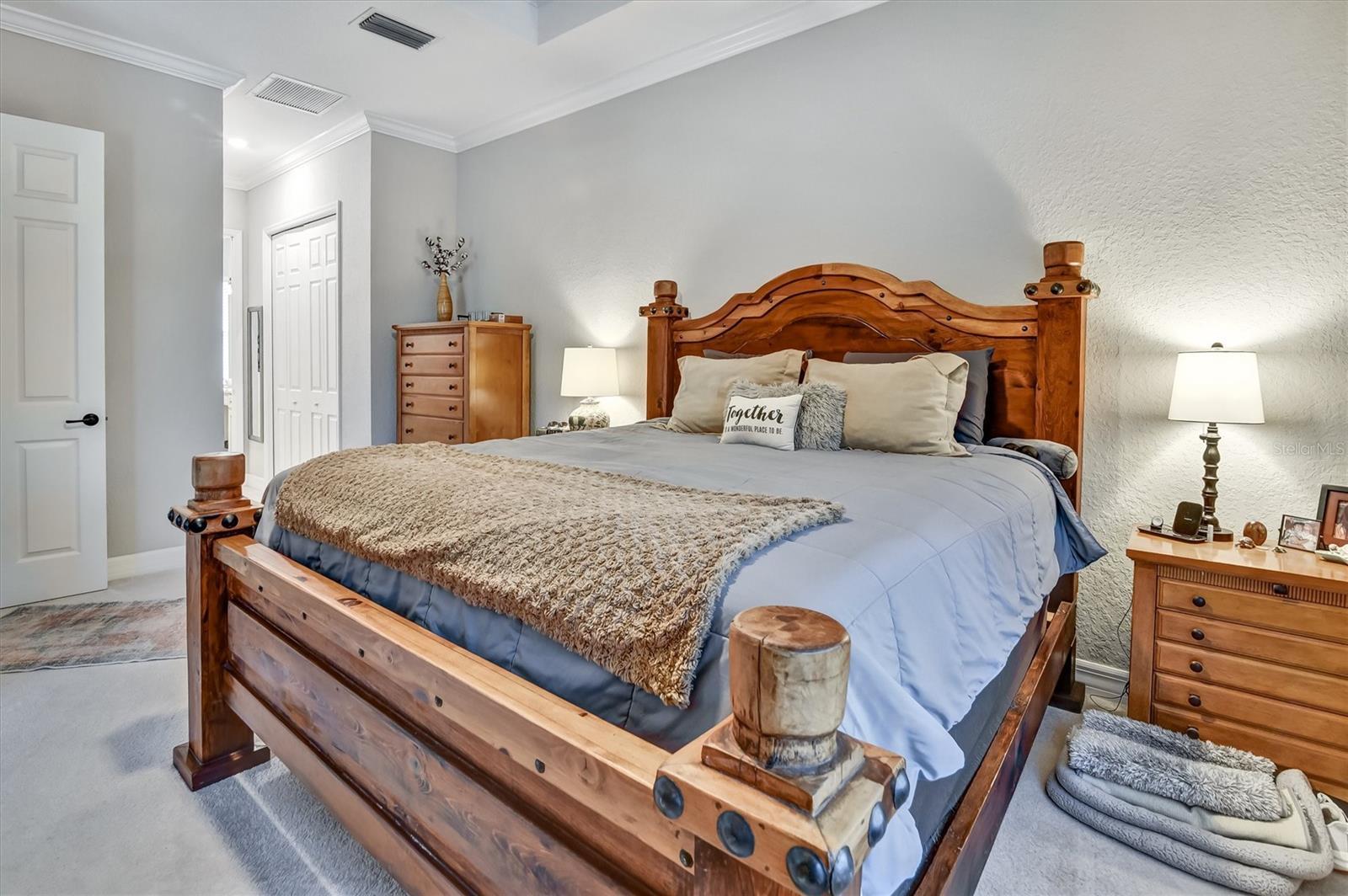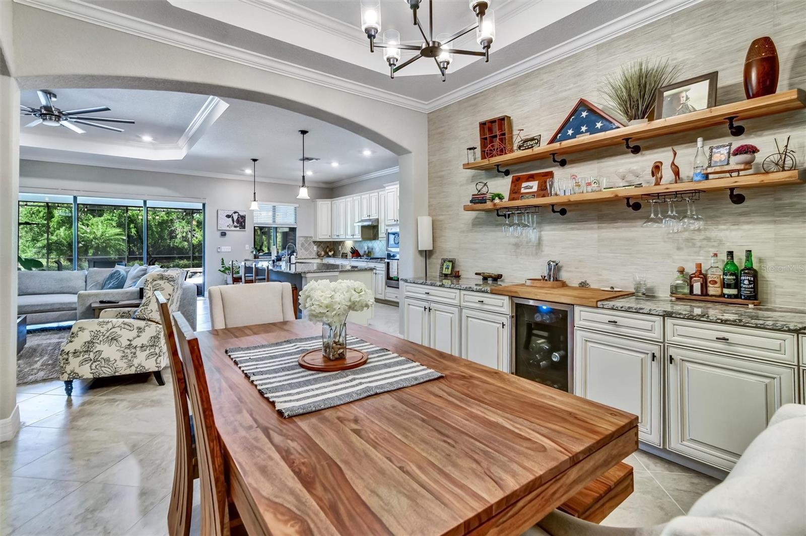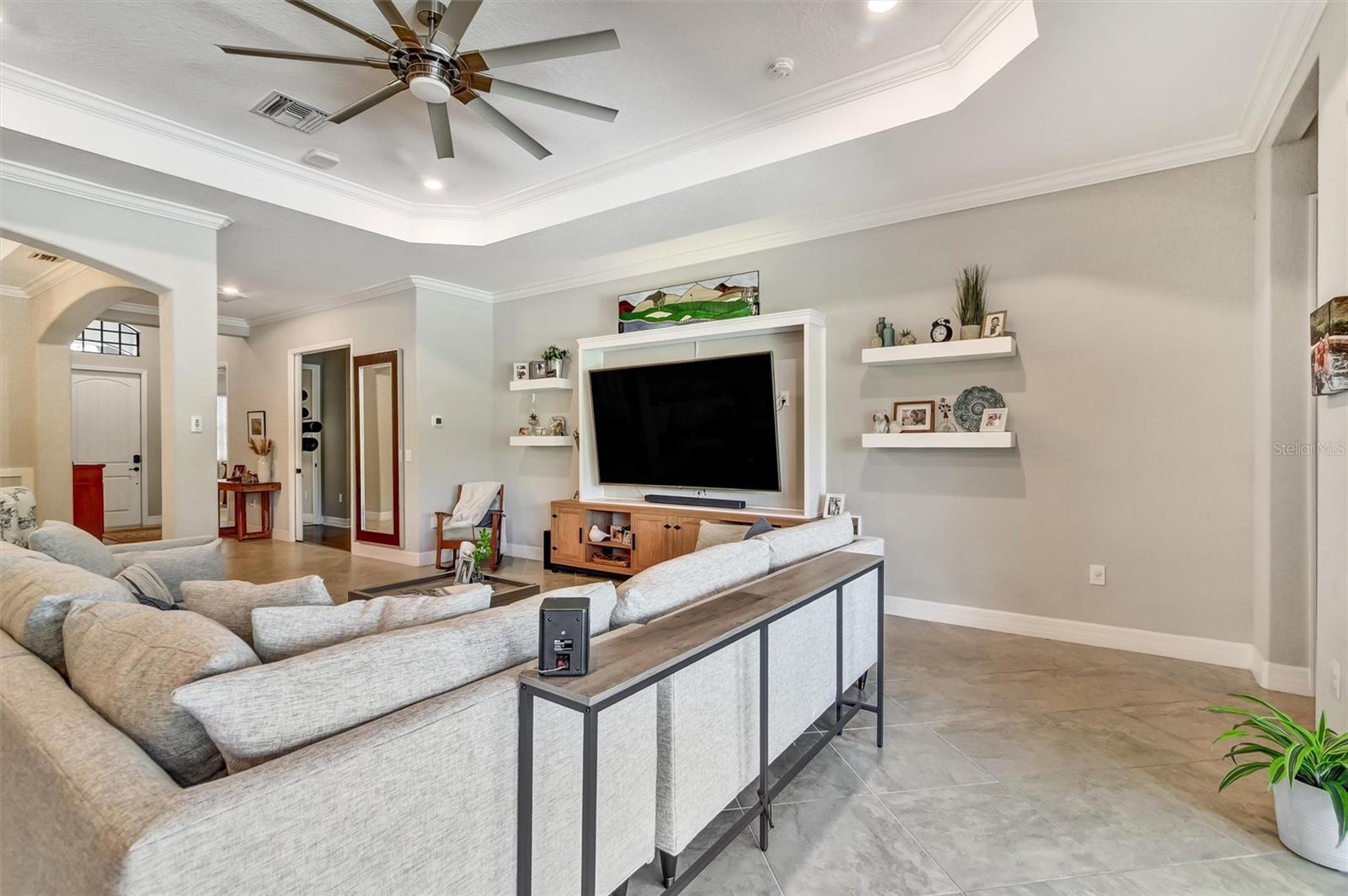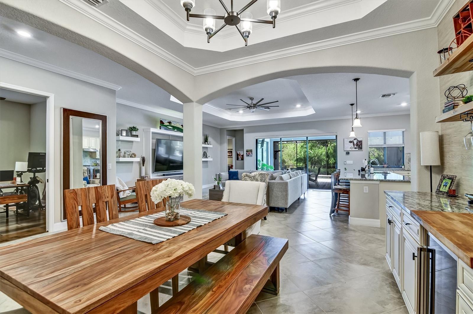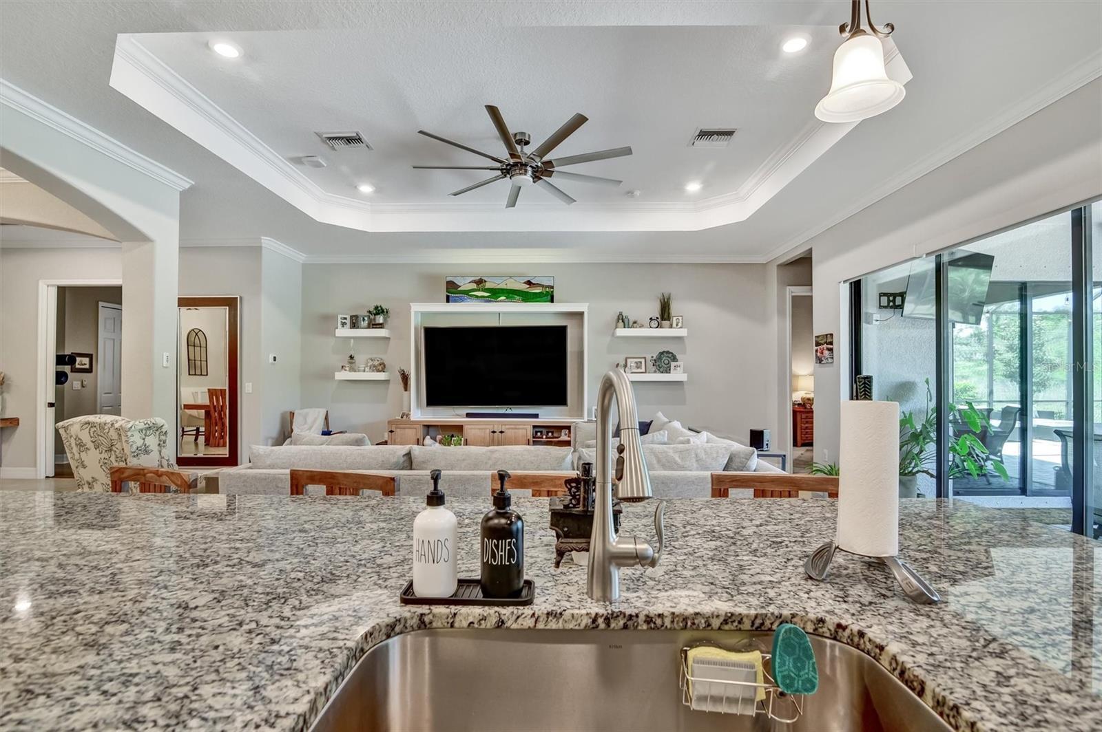 - Ceiling Fans(s), Crown Molding, Dry Bar, Eat-in Kitchen, High Ceilings, In Wall Pest System, Kitchen/Family Room Combo, Open Floorplan, Primary Bedroom Main Floor, Smart Home, Solid Surface Counters, Solid Wood Cabinets, Stone Counters, Thermostat, Tray Ceiling(s), Walk-In Closet(s), Window Treatments