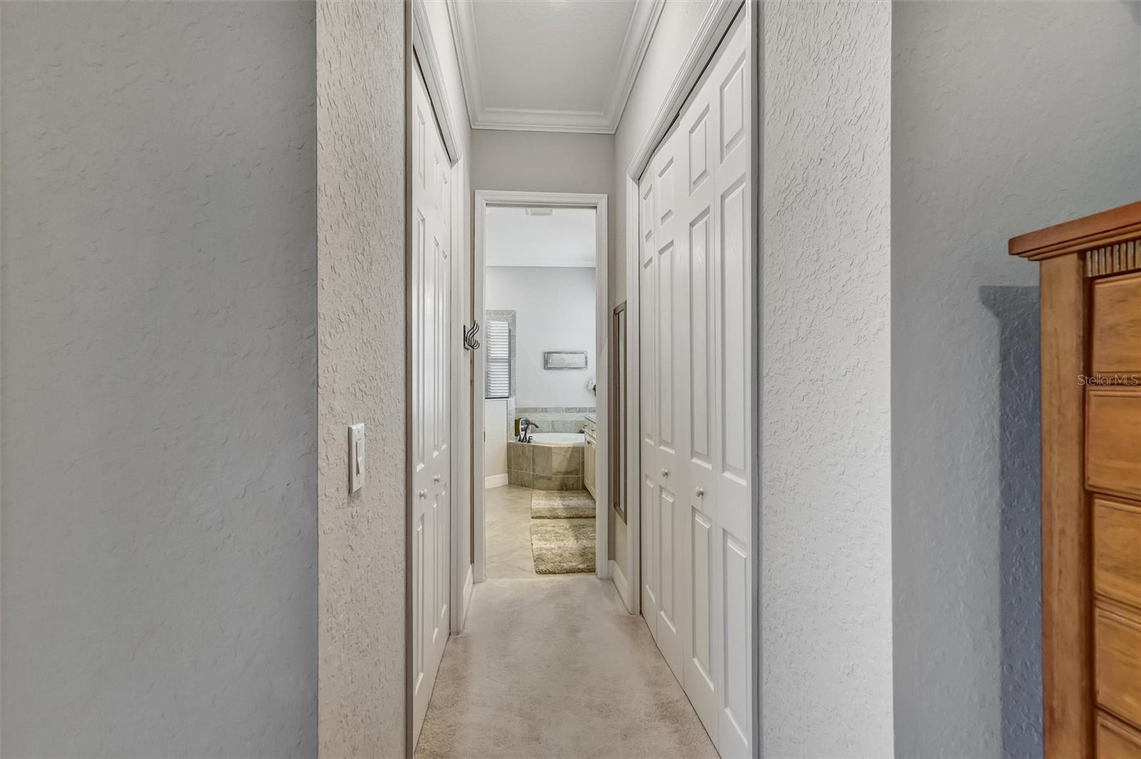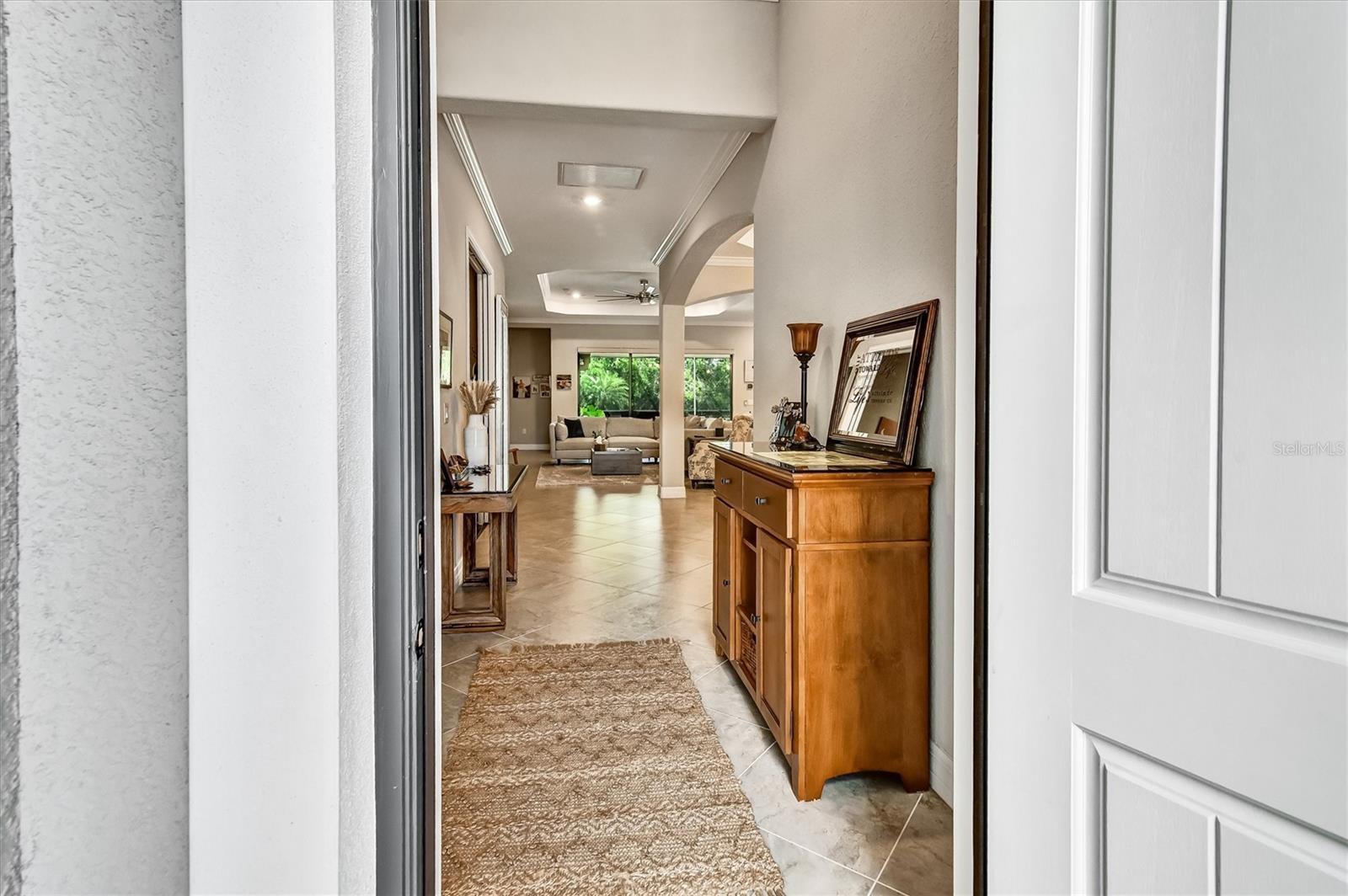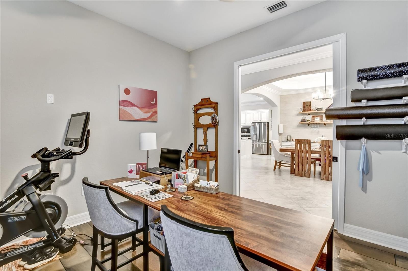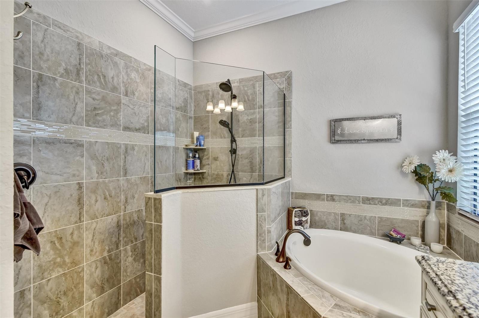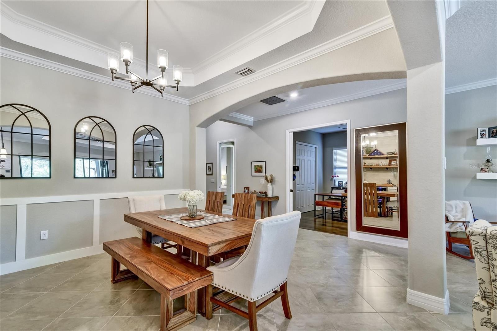 - Ceiling Fans(s), Crown Molding, Dry Bar, Eat-in Kitchen, High Ceilings, In Wall Pest System, Kitchen/Family Room Combo, Open Floorplan, Primary Bedroom Main Floor, Smart Home, Solid Surface Counters, Solid Wood Cabinets, Stone Counters, Thermostat, Tray Ceiling(s), Walk-In Closet(s), Window Treatments