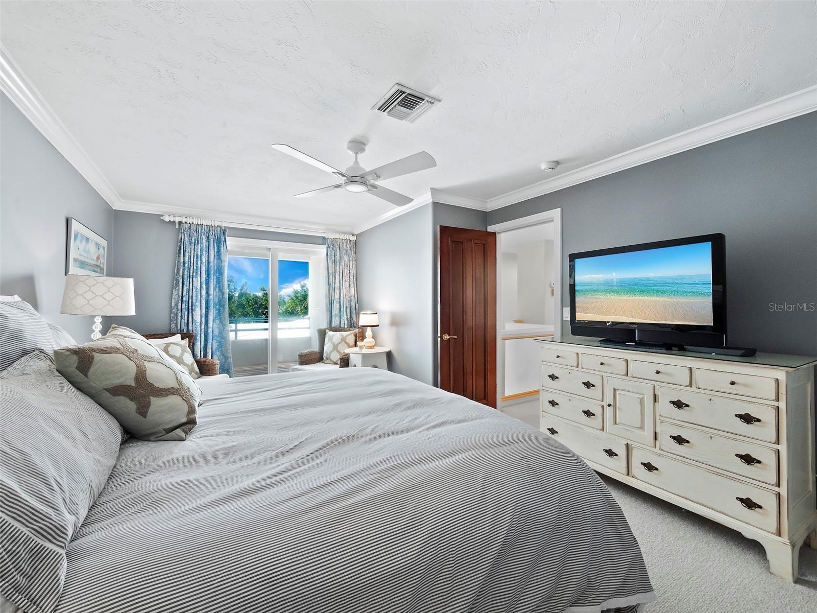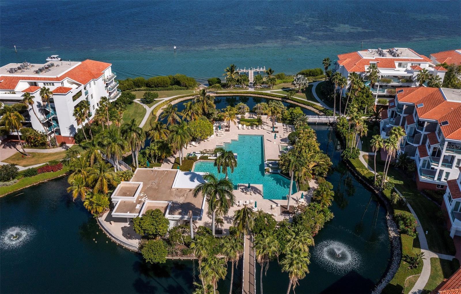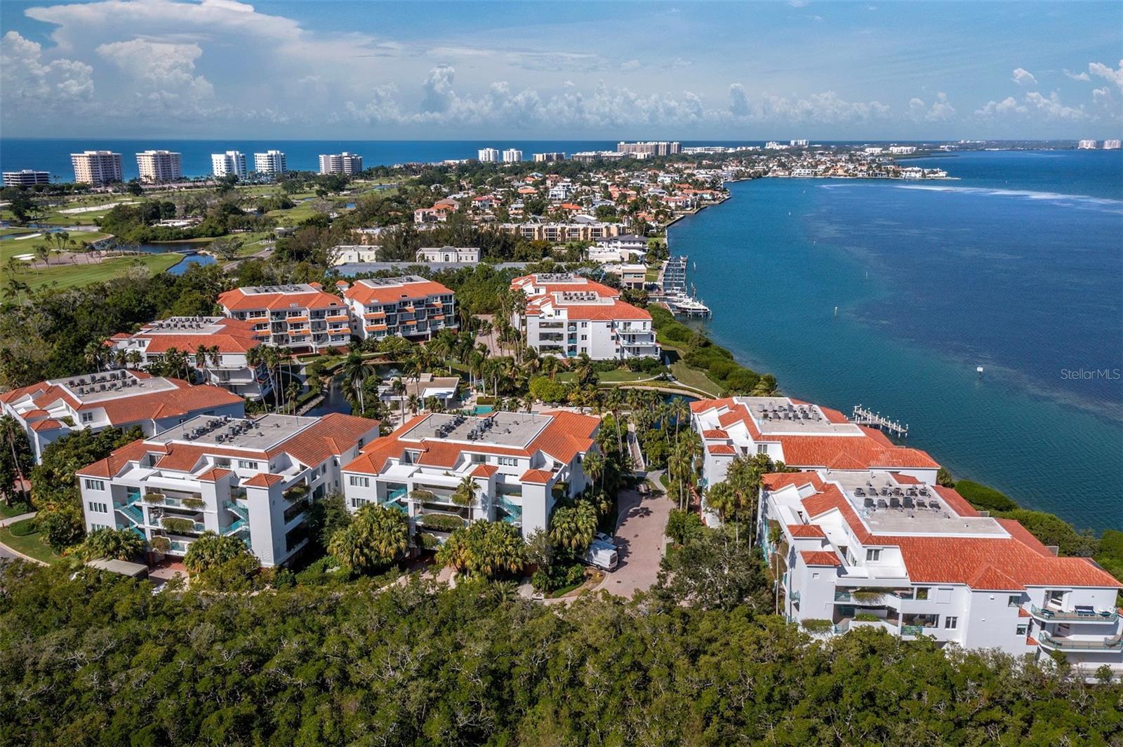 PENTHOUSE. Delight in scenic views of Sarasota Bay in this custom-designed, rare 4 bedroom, 4.5 bathroom in the gated resort-style Tangerine Bay community on the southernmost tip of Longboat Key. The residence is only minutes from St. Armand's Circle, across the street from the Longboat Key Club, and a short driving distance to the Bay Isles Beach Club and vibrant downtown Sarasota. Filled with abundant natural light, the spacious condominium features soaring ceilings, a great room with gas fireplace, marble foyer and gallery for displaying artwork, and private gated courtyard. All bedrooms are ensuite. New sliding glass doors in the primary suite and new glass window in the great room open to a tiled terrace where you can start your day with a cup of coffee while watching the sunrise over the lagoon and Bay. An additional west-facing terrace upstairs boats golf course and sunset views. The well-equipped kitchen includes stone counters, breakfast bar, large pantry and morning room. There is also a fully enclosed two-car garage with plenty of storage space as well as two AC units in the condominium. The Tangerine Bay Club community boasts beautifully manicured walking paths, amid newly planted tropical greenery as well as many amenities, including a pool with waterfalls, fitness center, a tennis/pickleball court, plus a day boat dock and fishing pier on the Bay. Residents have the option of joining the Beach Club (normally reserved for only Bay Isles residents) on the Gulf of America.