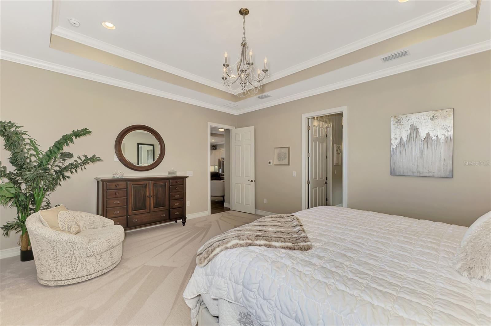 - Ceiling Fans(s), Crown Molding, High Ceilings, Living Room/Dining Room Combo, Open Floorplan, Primary Bedroom Main Floor, Solid Wood Cabinets, Stone Counters, Tray Ceiling(s), Walk-In Closet(s)