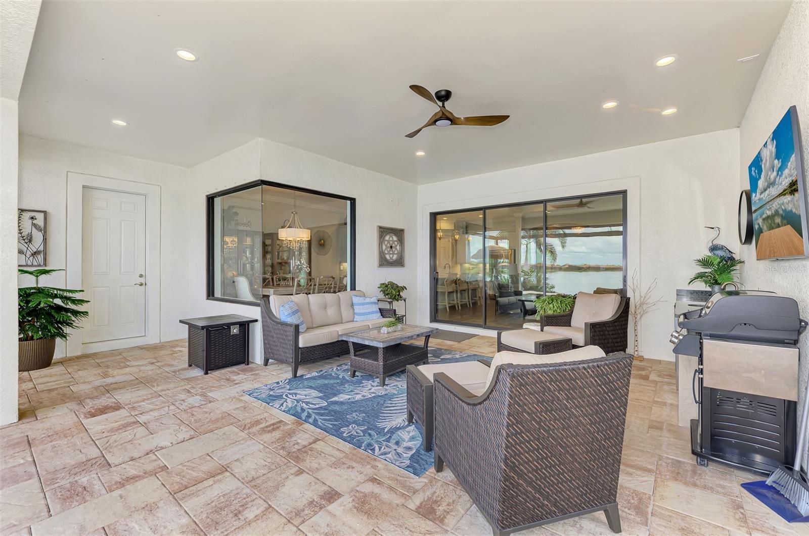 - Hurricane Shutters, Outdoor Grill, Outdoor Kitchen, Rain Gutters, Shade Shutter(s), Sidewalk, Sliding Doors