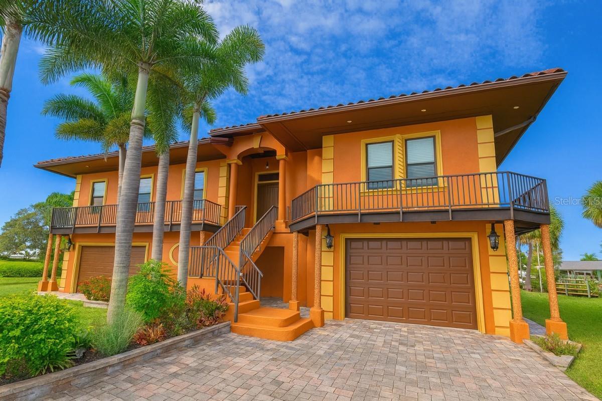 Retreat to paradise in this stunning waterfront home, built new in 2011, in highly sought-after Sorrento Shores, Osprey. Perfectly situated on 210 feet of wide canal frontage, this residence offers deep water access with no bridges to the bay—a dream for boaters. Nearly every room provides breathtaking views of the water and swaying palms. Constructed with concrete block on both floors and encompassing 6,254 square feet under roof, this home was built for strength, safety, and peace of mind. The main living area is elevated to 18 feet, well above flood levels. Inside, you’ll find an open-concept design with soaring 14-foot coffered ceilings, crown molding, and LED lighting. Expansive sliders lead to a private lanai and wraparound balconies to enjoy serene sunrises and glowing sunsets. The kitchen offers a large granite island, ample counter space, and a gallery window framing the water. Each of the three bedrooms features a private ensuite bathroom. The master suite includes three closets, balcony access, and a spa-like bath with jetted tub, dual vanities, makeup desk, and oversized shower. One secondary bedroom also has balcony access. The first level provides space for cars, toys, and storage with hurricane-impact glass throughout. Closed-cell insulation enhances efficiency, and concrete stairs and elevator shaft add durability. The home sustained no damage or flooding during recent hurricanes. The expansive paved patio overlooks canals frequented by manatees and dolphins.