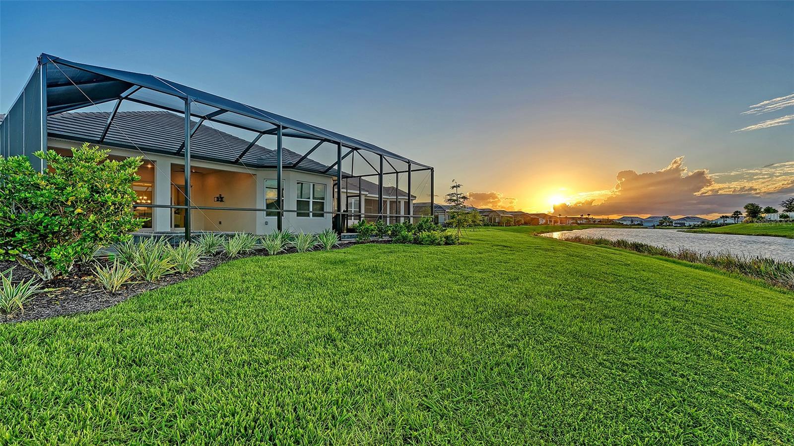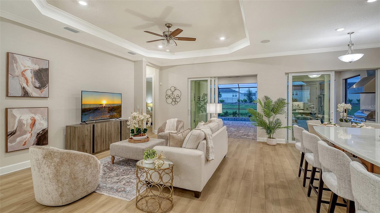 Under contract-accepting backup offers. Discover resort-style living at its finest in this fully loaded 3-bedroom, 3-bath plus office Lazio floor plan, located in the highly sought-after Esplanade at Azario in Lakewood Ranch. This exceptional, non-golf deeded home showcases impact glass windows and doors, designer finishes, and a stunning water view that sets the tone for luxury and relaxation. Step inside and experience effortless elegance with tray ceilings, crown molding, luxury vinyl plank flooring throughout, and an abundance of natural light. The gourmet kitchen is a chef’s dream, featuring Quartz countertops, a large center island, GE Monogram stainless appliances including a gas cooktop and range hood, wall-mounted oven and microwave, extended cabinetry with wine refrigerator, soft-close drawers, tile backsplash, and a spacious walk-in pantry. The open-concept great room flows seamlessly to the covered lanai with a heated saltwater pool and spa and a fully equipped outdoor kitchen, creating the perfect space for entertaining or quiet evenings watching the sunset. The primary suite is a true retreat, offering peaceful water views, a spacious walk-in closet, and a luxurious en-suite bath featuring a large walk-in shower with frameless glass, dual sink vanity, quartz countertops, and beautiful tile extending to the ceiling. Designed for modern living, the home also includes a laundry room with utility sink and cabinetry, epoxy garage flooring, glass front door with sidelights, and a tandem 3rd bay garage. Exterior enhancements include landscape lighting and bay window extensions that elevate the home’s curb appeal and livability. Located within Esplanade at Azario, residents enjoy world-class amenities—a resort-style pool and Bahama bar, full-service spa, state-of-the-art fitness center, sports courts, culinary center with teaching kitchen, on-site dining, and a full-time lifestyle director. Additional offerings include pickleball, tennis, bocce, walking trails, a dog park, community garden, and fire pit—all just minutes from Lakewood Ranch’s premier shopping, dining, and Gulf Coast beaches. This home offers the perfect blend of luxury, privacy, and low-maintenance living. Schedule your private showing today and experience the Esplanade lifestyle!