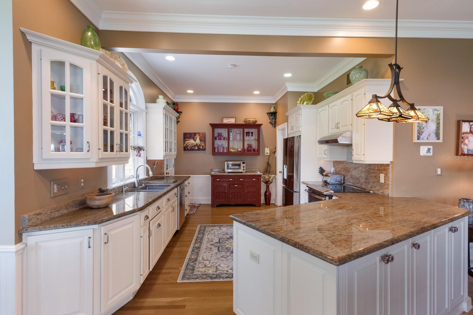 - Built-in Features, Cathedral Ceiling(s), Ceiling Fans(s), Crown Molding, Eat-in Kitchen, High Ceilings, Kitchen/Family Room Combo, Open Floorplan, Primary Bedroom Main Floor, Solid Wood Cabinets, Split Bedroom, Stone Counters, Thermostat, Walk-In Closet(s), Window Treatments