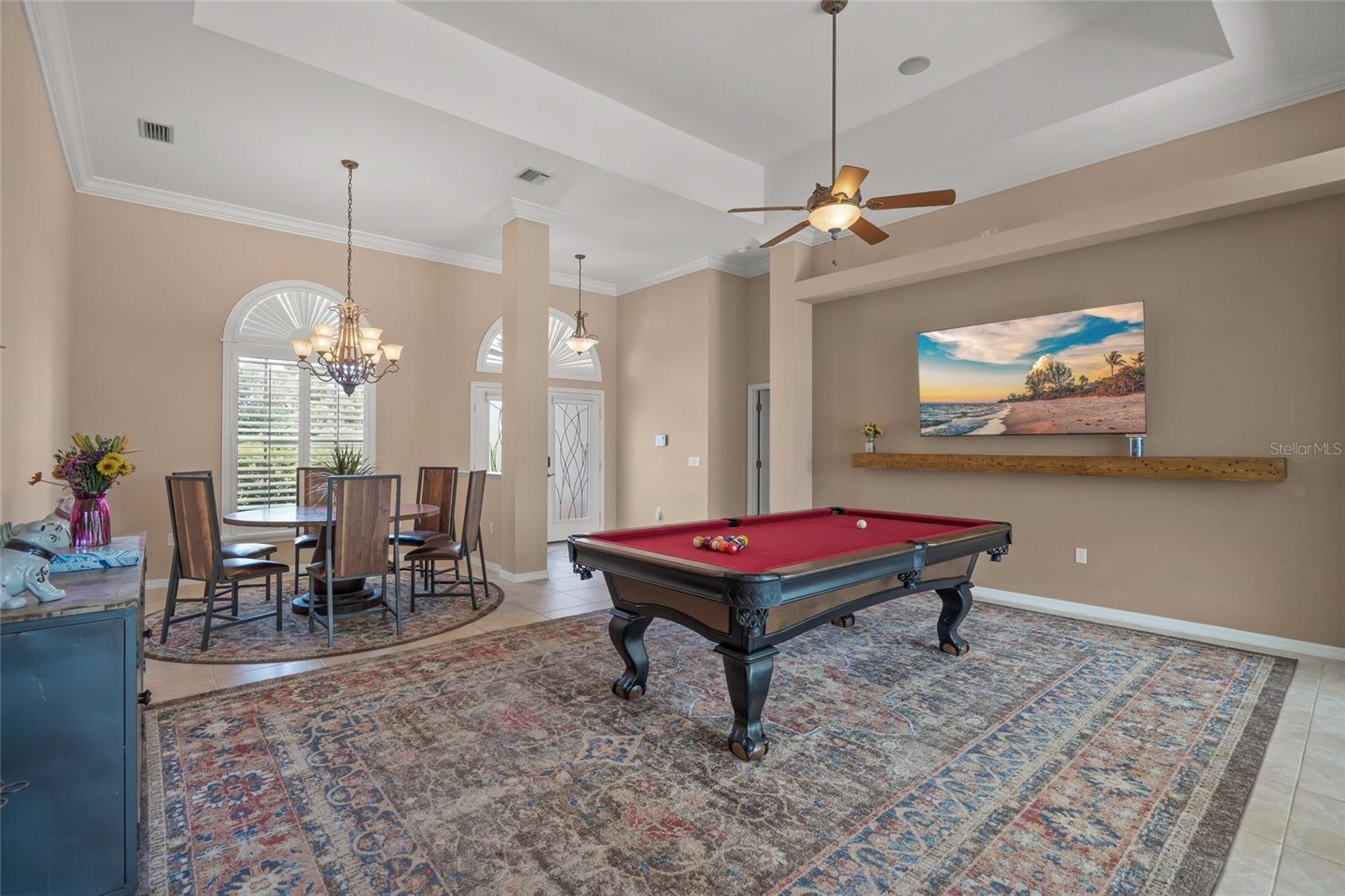 - Attic Ventilator, Ceiling Fans(s), Central Vaccum, Crown Molding, Eat-in Kitchen, High Ceilings, Kitchen/Family Room Combo, Living Room/Dining Room Combo, Open Floorplan, Primary Bedroom Main Floor, Smart Home, Split Bedroom, Stone Counters, Tray Ceiling(s), Walk-In Closet(s), Window Treatments