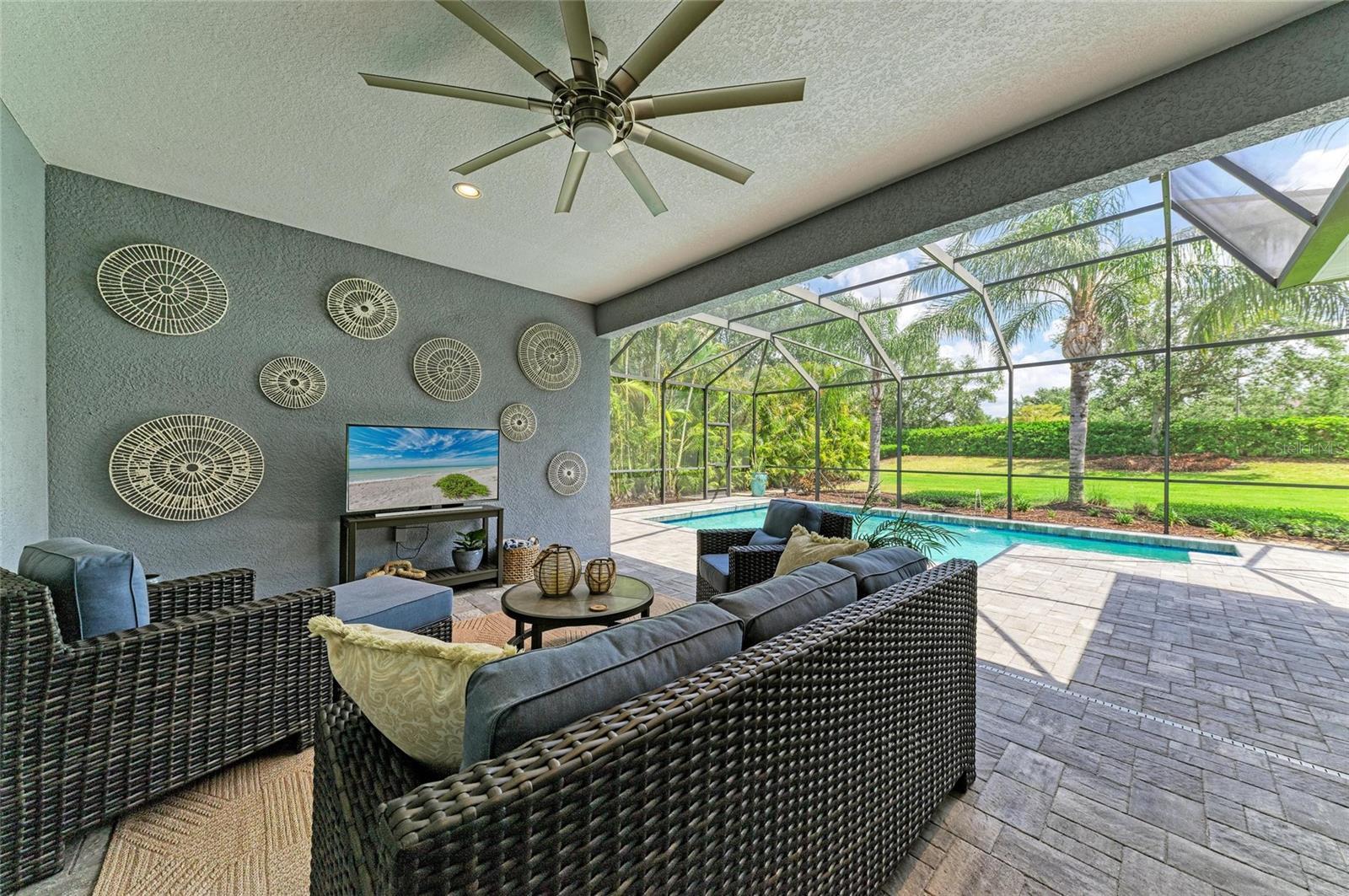 Reduced by $30K, $120K invested since purchased in 5/2023. Situated on an oversized lot, with private views, this beautifully upgraded and meticulously maintained Neal built Harmony floor plan offers the perfect blend of luxury, functionality, and resort style living. Located in the maintenance free and privately gated area of Central Park in Lakewood Ranch, the home offers an open floor plan, numerous upgrades, a private back yard - no rear neighbors, heated saltwater pool, and an oversized outdoor living area. The 3-bedroom, 3-bath, 3 car garage, pool home, has a spacious and functional floor plan designed with comfort and style in mind. As you enter the home you’ll be greeted by the open front porch that provides ample space for relaxing and having that casual conversation with the neighbors. Enter the home and begin to enjoy open-concept living! The oversized great room features a tray ceiling with canned lights, ceiling fan, crown molding, ship-lap feature wall, luxury vinyl flooring, and 3 French doors leading to the lanai. Adjacent to the great room is the spacious dining room featuring crown molding, luxury vinyl flooring and updated chandler. To the rear of the great room is the bright, modern kitchen with all new stainless steel appliances, corner pantry, cabinets with roll out shelving, oversized island with new lighting, new kitchen sink and faucet, new tile backsplash with under-counter lighting and luxury vinyl floors. The large primary suite offers a tray ceiling, crown molding, plantation shutters, new carpeting and a ceiling fan plus an renovated spa-like en-suite bath which features new tile floors, new tile 9 ft. shower, corner soaking tub, separate vanities with new lighting and 2 walk-in closets with custom California Closets shelving. The private den/family room combo features 5 ft. double glass doors, luxury vinyl floors, crown molding and a slider that leads you out to your own backyard oasis ideal for relaxing or hosting gatherings year round. The large covered/screened in private lanai with sparkling heated in-ground saltwater pool with new pavers, an outdoor family room w/ceiling fans and gas hook up for the future fire-pit, an outdoor dining area with new ceiling fan, gas and electric hook up for your gas grill or future outdoor kitchen. Back inside the house there’s a convenient pool bath with tile shower, tile floors, and updated vanity, countertop, sink, faucet and lighting. Two additional bedrooms each with crown modeling ceiling fans, plantation shutters, new carpet and custom California closets is served by the 3rd bath featuring tile floors, tile tub/shower combo and new lighting. Convenient laundry room features new tile floors, lighting and laundry sink and cabinetry. This home offers, stylish finishes throughout, a beautiful landscaped lot with irrigation and a 3 car garage. Situated in a family-friendly neighborhood offering parks, playgrounds, walking trails, community pool, fitness center, tennis courts, pickle ball courts and adjacent to top-rated schools, this home blends quality craftsmanship, convenience, and Florida charm. Upgrades: 2024: HVAC, front & rear pavers, 2023: Interior paint, 8 ft solid two panel doors, master bath, California closets, interior lighting, ceiling fans, crown molding, door case molding, ship-lap, stainless steel appliances, kitchen backsplash, laundry room, ceramic flooring, carpeting 2022: exterior paint, luxury vinyl throughout home. OWNER IS A LICENSED AGENT