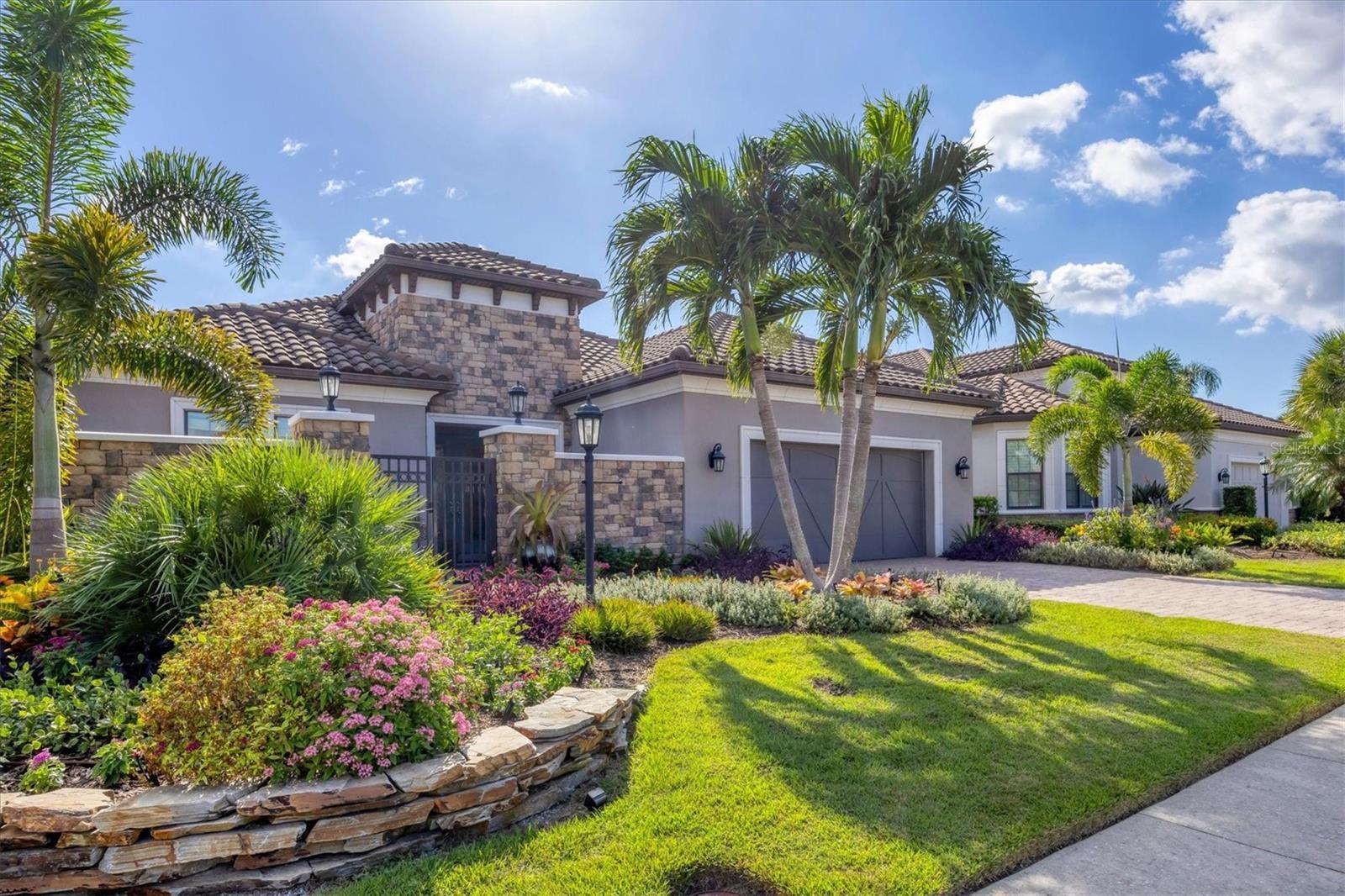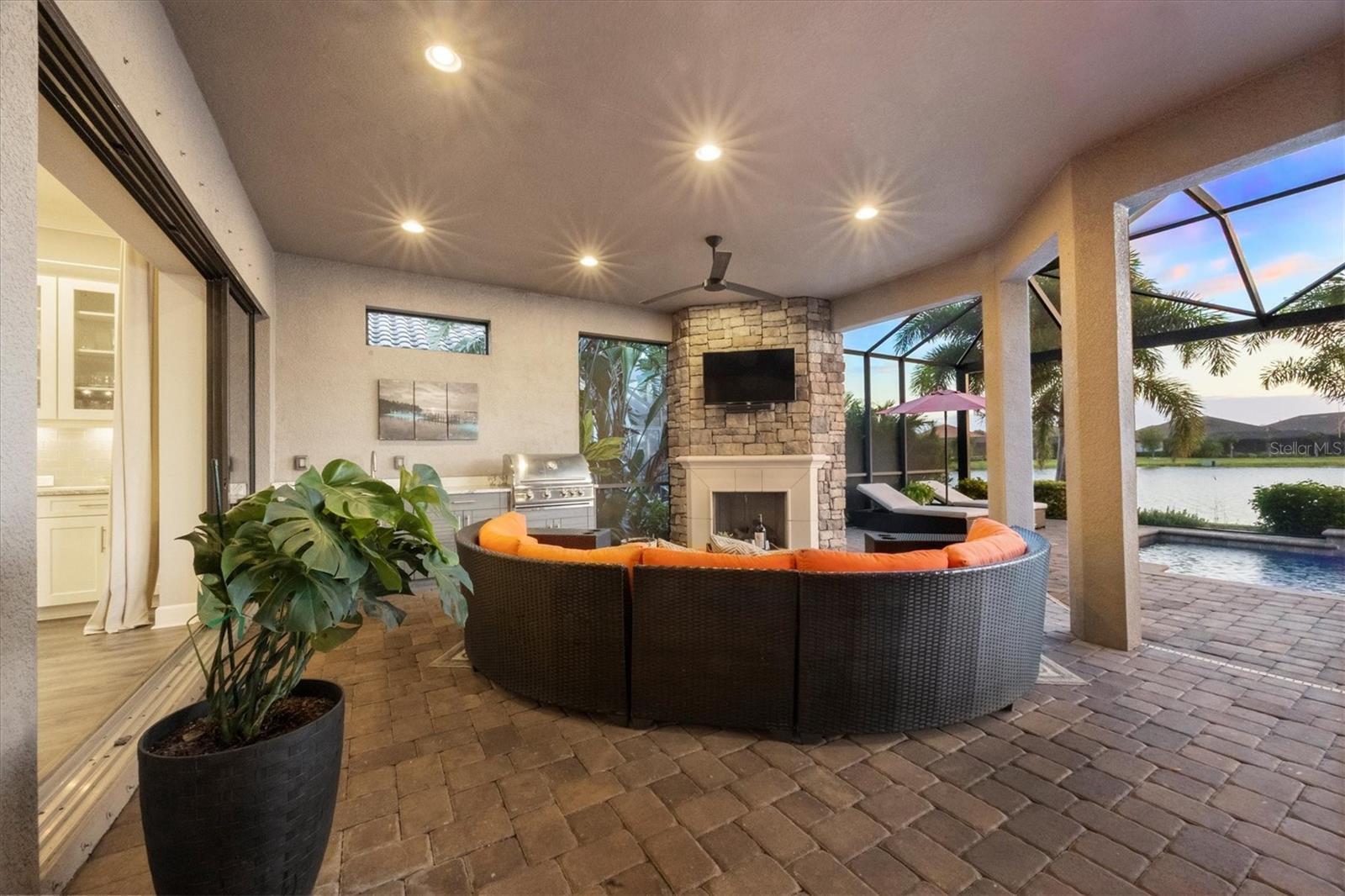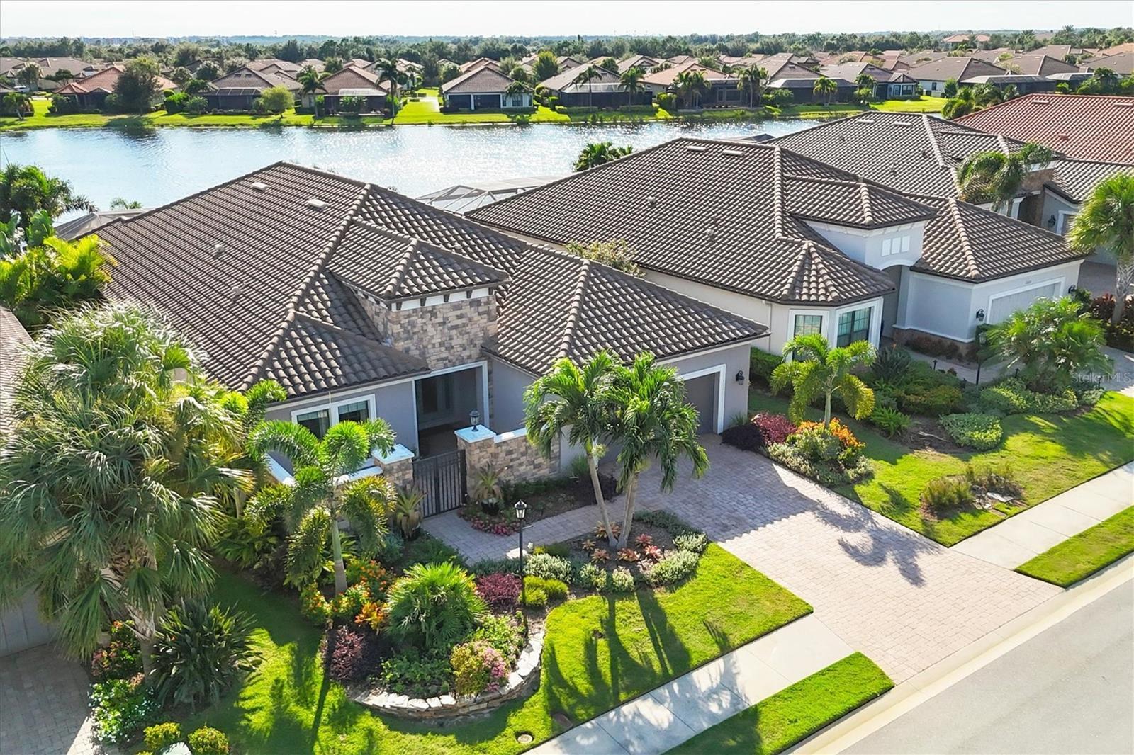 Under contract-accepting backup offers. Embrace the ultimate resort-style living in this stunning water view home, featuring the coveted Pallazio VII floor plan with an added nook. This residence boasts an expansive outdoor living space with a gas fireplace, perfect for both relaxation and entertainment, enhanced by Elevation C with a 4 ft garage extension. With a FULL GOLF MEMBERSHIP included, you can enjoy the best of golf and leisure right at your doorstep! As you enter through the charming, gated courtyard and double doors, you will be welcomed by impressive columns and soaring ceilings that set the tone for elegance. The open-concept great room, adorned with crown molding and bathed in natural light from disappearing pocket sliding doors, seamlessly connects to the lanai with breathtaking southwest facing views of the pool and outdoor oasis. The upgraded gourmet kitchen is a chefs dream, featuring stainless-steel appliances including Quartz Cambria countertops, a 36-inch natural gas cooktop, and a built-in oven. The oversized island, highlighted by stylish pendant lighting, offers ample storage and is perfect for entertaining or family meals. Enjoy morning coffee in the extended breakfast area, with sliding glass pocket doors that open to the lanai. Retreat to the grand primary bedroom, a private sanctuary complete with a spacious en-suite bathroom featuring dual sinks, a frameless glass shower, and a large walk-in closet. Two guest bedrooms provide comfort and privacy, one with an en-suite bathroom and the other with convenient access to a separate bath. The generously sized study/den, accessible through elegant 8 ft. French double doors, offers versatility for work or can easily be transformed into a fourth bedroom. Step outside to the extended screened lanai, where the expansive paver deck and endless water views invite you to soak up Florida’s sunshine. With a wealth of community amenities, including an 18-hole championship golf course, tennis and pickleball courts, two resort-style pools, and a full-service spa, you will never run out of things to do. Enjoy fine dining at the Barrel House Bistro, or casual meals at the Bahama Bar, along with an active social calendar filled with events. Located in award-winning Lakewood Ranch, you are just moments away from shopping, dining, local farmers? markets, scenic trails, and beautiful beaches. Don't miss your chance to own this meticulously designed home in one of Florida's premier communities, schedule your showing today and step into your dream lifestyle! GREAT ROOM AND PRIMARY BEDROOM LIGHT FIXTURES DO NOT CONVEY.