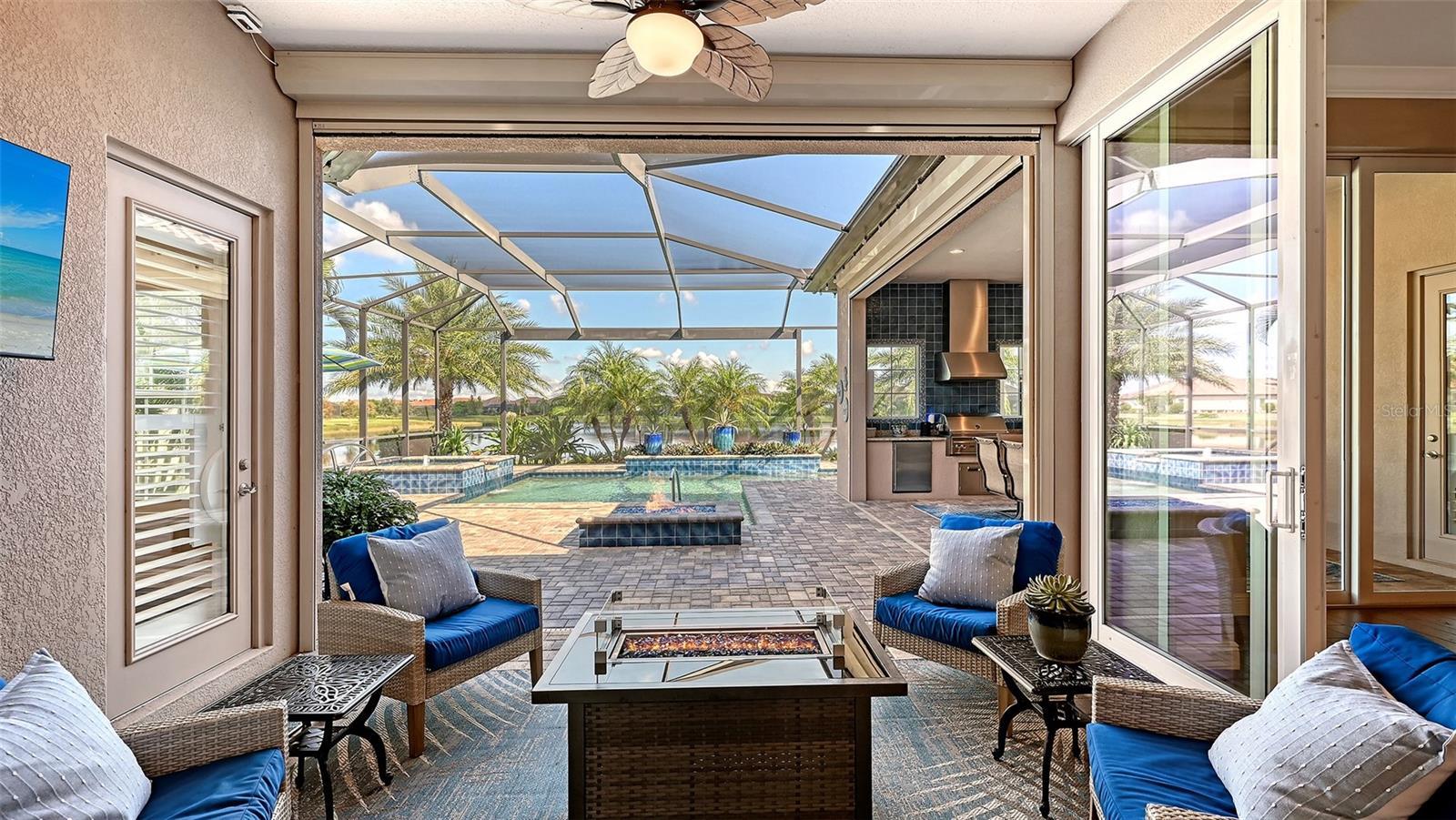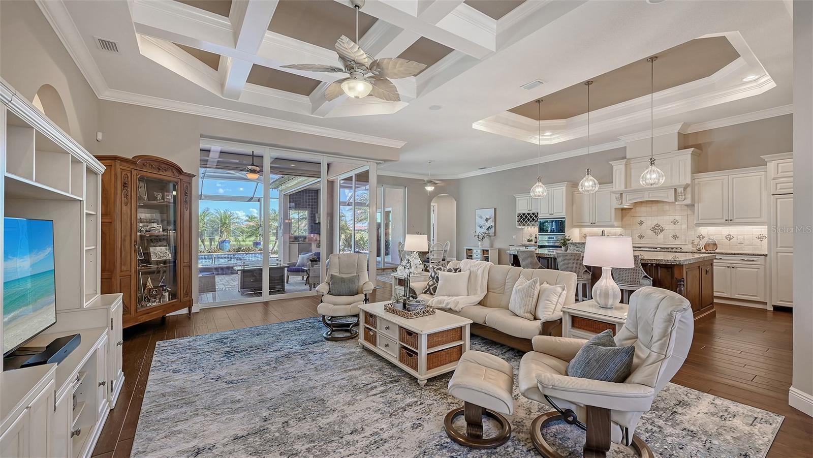 Under contract-accepting backup offers. Positioned on a premier homesite with water on two sides and sweeping long-lake views, this John Cannon custom-built residence blends quality construction with timeless design. Hurricane impact glass, front and rear roll-down storm shades, and a whole-house generator provide peace of mind, while beautiful wood floors, solid core doors, crown molding, volume tray and coffered ceilings, plantation shutters, and built-in speakers elevate the interiors. At the heart of the home, the kitchen showcases a large center island with dinette seating, wine bar with wine fridge, stainless steel appliances, and a gas cooktop, opening effortlessly to the living and dining rooms for both everyday living and entertaining. The expansive primary suite features a double-door entry, tray ceiling, lanai access, spa-like bath with walk-in shower, dual vanities with makeup counter, and an enviable custom-designed closet. Thoughtfully arranged guest suites ensure privacy, while the versatile fourth bedroom with lanai access easily serves as an office or bonus room. Zero-corner sliders in the living room and multiple sets of sliders from the dinette extend the living space outdoors, where the lanai becomes an entertainer’s paradise—complete with saltwater pool and spa, full outdoor kitchen, and both lounging and dining areas framed by spectacular water views. Added highlights include a tankless water heater, landscape lighting, utility sinks in both the laundry room and garage, and countless other thoughtful details that make this home exceptional. Lakewood Ranch is the number one best-selling multigenerational community in the country and is located near world-class shopping, dining, and entertainment at Lakewood Ranch Main Street, University Town Center, and downtown Sarasota, with minutes to I-75, beaches, excellent schools, and medical facilities. Several levels of membership to the Lakewood Ranch Golf and Country Club are available and optional.