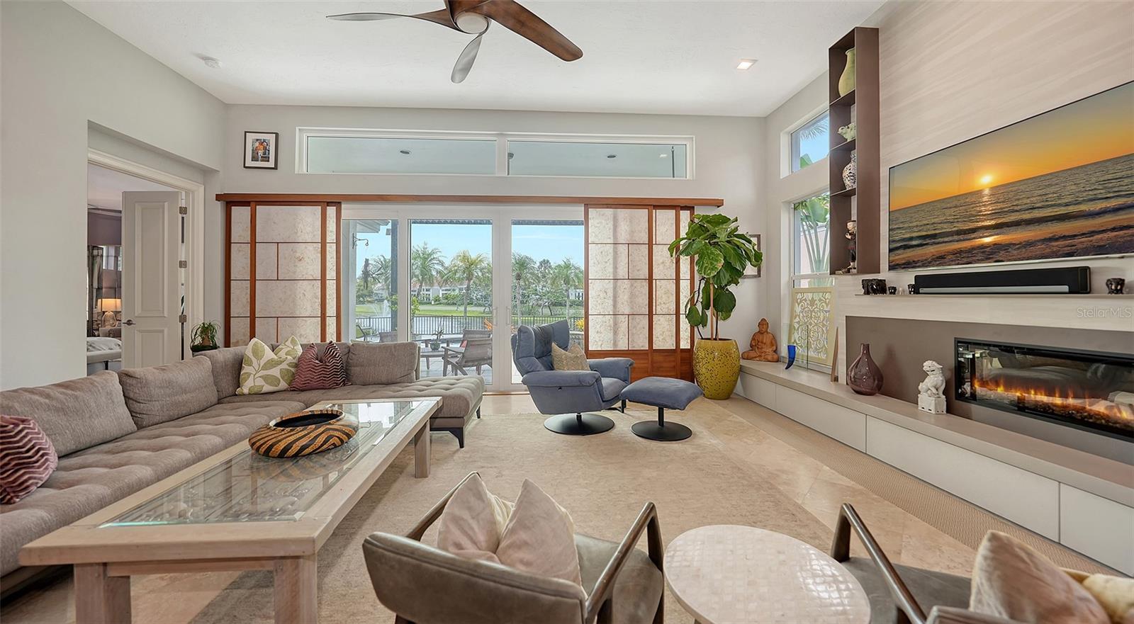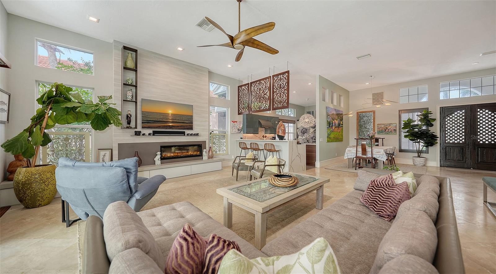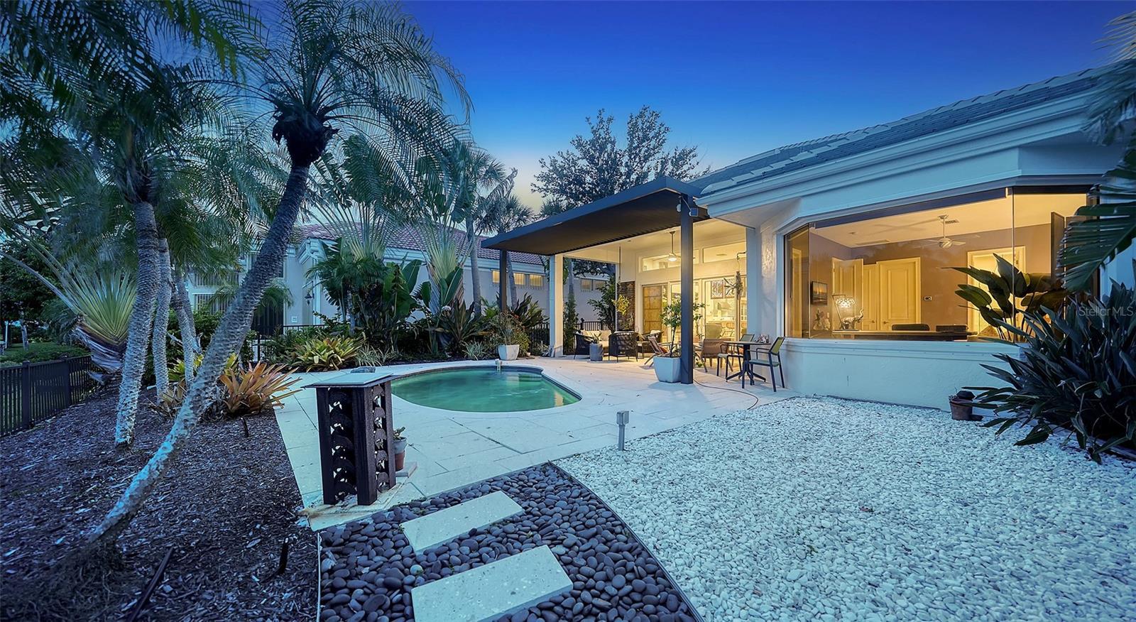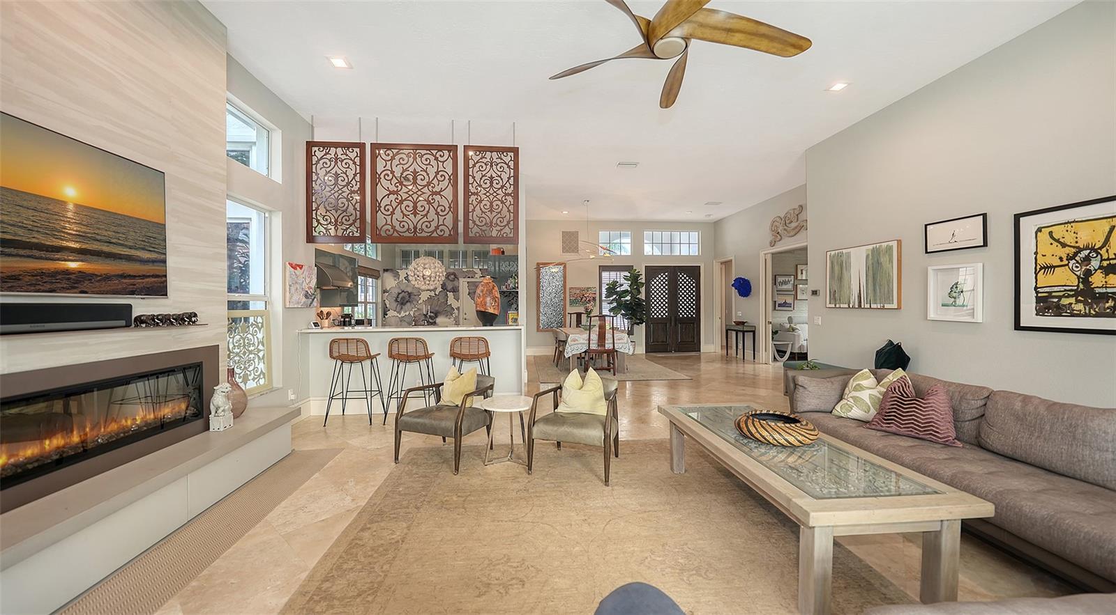 Under contract-accepting backup offers. Welcome to an extraordinary transformation where sophisticated artistry meets modern urban luxury, elevating the serene prestige of Queens Harbour on Longboat Key. This impeccably reimagined 3-bedroom, 2-bath residence offers rare ambiance and refinement, seamlessly merging interior elegance with outdoor serenity. Custom shoji doors envelop hurricane-impact sliders, creating a glowing, intimate setting—perfect for alfresco evenings or savoring the sculptural stone fireplace within the great room. Soaring ceilings and curated niches showcase fine art and architectural detail, infusing the home with stylish warmth. Creamy textures—from hand-selected travertine underfoot to cascading quartz waterfall countertops—form a soothing, sophisticated backdrop. The chef-inspired kitchen is both beautiful and highly functional. An exotic wood island, hammered copper sink, and premium DCS stainless gas cooktop with built-in ovens evoke culinary artistry. Designer lighting illuminates the quartz surfaces, while the chic breakfast area—with its bespoke wall print—suggests an upscale Manhattan suite. Fisher & Paykel dishwasher drawers elevate entertaining, and the expansive breakfast bar invites guests to gather in effortless style. The voluminous open plan flows to a formal dining room ideal for gracious hosting, all connected to the great room and tranquil Zen garden beyond. Oversized sliders dissolve the boundary between indoors and the lush backyard oasis, framing the serene pool like a living painting. The owners’ suite is a sanctuary with generous proportions, a walk-in closet, a peaceful lounge/workspace, and private pool access overlooking the gentle pond. The primary bath is a masterpiece— boasting refined finishes, and a two-person walk-in shower enclosed in seamless glass, and generous soaking tub creating a spa-like haven. The second ensuite bedroom is bathed in sunlight from a sweeping wall of windows and offers private bath access. Luxurious quartz, tile, and high-end fixtures provide understated refinement, with a spacious closet and nearby linen storage for guests. The third bedroom/den, currently styled as a chic office, easily converts to a guest suite. Custom built-ins set a sophisticated tone—ideal for unwinding after days at the nearby beaches. From its intricately carved double doors to its elevated fixtures and finishes, this home radiates warmth, craftsmanship, and refined coastal luxury. A complete 2018 renovation ensures comfort and peace of mind—move right in and begin living the easy, distinguished lifestyle that defines Queens Harbour and Longboat Key. Residents enjoy access to the Bay Isles Beach Club with BBQs, volleyball, covered pavilions, a private kitchen, and storage—perfect for sunset gatherings. Optional memberships at the renowned Longboat Key Club offer premier pickleball, tennis, 45 holes of championship golf, a deep-water marina, fine dining, spa, fitness center, and 10 miles of white-sand beach. Come live the dream.