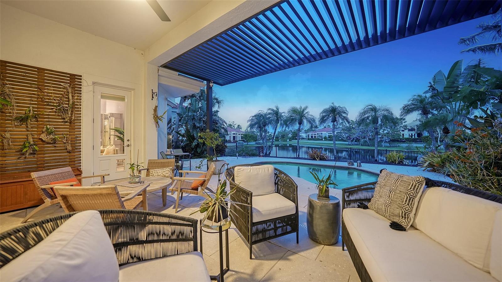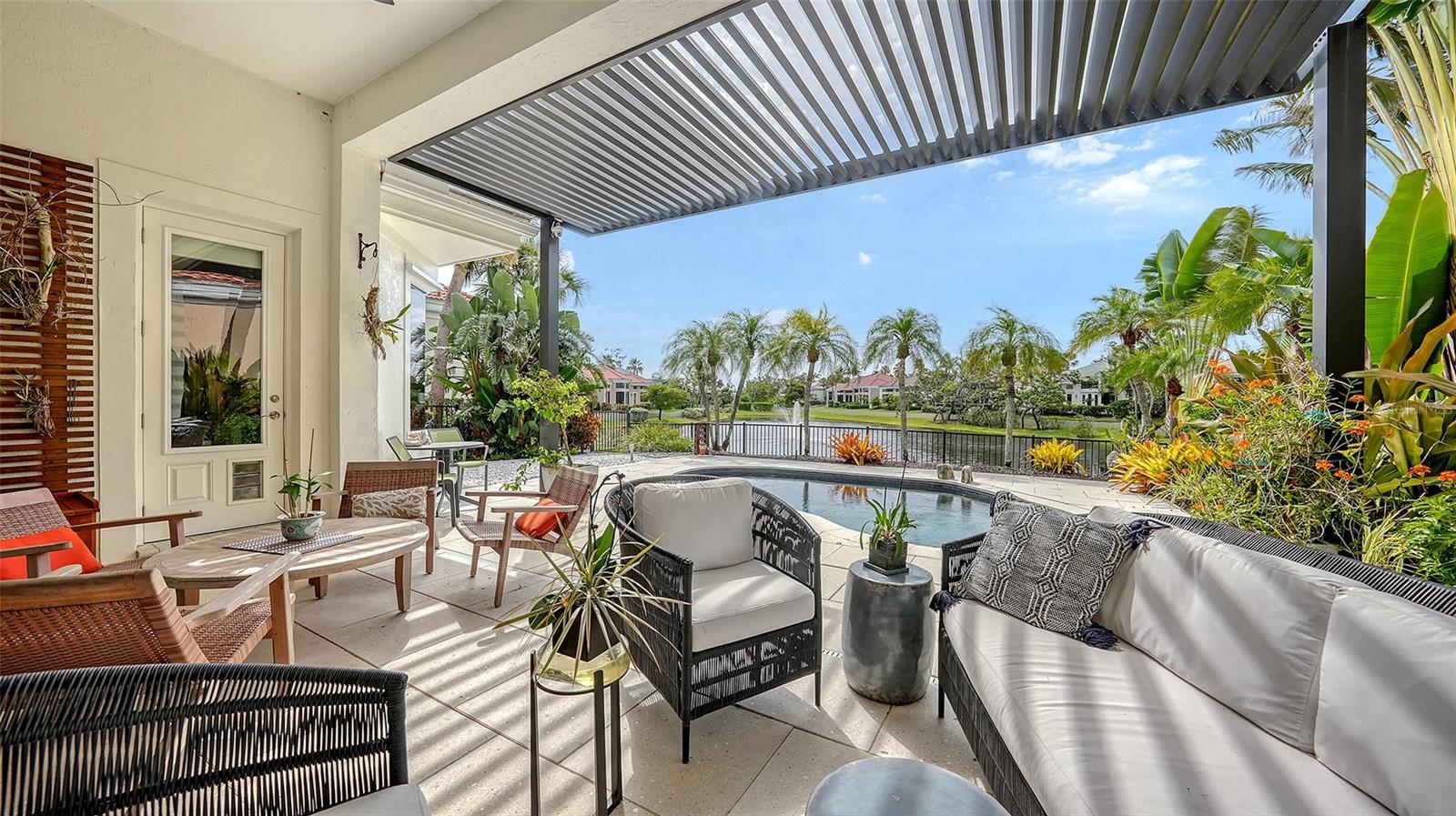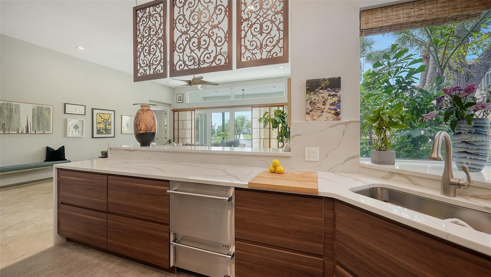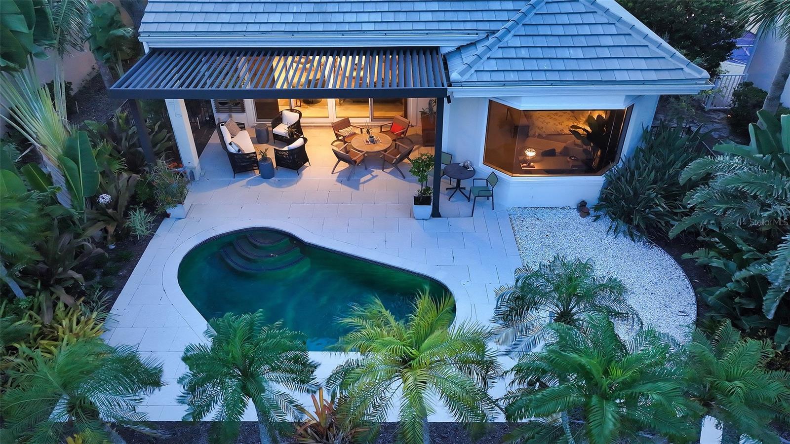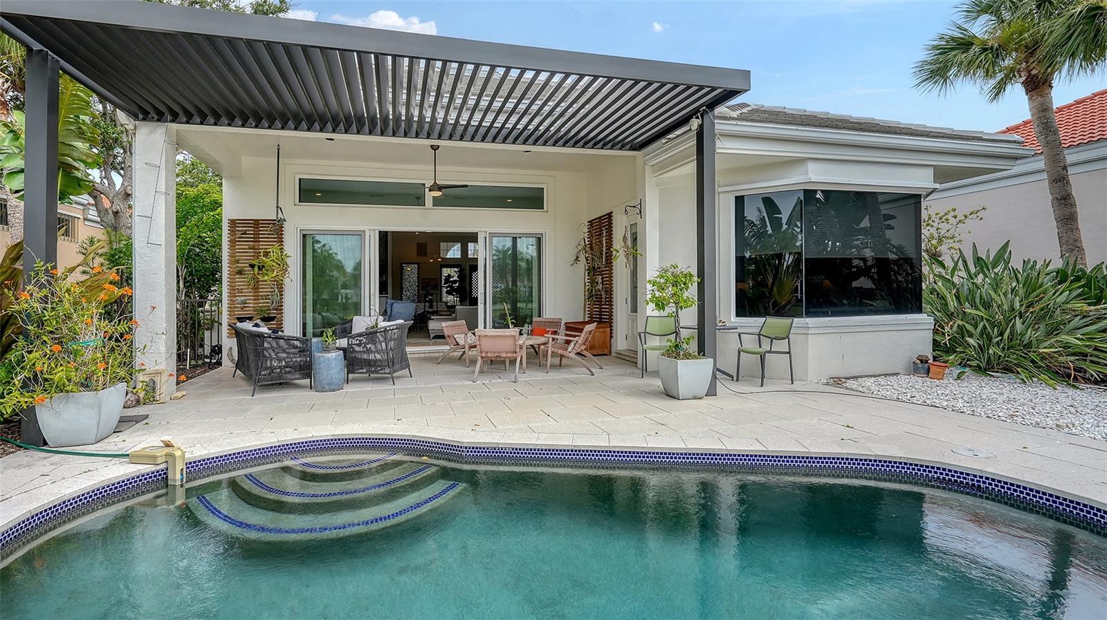 Under contract-accepting backup offers. Welcome to an extraordinary transformation where sophisticated artistry meets modern urban luxury, elevating the serene prestige of Queens Harbour on Longboat Key. This impeccably reimagined 3-bedroom, 2-bath residence offers rare ambiance and refinement, seamlessly merging interior elegance with outdoor serenity. Custom shoji doors envelop hurricane-impact sliders, creating a glowing, intimate setting—perfect for alfresco evenings or savoring the sculptural stone fireplace within the great room. Soaring ceilings and curated niches showcase fine art and architectural detail, infusing the home with stylish warmth. Creamy textures—from hand-selected travertine underfoot to cascading quartz waterfall countertops—form a soothing, sophisticated backdrop. The chef-inspired kitchen is both beautiful and highly functional. An exotic wood island, hammered copper sink, and premium DCS stainless gas cooktop with built-in ovens evoke culinary artistry. Designer lighting illuminates the quartz surfaces, while the chic breakfast area—with its bespoke wall print—suggests an upscale Manhattan suite. Fisher & Paykel dishwasher drawers elevate entertaining, and the expansive breakfast bar invites guests to gather in effortless style. The voluminous open plan flows to a formal dining room ideal for gracious hosting, all connected to the great room and tranquil Zen garden beyond. Oversized sliders dissolve the boundary between indoors and the lush backyard oasis, framing the serene pool like a living painting. The owners’ suite is a sanctuary with generous proportions, a walk-in closet, a peaceful lounge/workspace, and private pool access overlooking the gentle pond. The primary bath is a masterpiece— boasting refined finishes, and a two-person walk-in shower enclosed in seamless glass, and generous soaking tub creating a spa-like haven. The second ensuite bedroom is bathed in sunlight from a sweeping wall of windows and offers private bath access. Luxurious quartz, tile, and high-end fixtures provide understated refinement, with a spacious closet and nearby linen storage for guests. The third bedroom/den, currently styled as a chic office, easily converts to a guest suite. Custom built-ins set a sophisticated tone—ideal for unwinding after days at the nearby beaches. From its intricately carved double doors to its elevated fixtures and finishes, this home radiates warmth, craftsmanship, and refined coastal luxury. A complete 2018 renovation ensures comfort and peace of mind—move right in and begin living the easy, distinguished lifestyle that defines Queens Harbour and Longboat Key. Residents enjoy access to the Bay Isles Beach Club with BBQs, volleyball, covered pavilions, a private kitchen, and storage—perfect for sunset gatherings. Optional memberships at the renowned Longboat Key Club offer premier pickleball, tennis, 45 holes of championship golf, a deep-water marina, fine dining, spa, fitness center, and 10 miles of white-sand beach. Come live the dream.