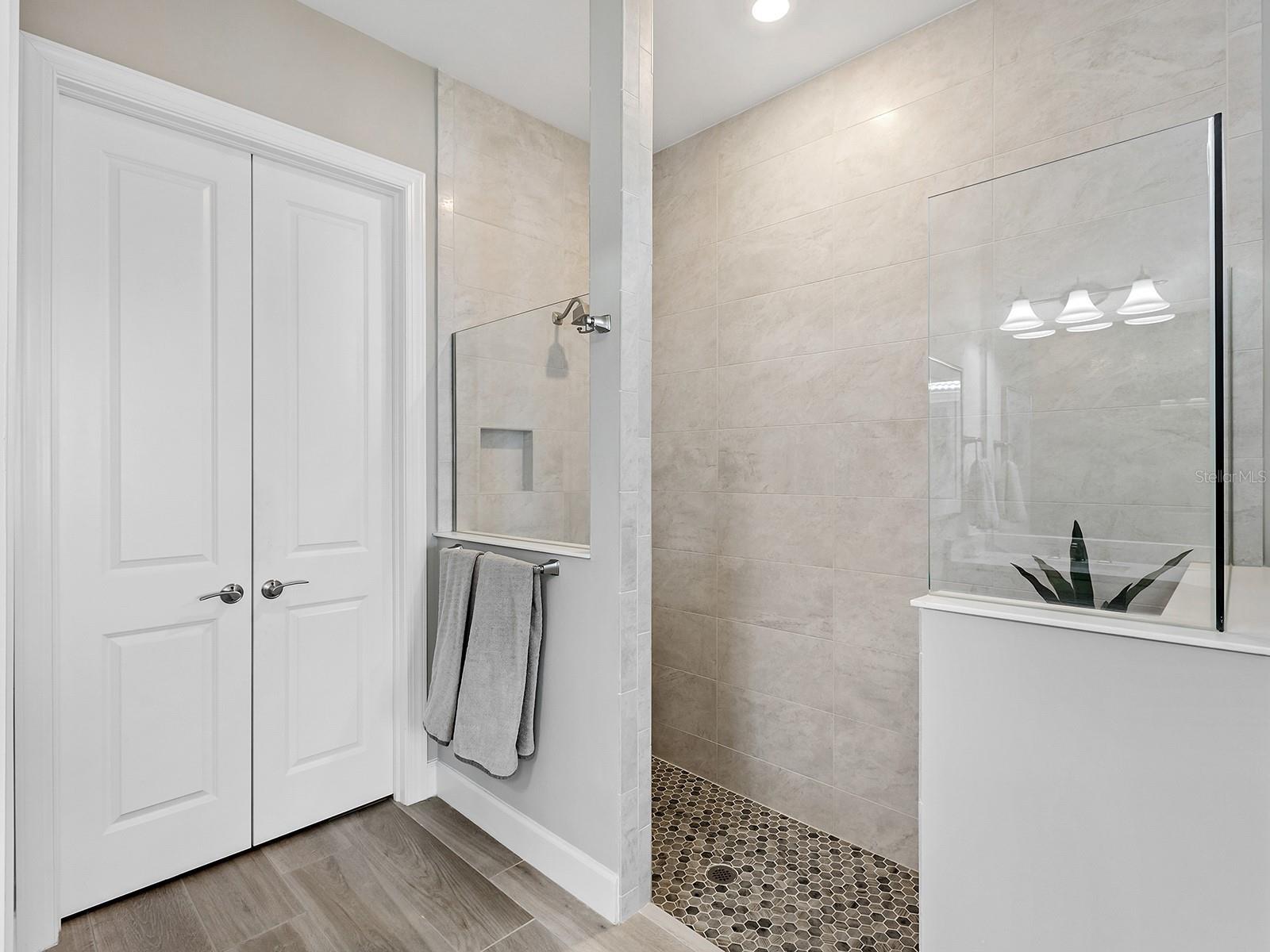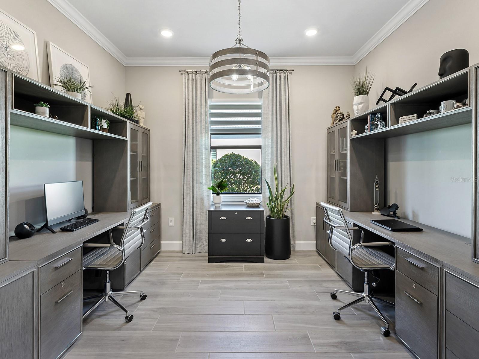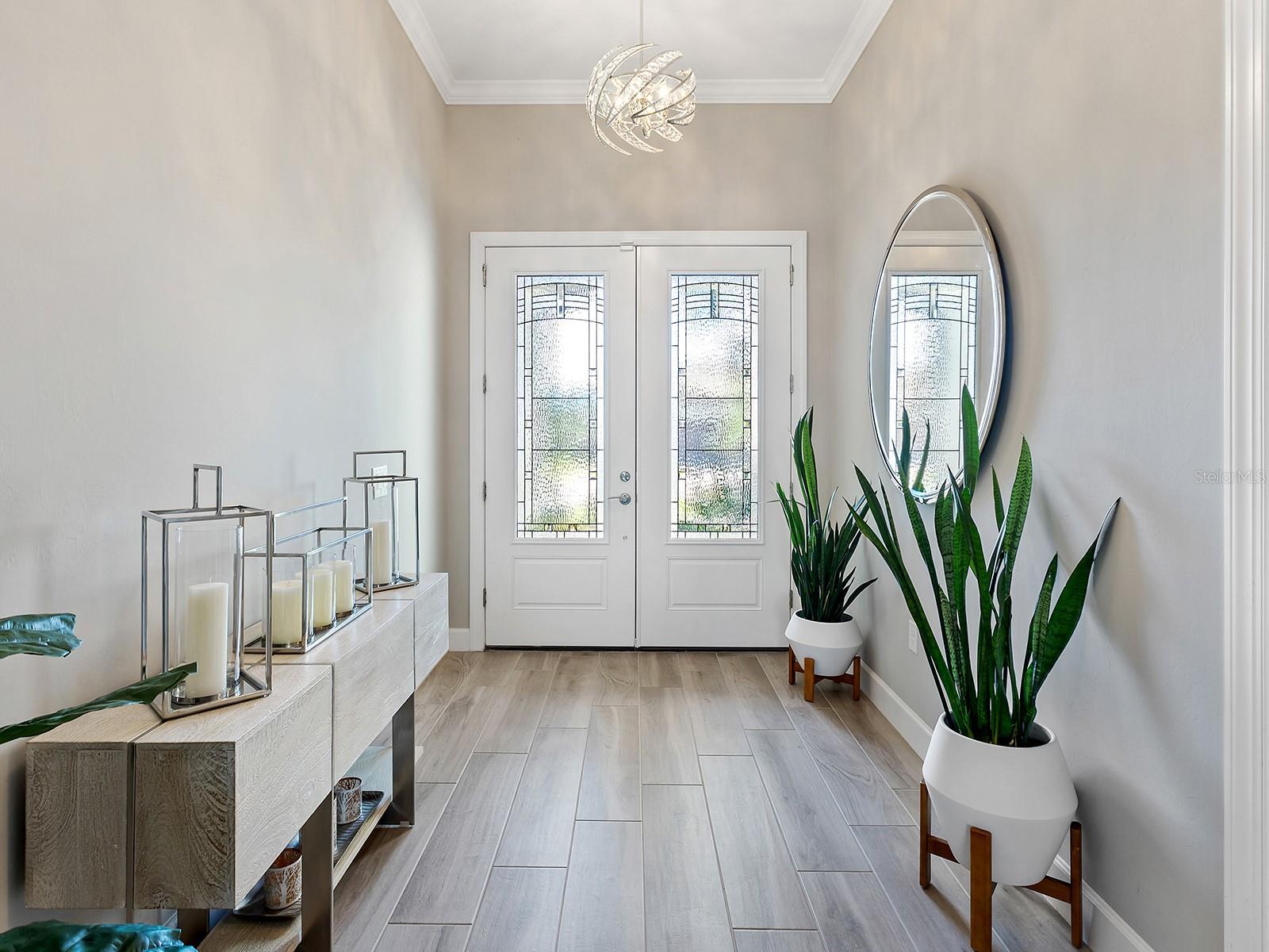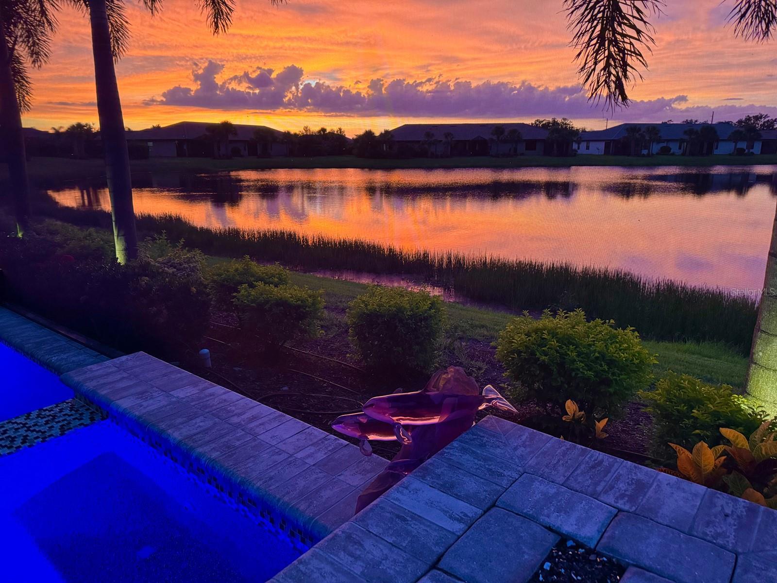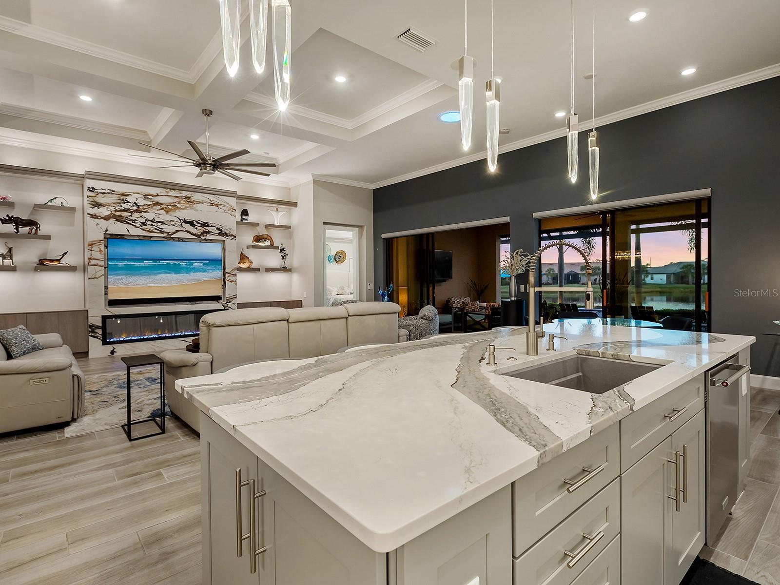 Filled to the brim with clever and beautiful upgrades, this partially furnished home on a prime lakefront lot is the crowning jewel of Del Webb, Lakewood Ranch's premier 55+ active adult community. Starting with this spacious single level floor plan, the owners made numerous upgrades enhancing the beauty; and then expanded on those upgrades throughout 2022 to 2025 improving the form, function and appearance of this residence even more. From the moment you enter you will be greeted by upscale front landscaping with rocks and lights, large lake views, wood-look porcelain plank flooring throughout, an open floor plan ideal for entertaining and custom upgrades in every room that make this home truly one of a kind. The central great room boasts a 2023 feature wall with custom built-in cabinetry and under-lit floating shelves, a full porcelain wall with 85” TV, built in sound system, electric fireplace and solar skylights, plus coffered ceiling and wall of sliding glass doors to the lanai. The opulent formal dining room features a show stopping custom dry bar added in 2023 with granite counters, crackle glass display cabinets, and custom handpainted backsplash, plus 2023 crystal chandelier. The chef’s kitchen shines with 2023 Calacatta quartz island counter, 2023 crystal pendants, custom two-tone cabinetry with additional lit upper glass displays, walk-in pantry, and adjacent dinette. The stainless-steel appliance suite includes 2021 induction cooktop (pre-plumbed for future gas cooktop if desired), dishwasher, 2023 Advantium built-in microwave and wall oven, and refrigerator. Through the sliding glass doors, take in the gorgeous lake views from the 2021 paver lanai with summer kitchen, pool and motorized hurricane screens. Enjoy meals alfresco from the outdoor kitchen with stainless steel grill, dual-drawer bar fridge and side burner. Lounge by the lakeside in your custom 2021 pool with large sunshelf, raised spa, fire bar, water features and surrounded by panoramic screen enclosure with additional integrated sunshade for privacy on the east side. Inside the primary bedroom is your private oasis with sunset lake views, large walk-in closet with custom shelving and spa-like bathroom with oversized walk-in shower. Guests will cherish the two guest bedrooms and two full guest bathrooms outfitted with luxe upgrades. When you’re ready for privacy, retreat to the study with dual walls of desks and storage. Also included in this impeccable residence is a laundry room with 2023 floor-to-ceiling storage cabinetry and large folding counter, along with an expanded 3-car garage with its own air conditioner and workshop space. Enjoy premium peace of mind with a 2023 Kohler whole-house GENERATOR and 2023 whole-house storm power and roller shades. Additional upgrades include blackout window treatments, 2023 gas pool heater and salt cell and 2023 upgraded front landscaping. This residence is ready for you to move in right away! Del Webb is a premier 55+ active adult, gated community with extensive resort-style amenities and social activities including an expansive clubhouse, restaurant, fitness center with classes, resort-style pool, lap pool and spa, outdoor and events areas, dog park, tennis and pickleball courts, social clubs and events, full-time lifestyle director and more! Lakewood Ranch is the top multi-generational community in the country for 8 years in a row with plentiful shopping, dining, parks and nearby beaches.
