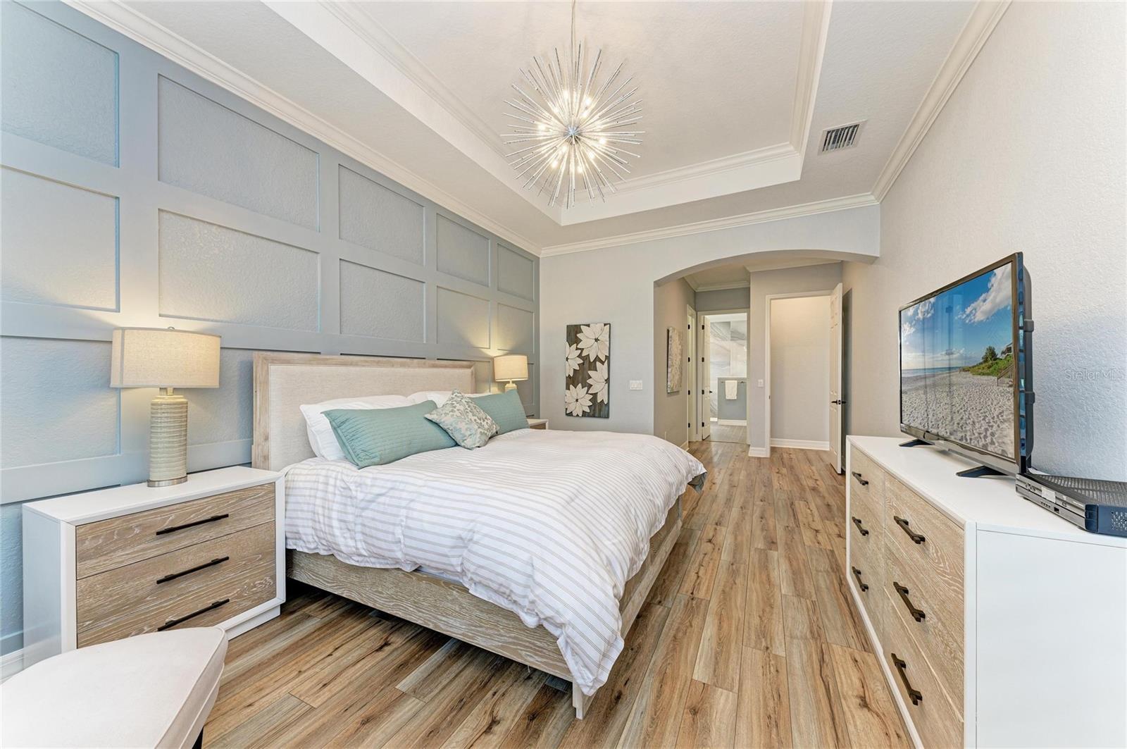- Ceiling Fans(s), Coffered Ceiling(s), Crown Molding, Dry Bar, Eat-in Kitchen, Kitchen/Family Room Combo, Open Floorplan, Solid Wood Cabinets, Stone Counters, Thermostat, Tray Ceiling(s), Walk-In Closet(s), Window Treatments